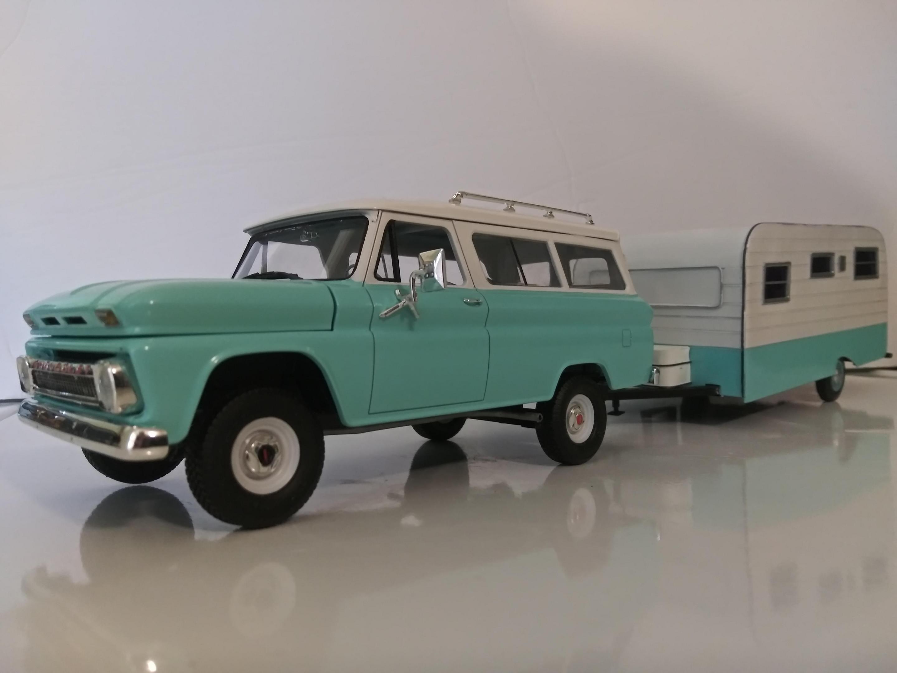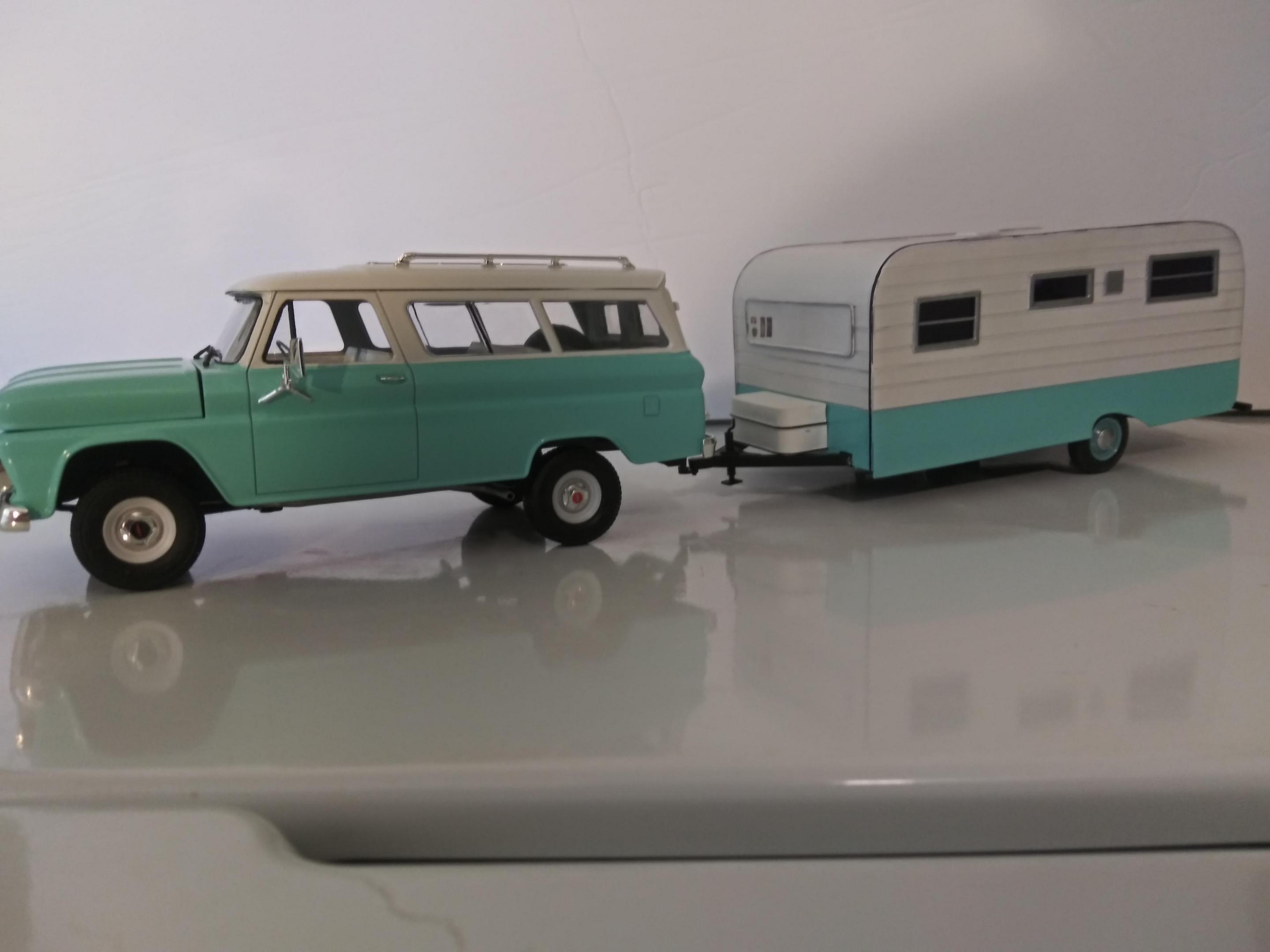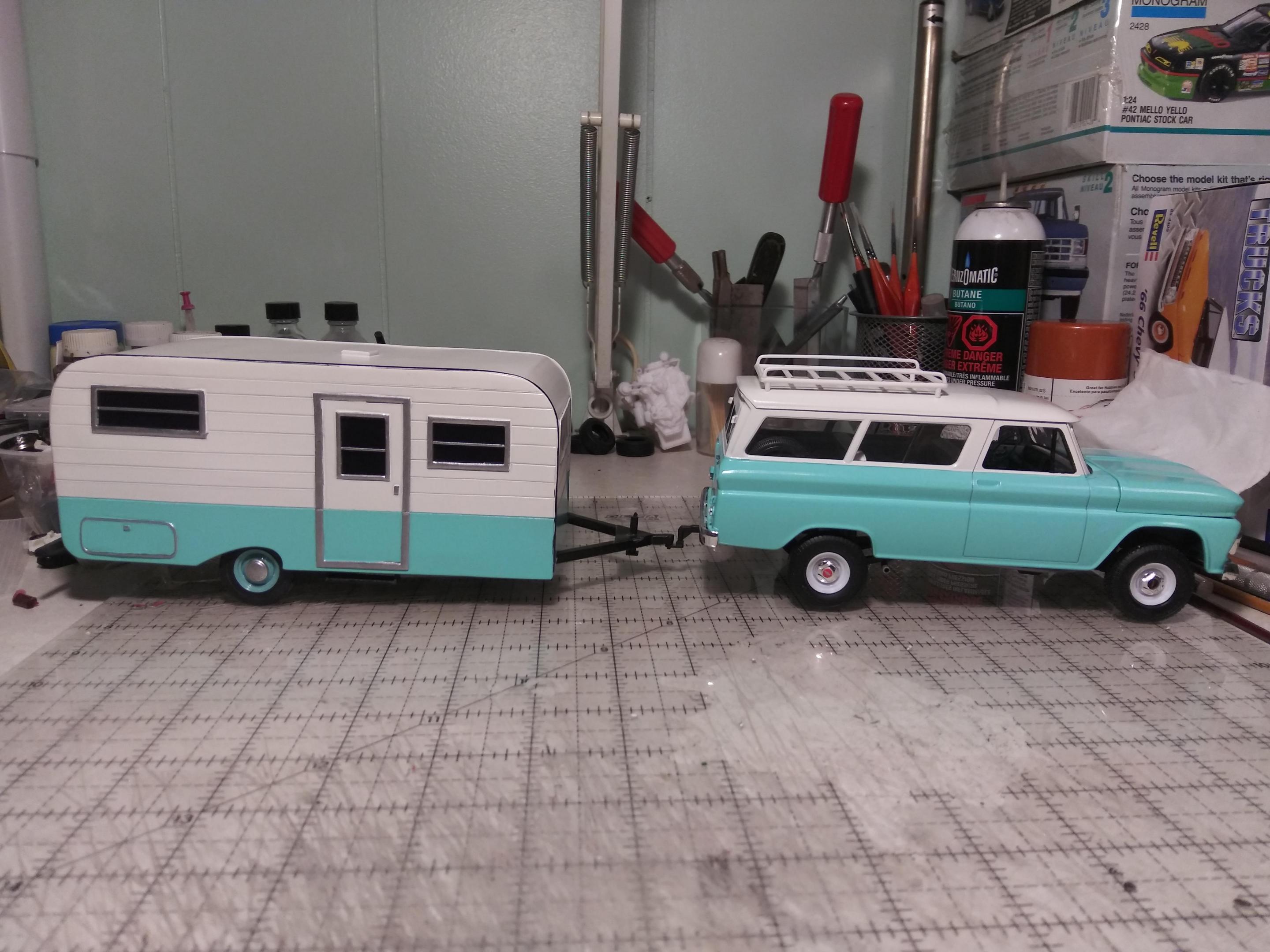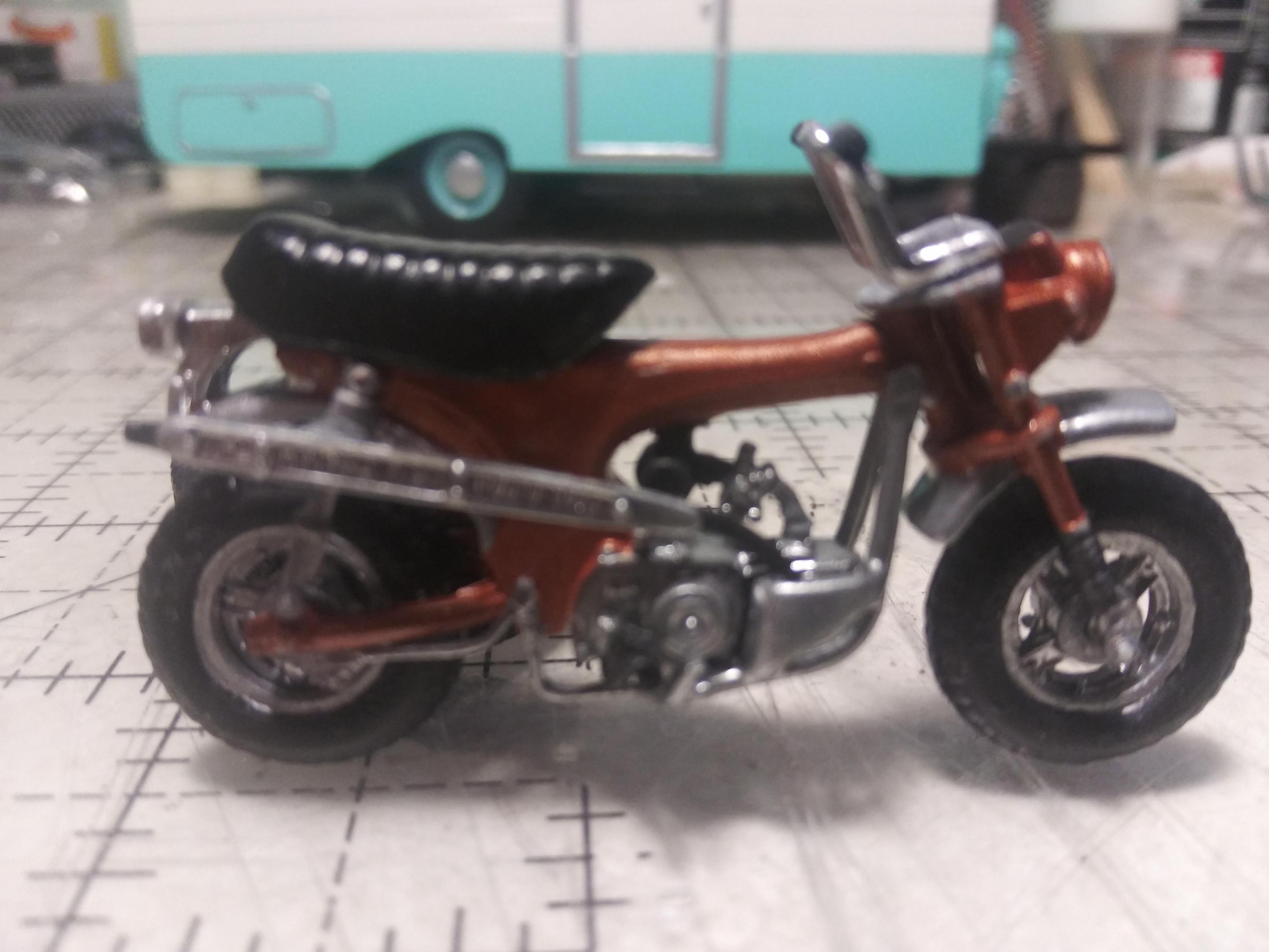 So started this over a year ago, just kinda hit a wall, so put it back in the box. Got looking at it a couple weeks ago, and thought lets finish it. Almost there. Got the Honda trail 70 from another member here, (Thanks). Some of you may remember the Burban and the scratch built camper. Getter done !! -