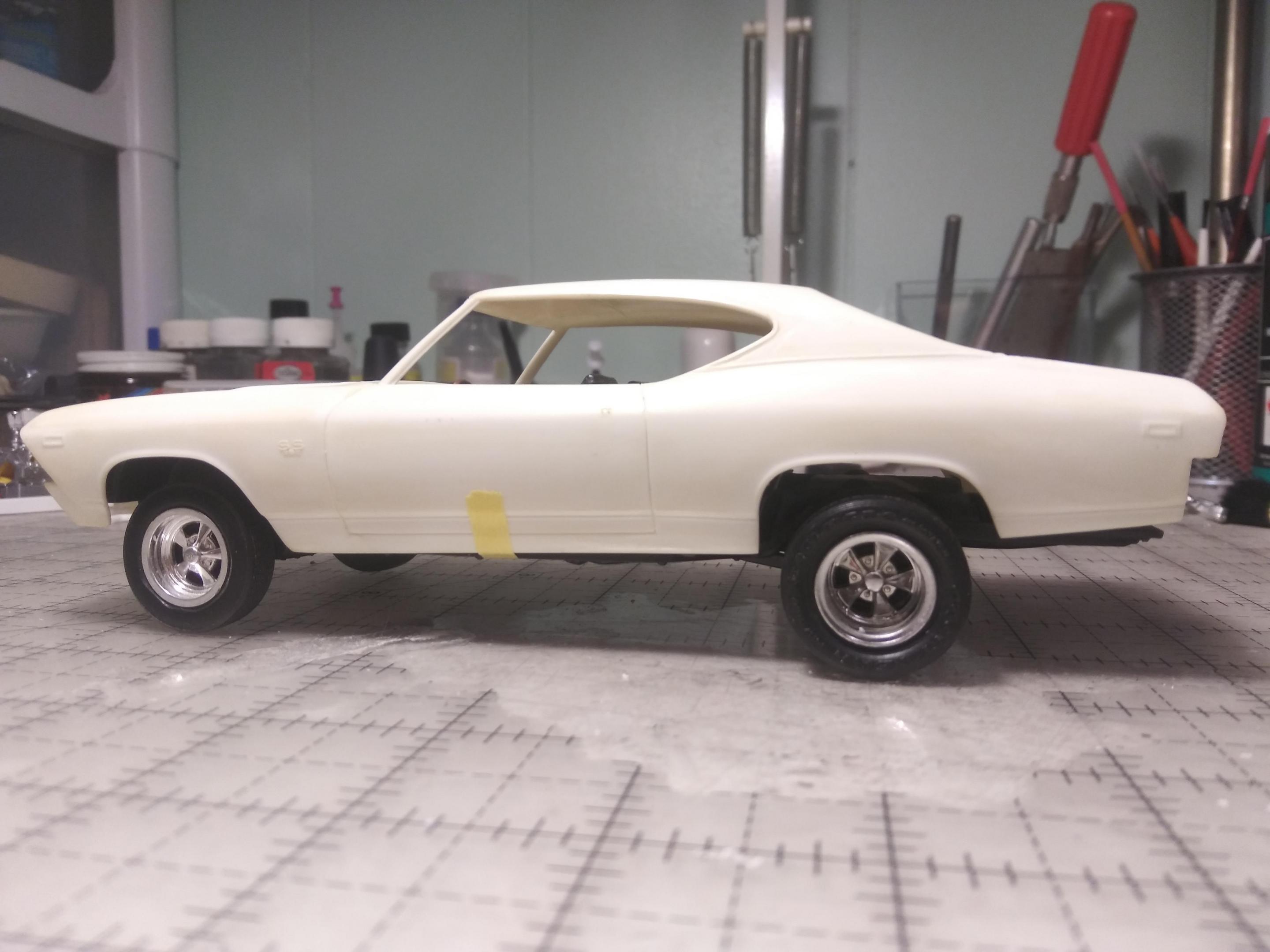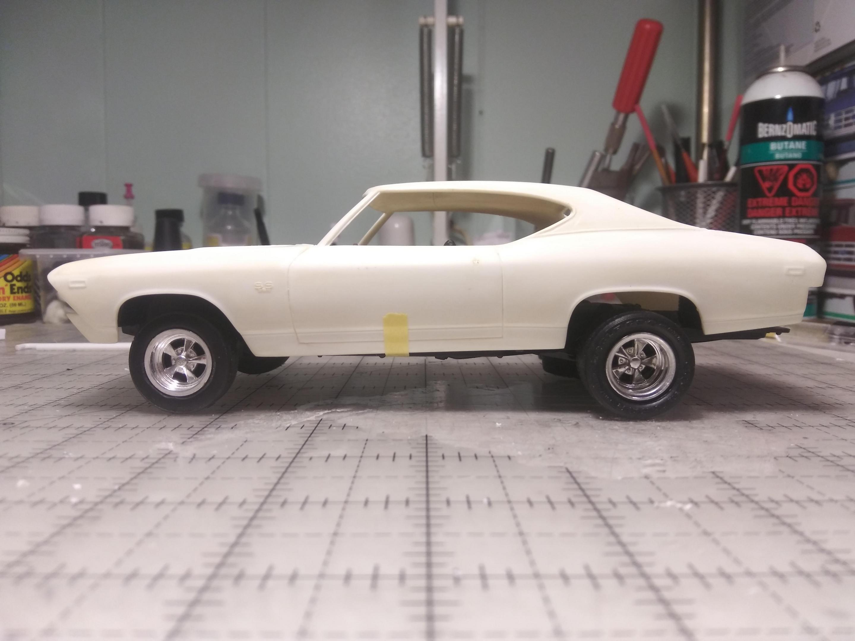 Got the 69 amt Chevelle. Have had to do some body work on the rear fenders to get the taillight to fit rite. Going for that non straight axle high front. Widened the rear wheels and added moldings for a vinyl top. Also thinking headers and side pipes. Not sure on the color yet. May put the blown olds in it . Comments?
