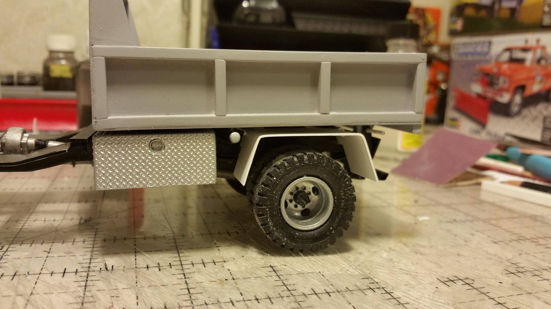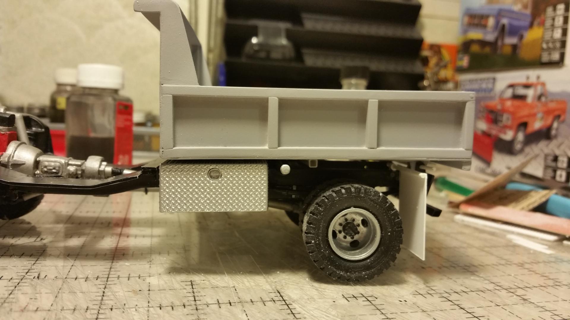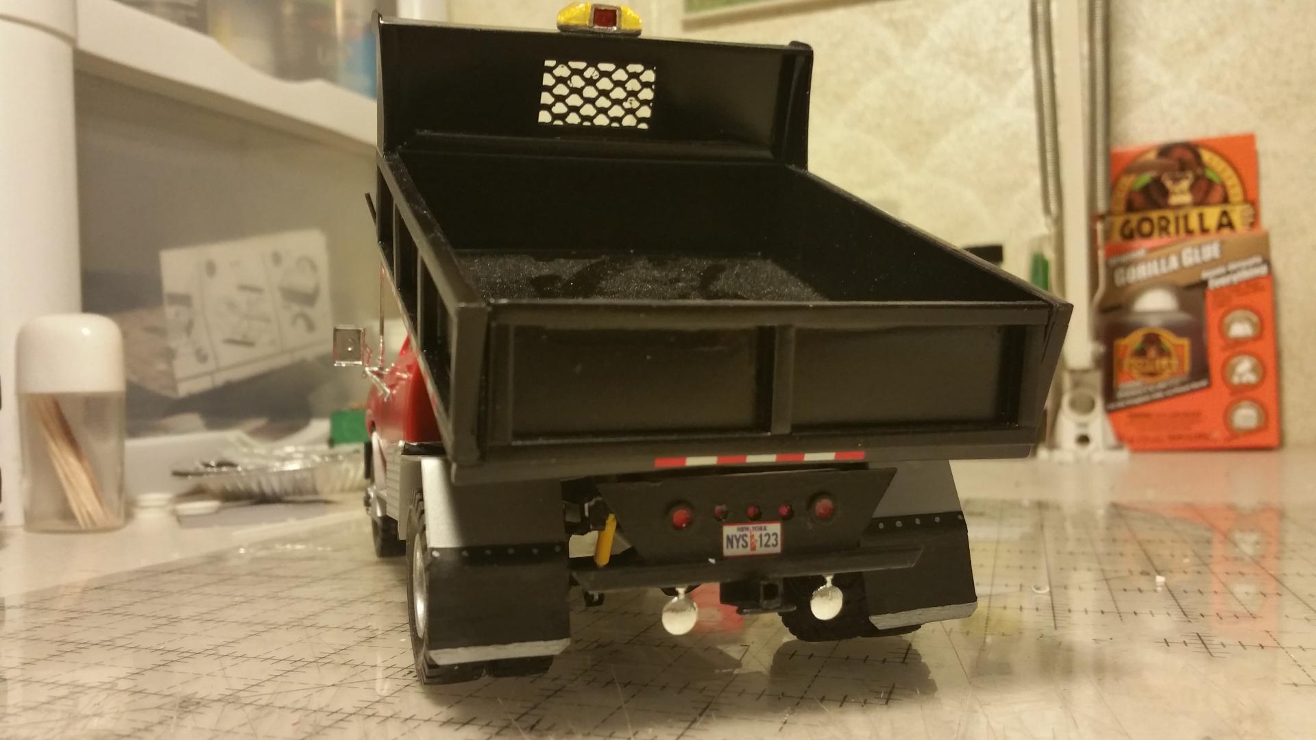 Done with he dump truck for now. made another bumper for it. I thought the other one looked to bulky. Posting the rest of pics in under glass. Going to add a salt spreader eventually as I have one, another member was kind enough to offer up. Thanks for all of the input throughout the build. I will post pics of my next build FORD f250 extended cab 4x4 with a powerstroke. The mirrors were from the parts box.