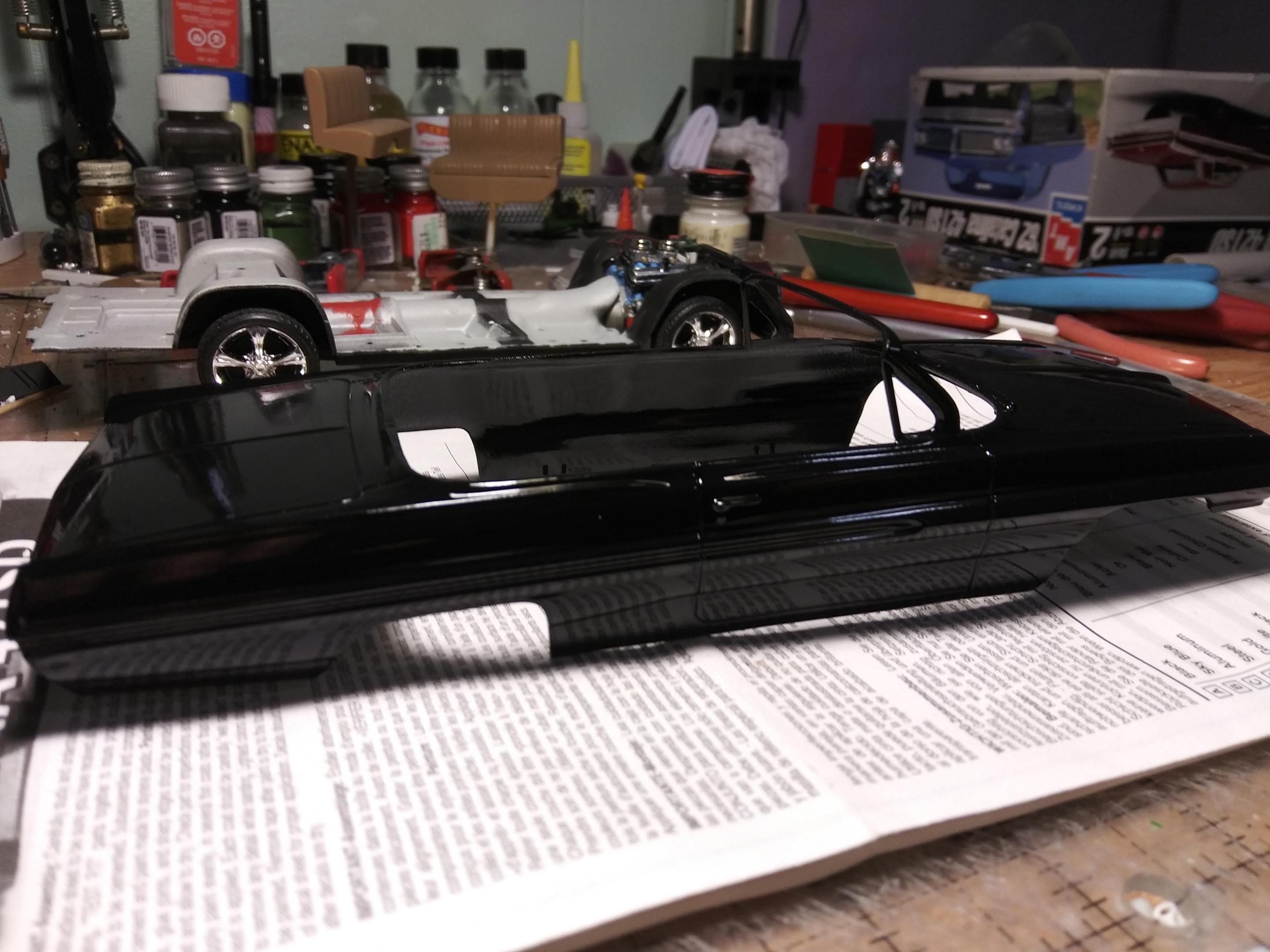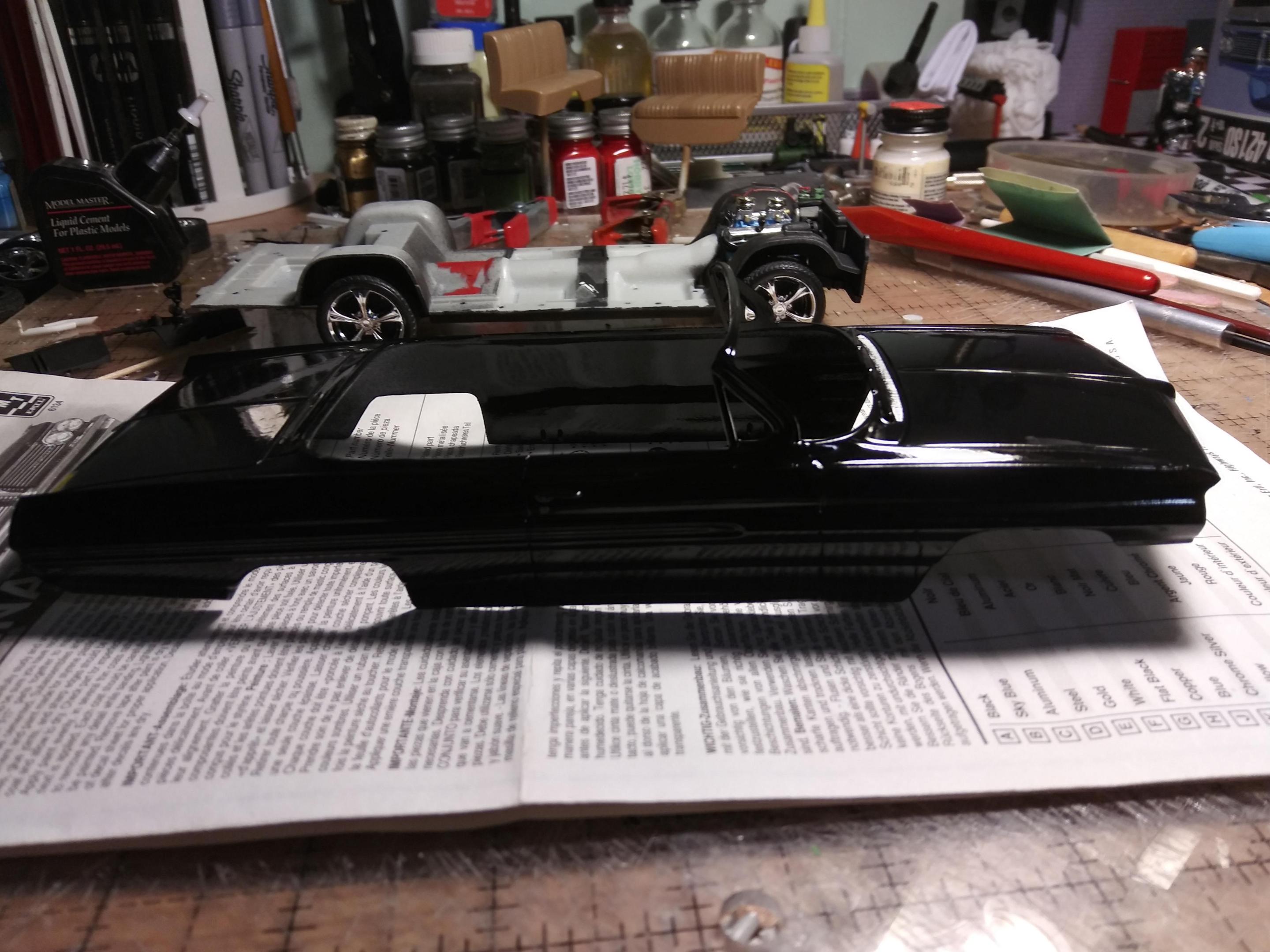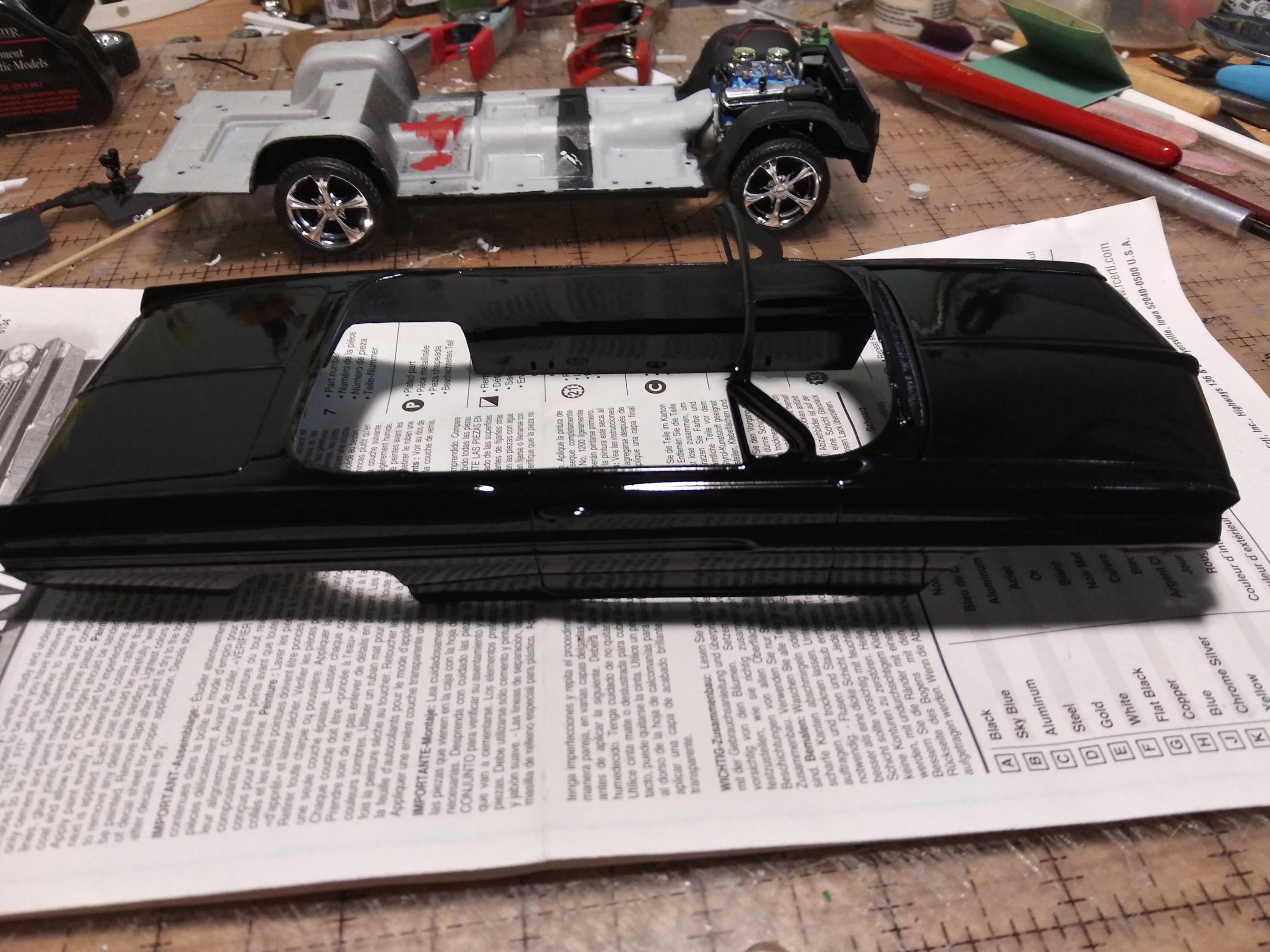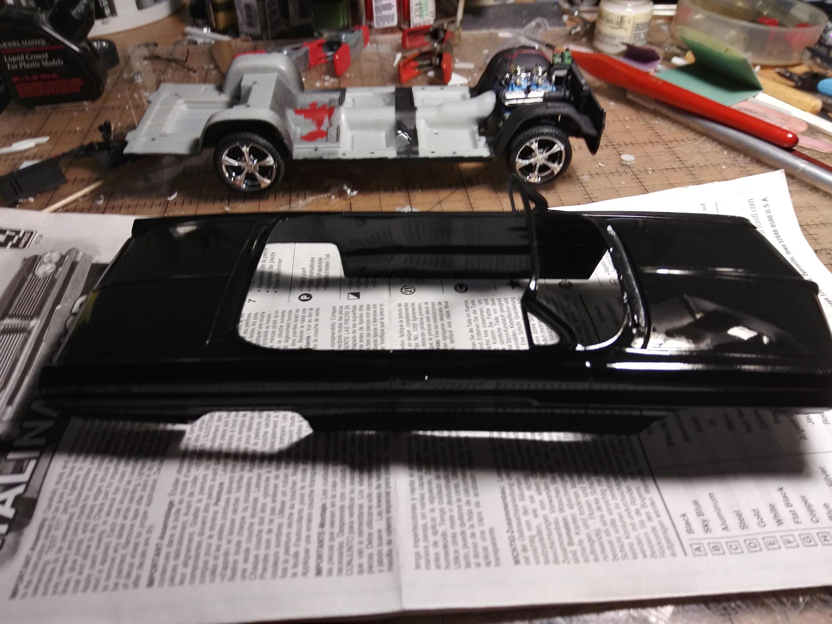 Progress so far. Engine and chassis are mated. Interior painted. Still have to do some finishing touches to the dash. Body painted. Not to pat myself on the back but, by far the nicest black paint job I have ever done. No clear cote, Straight rustoleum gloss black spray over rustoleum white primer. Now getting really excited about finishing it. Can't wait to see it with all the chrome done. Thanks for looking.