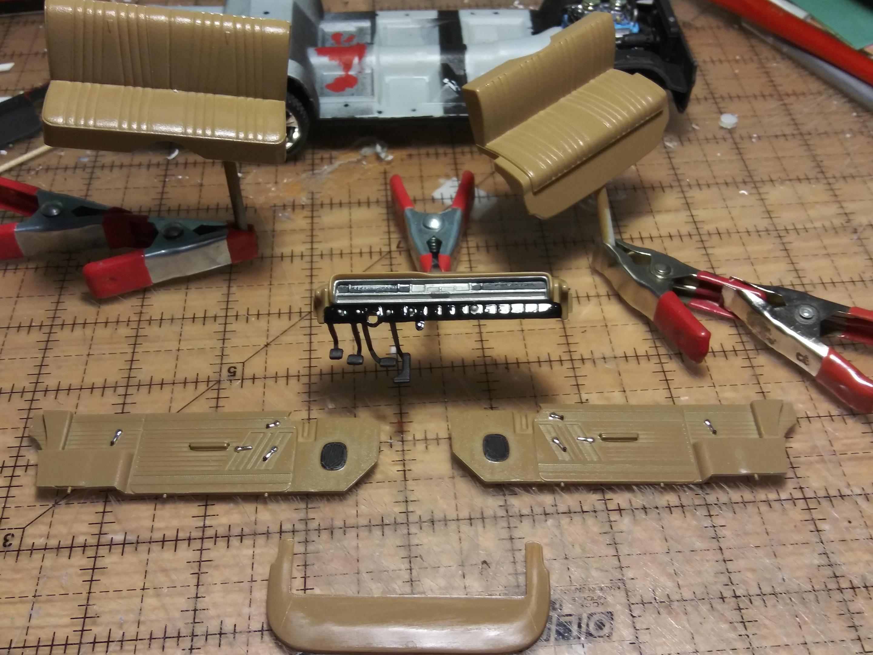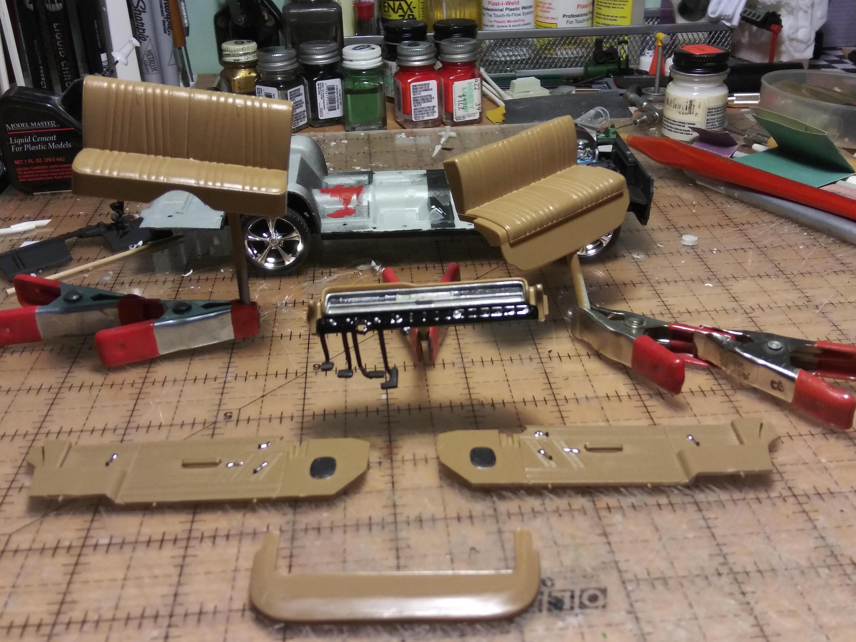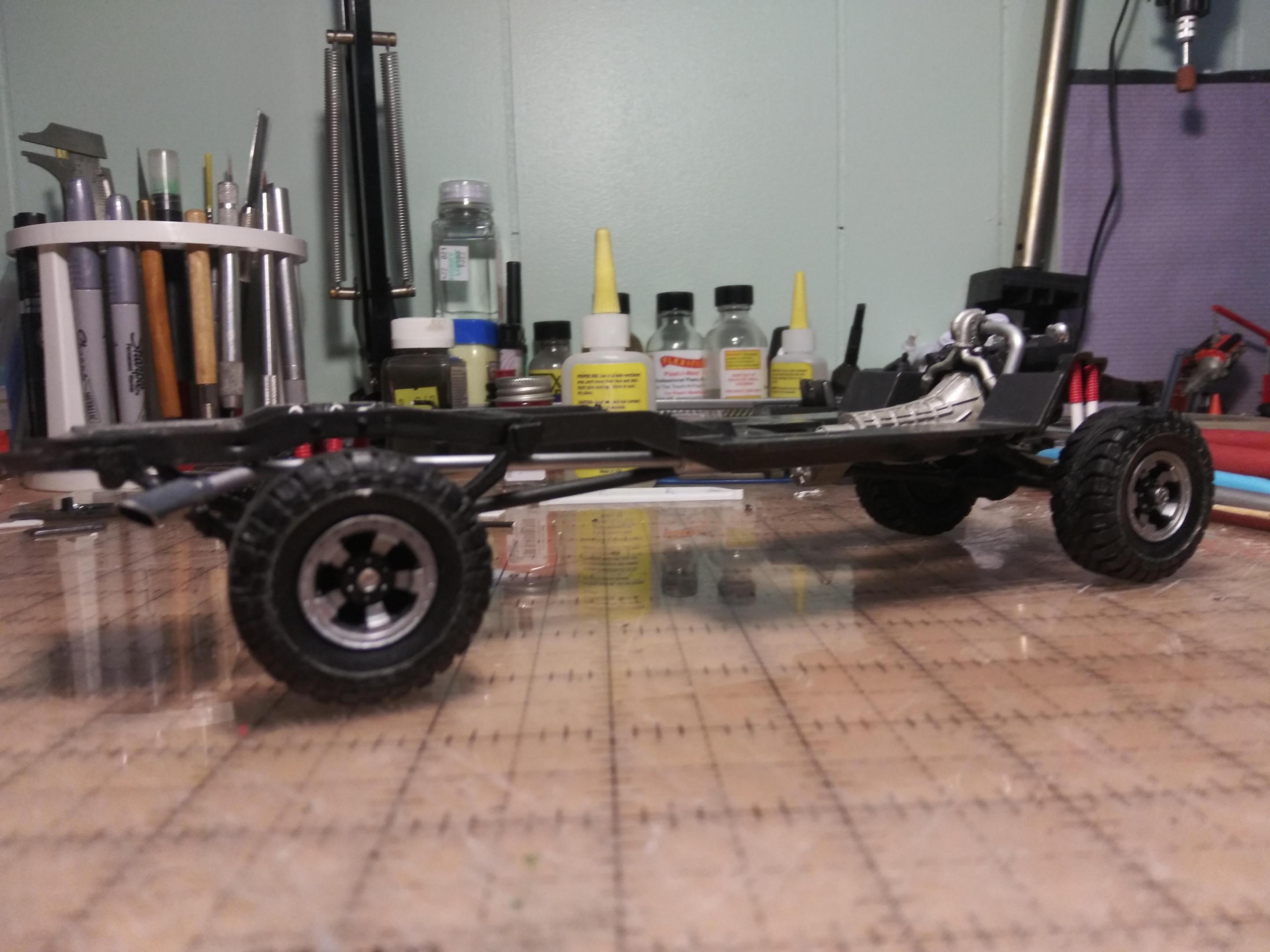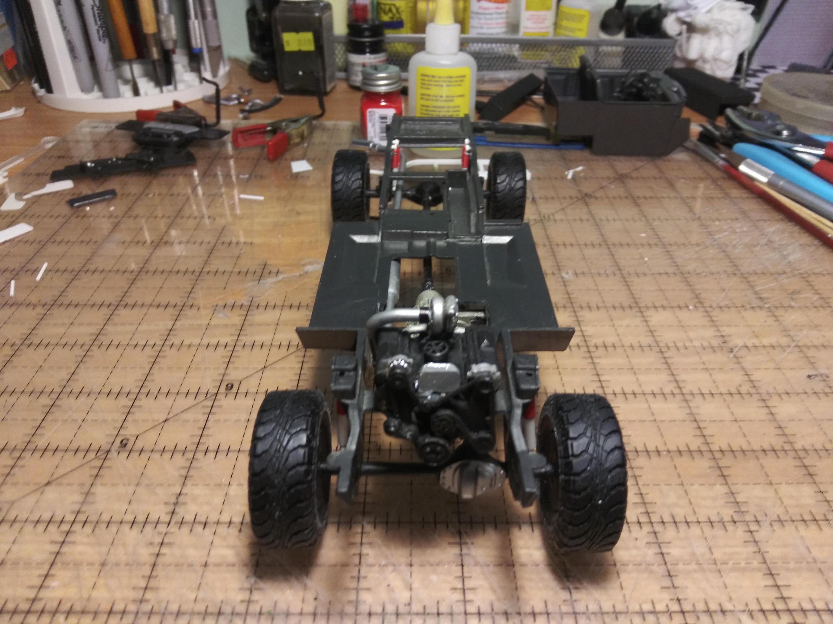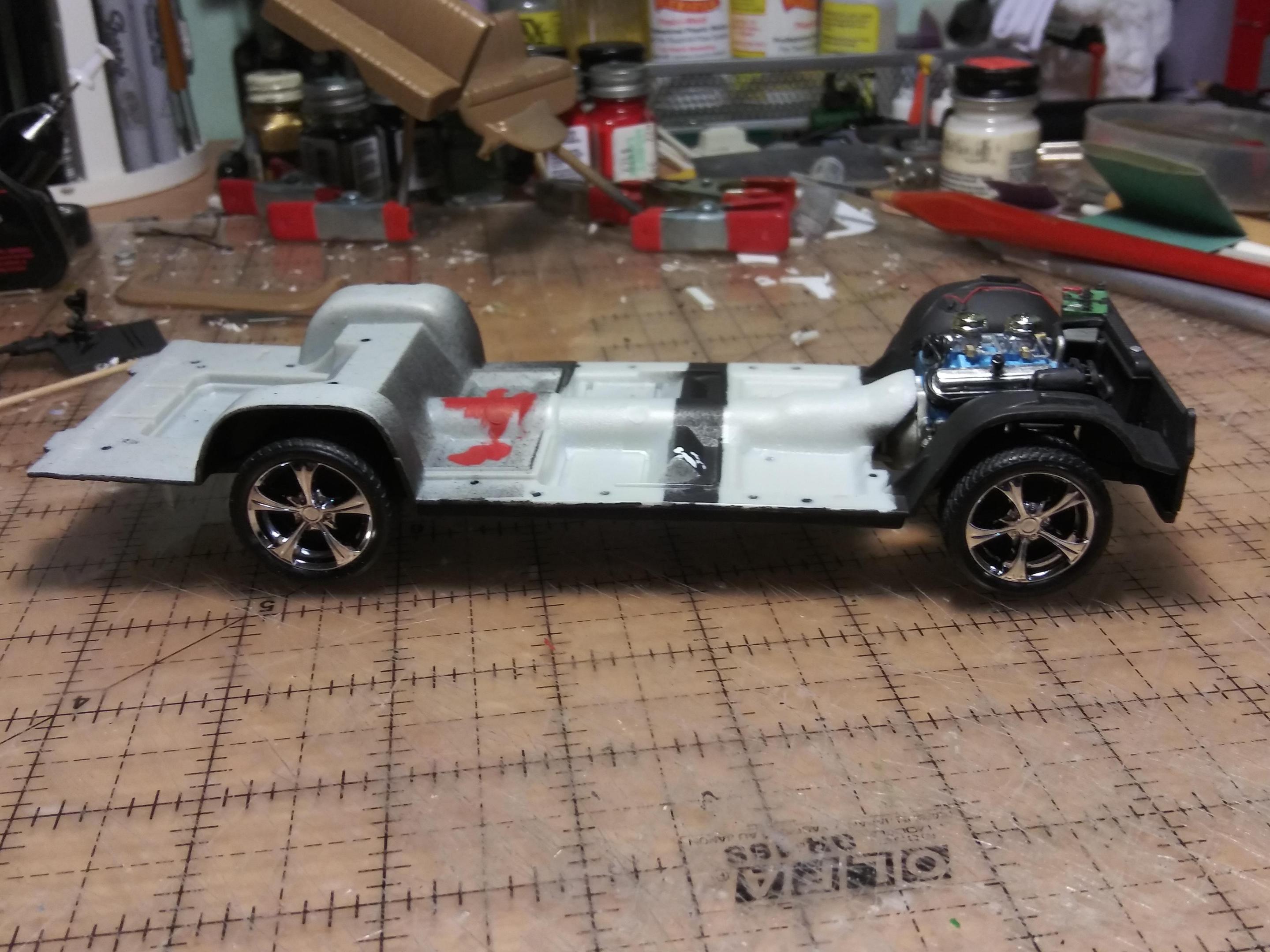 Progress so far. Engine and chassis are mated. Interior painted. Still have to do some finishing touches to the dash. Body painted. Not to pat myself on the back but, by far the nicest black paint job I have ever done. No clear cote, Straight rustoleum gloss black spray over rustoleum white primer. Now getting really excited about finishing it. Can't wait to see it with all the chrome done. Thanks for looking.