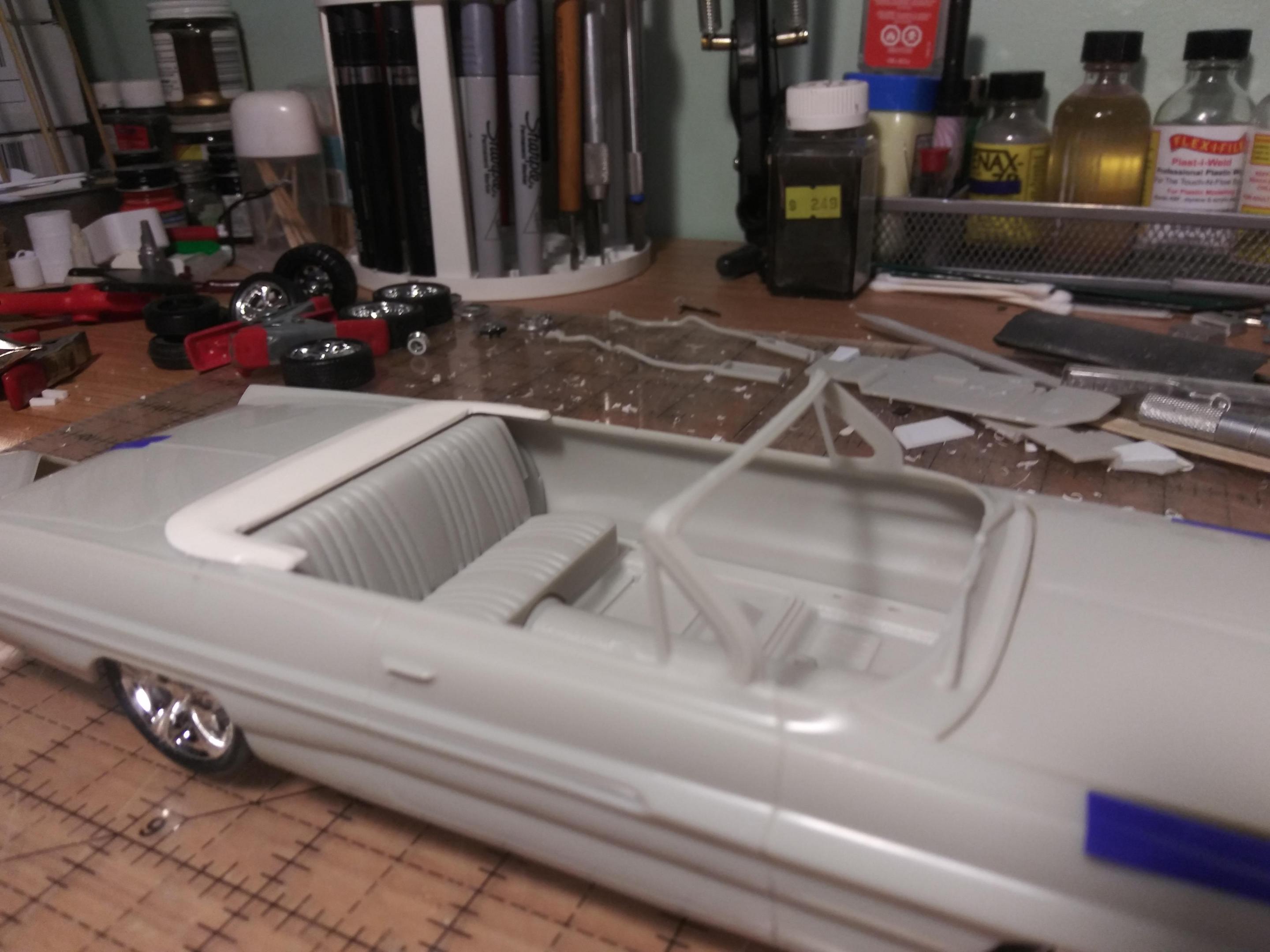 Got started on the 62 Catalina. Roof is cut off and windshield frame shaped. Convertible boot is from a 65 gto just had to reshape the corners. made some filler panels by the ends of the back seat. Dropped the rearend. Wheels and tires are from 70 Firebird. Thanks for lookin, comments welcomed. -