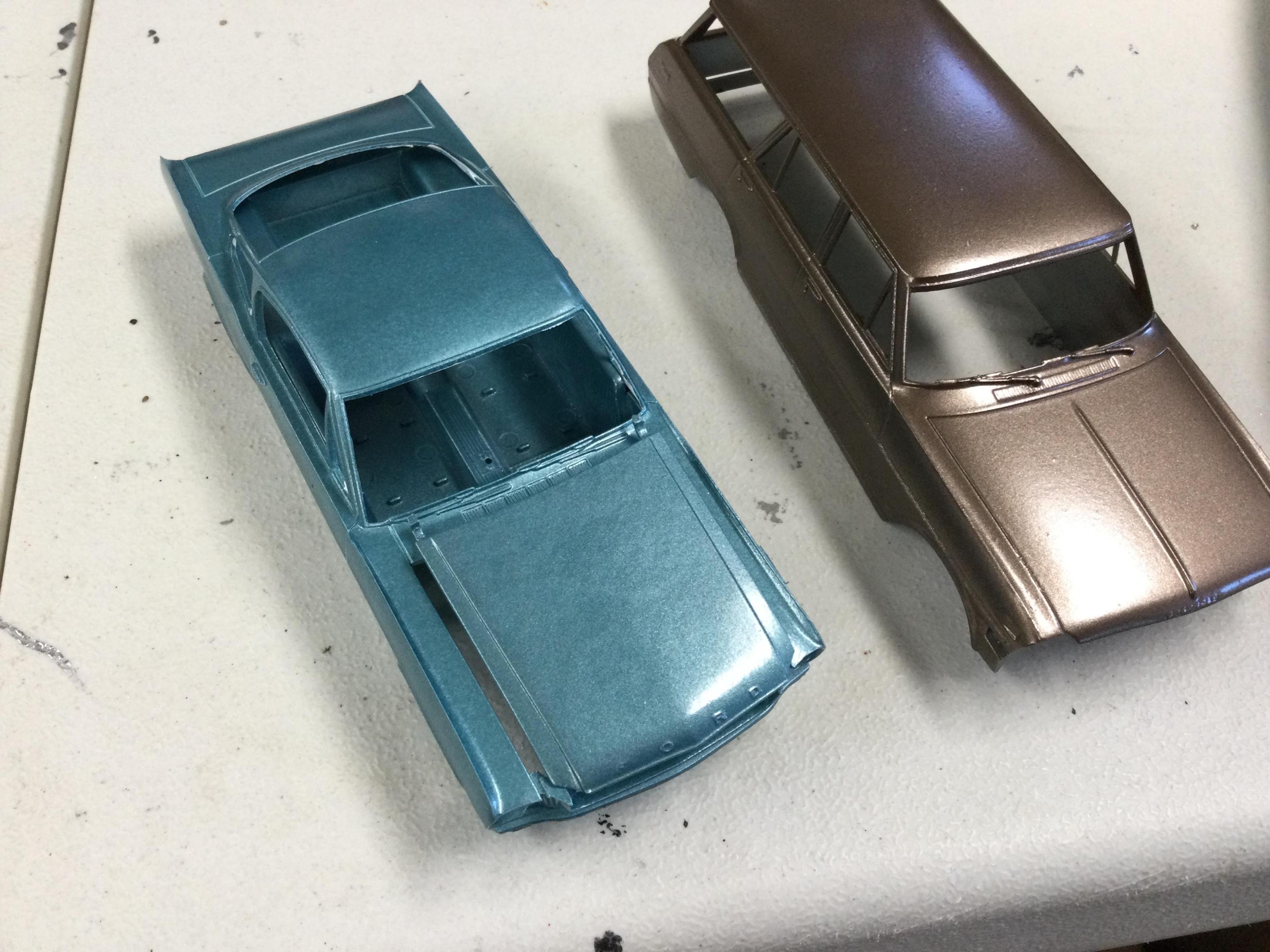 The Saga continues. 3 light coats of primer followed by a slightly heavier coat. 15 minutes apart. All 3 looked great. Though I wasn’t use to seeing the primed bodies looking like they had talcum powder on them rather than how they looked with the primer I used before. That looked like primer on a real car. A little sheen to them.