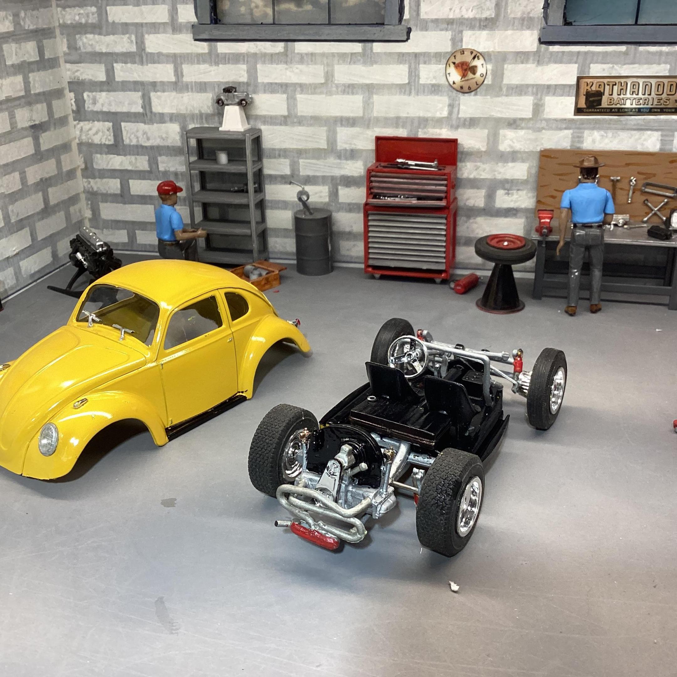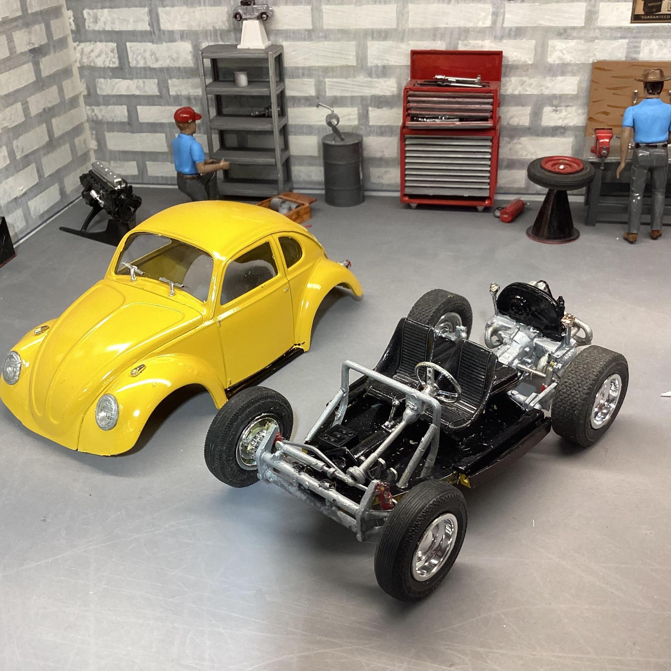 Broke the tabs on the hood so it’s glued shut. I was going to put the black stripes on the hood like the photo on the box. But they were not in the kit. Just the Coke stuff. Cute enough. Red cherry bomb muffler. Concocted my own exhaust seeing the hood was going to be glued. I didn’t glue the body to the pan because then you could lift the body to see the rest of the Bug. It came out ok.