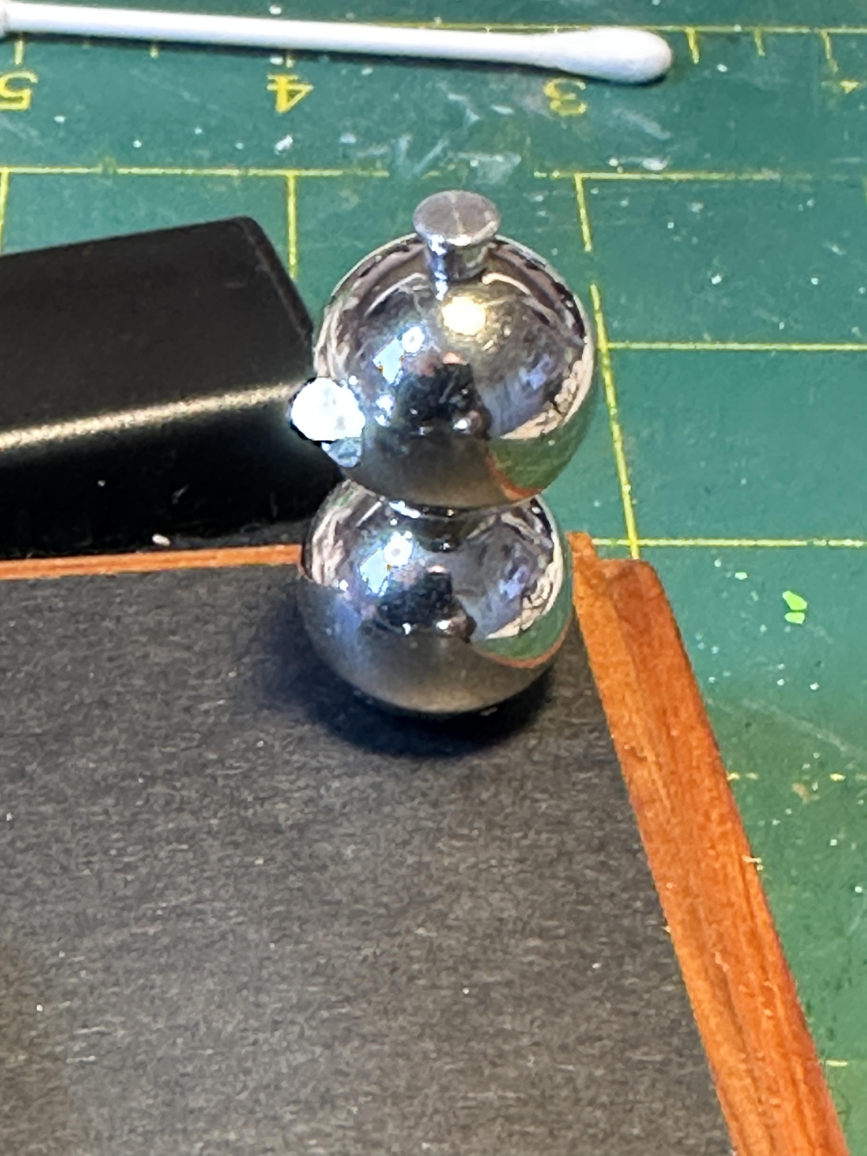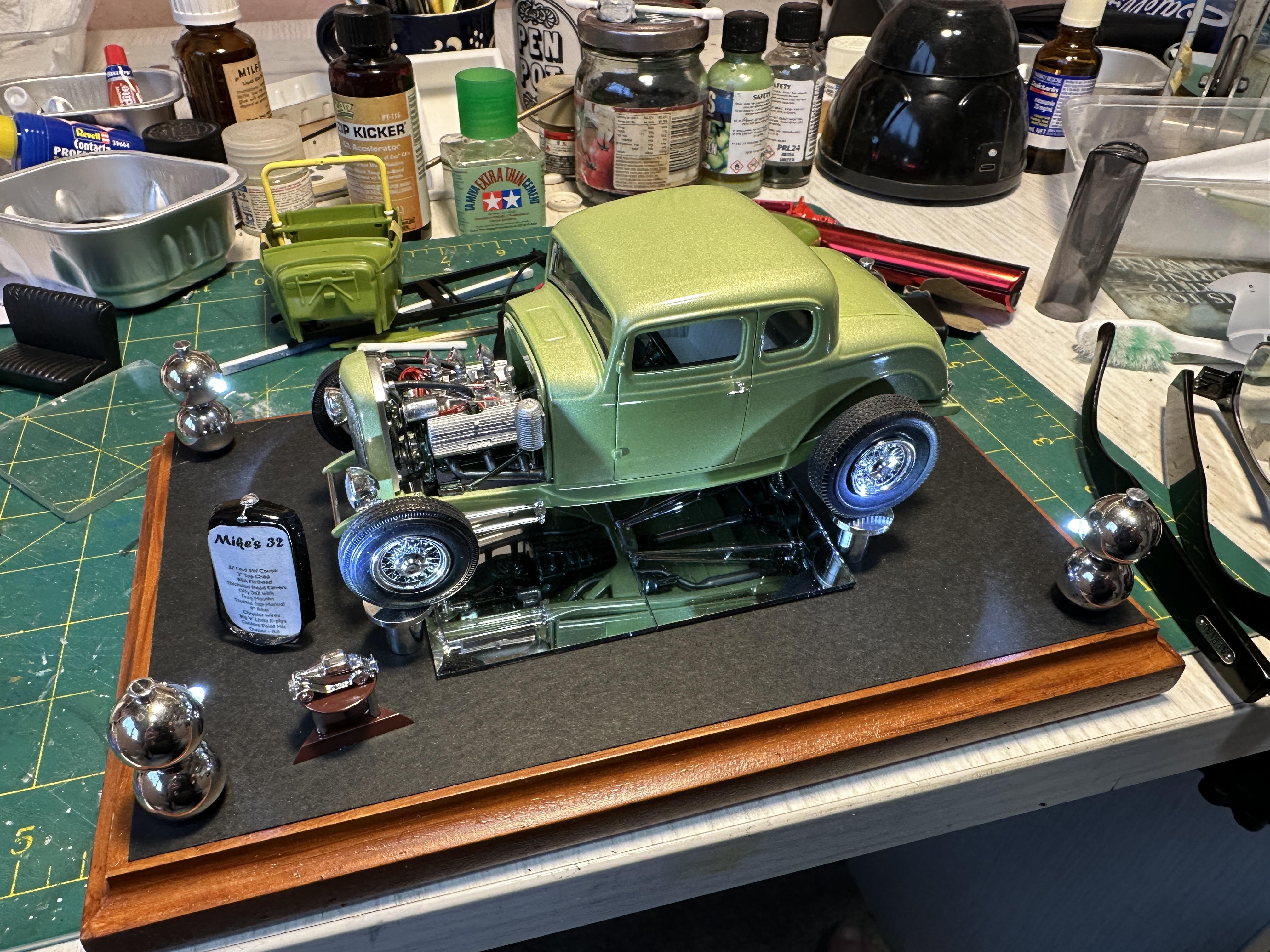 Indeed. Got those pesky little details done over the weekend. Headlights, tail lights, plate, radiator cap, door handles and gas cap all done. I could not get the radiator brace in as it clashed with the frog mouths - oh darn! It is now in the cabinet and I will get around to posting in Under Glass -sometime Thanks for bearing with me through this build but I must say I have enjoyed it and I did it in record time - for me anyway