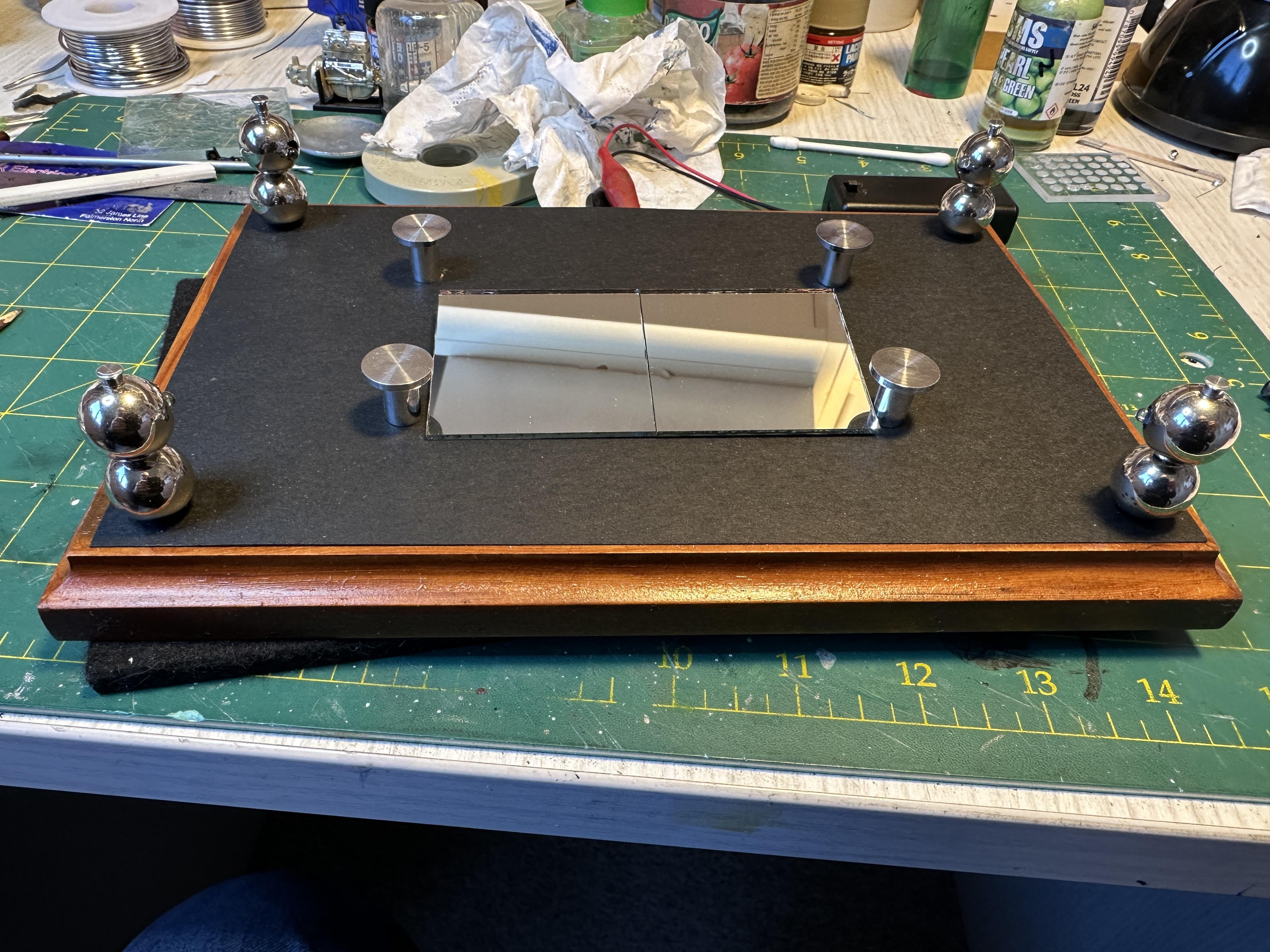 The light housings worked fine so I made up 3 more. To fill the through holes in the beads I turned up a plug that I thought I could use as a bollard for a rope if I can get the kinks out of the string I bought for the job The mirror needed to be angled up a tad for best viewing so a carefully cut out a wedge with my table saw. And I mean carefully as working with small suff and very fast and sharp rotating parts are scary. To make it safe I glued up some blocks of customwood and cut what I needed from the block. I then painted the edges black. The base is customwood again that I made slightly larger than my mockup piece. I shaped the edges with a router and shaped cutter. All was then sanded and sealed with clear lacquer from a rattle can. I applied woodgrain effect to the edges with oil paints. This was moderately successful. The whole lot was sealed with clear. The black is card from an A4 pack of black card from the $2 shop cut to size and holes to suit the drillings for the light fitting and the wheel stands. The wheel stands are some ally bar I turned down to a flat headed mushroom shape so that I can use the base for a number of different models although this is being made for a specific model. The wheel stand positions were moved around to suit the gap required by the mirrors This pix shows it all assembled The LED wiring on the under side is via slots routed into the base. I use two short lengths of bronze filler wire to make connection point for the 3V battery pack and to have something to solder the LED wires to. The LED wires are some cores from some alarm multi-core cable I had to hand And the money shot. I found a small trophy when looking for parts for another build in one of the AMT 32 kits. The chrome trophy is a 32 5W coupe - just perfect. The info board is a 32 grill shell that I found in the parts dept that was already painted so I polished it up a tad and replaced the chrome bars with a photo-reduced sign board that I whipped up in PowerPoint, photographed and imported it back into PP and then shrunk to size. I used the chrome grill insert as a pattern for cutting to size. It was than sealed with clear lacquer Thanks for looking