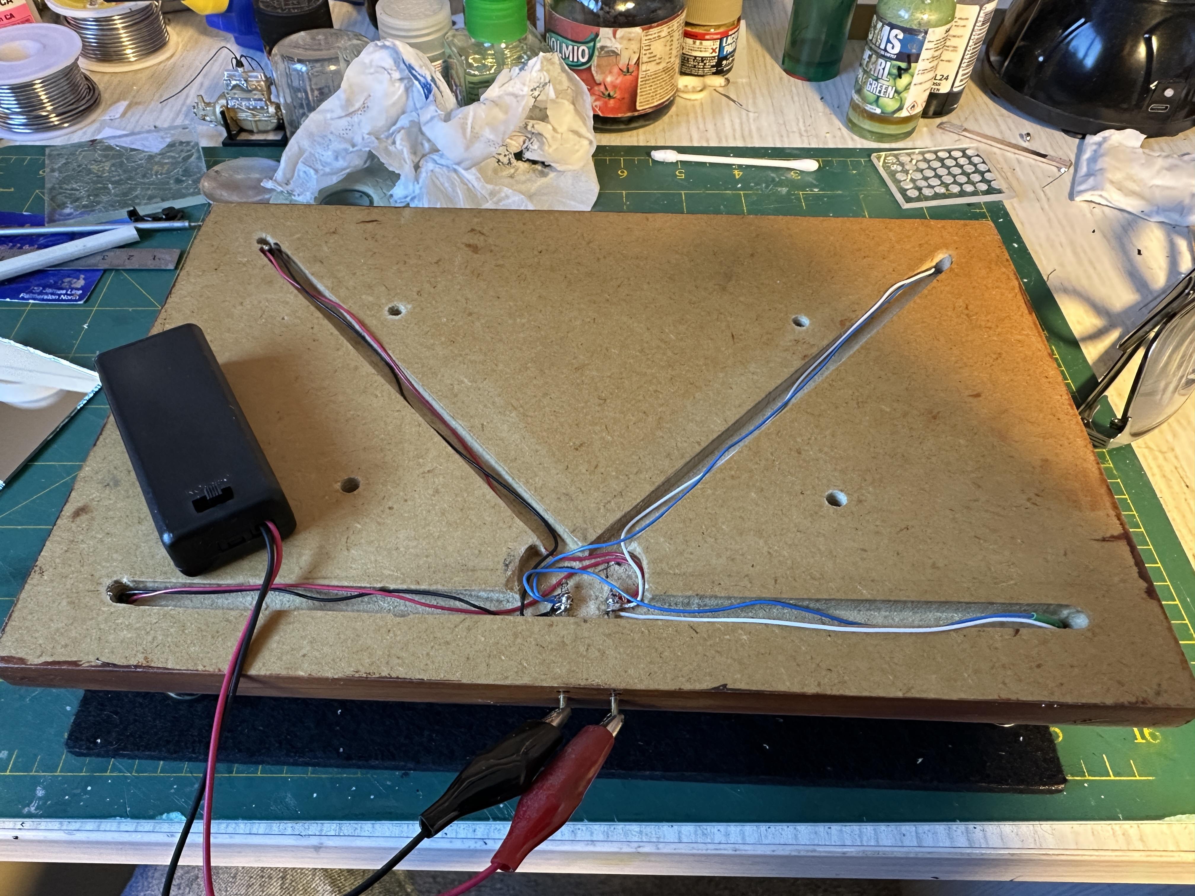 I have a number of early hot rod kits that have had extensive chassis work done to them and I want to show off my handy work. I had a good think of what I wanted. - A black base - LED spot lights - preferably hidden - Pedestals to lift car off the floor a bit - Mirrors to show off all the underside bling - Some sort of perimeter or barrier to keep the public back I did a quick sketch of what I wanted and armed with my fertile imagination went to the nearest $2 emporium. A few bucks lighter I can back with a pack of black card, a bag of 16mm chrome balls, a pack of small mirrors and some fancy string I also went to Jaycar and picked up some 3mm 15000cmd white LEDS - cheaper by the 10 - and an AAA cell battery box with a switch I dilled out the chrome balls to fit the LEDS into and double stacked these and connected with some styrene tube I have. I set it up on a bit of customwood with a bit of blue card to check the concept. I mocked up some mirrors and found I need to have these on an angle to get the best from them. The nuts are to mock up display height The chassis is a 32 Ford junker from the parts department I powered the LED up and found it was too close to the car for maximum effect so I made the card larger - sorry no pix of that step The height of the nuts was perfect so I am about to machine some pedestals from ally bar that I will polish. And continue with 3 more chrome ball stacks