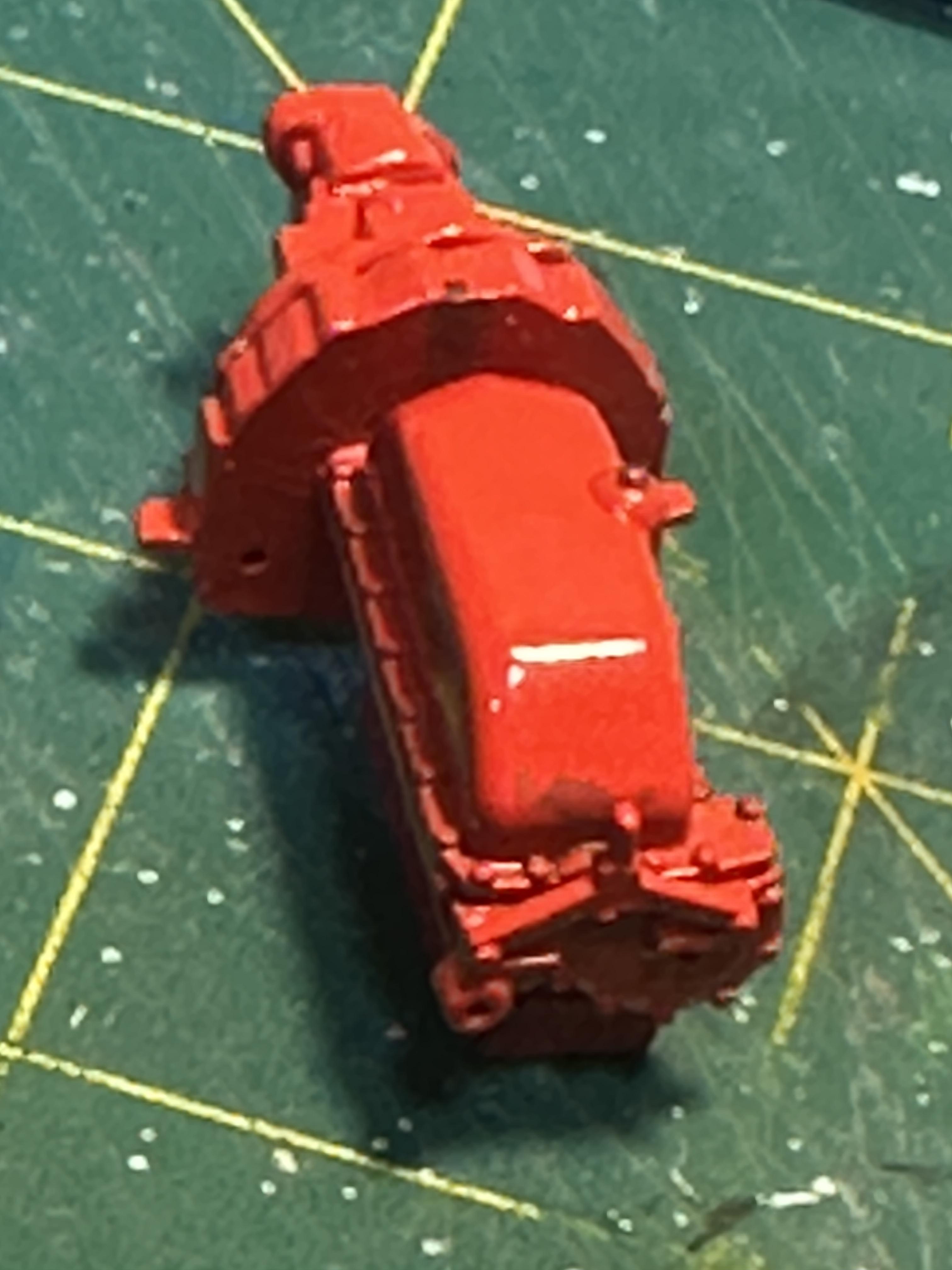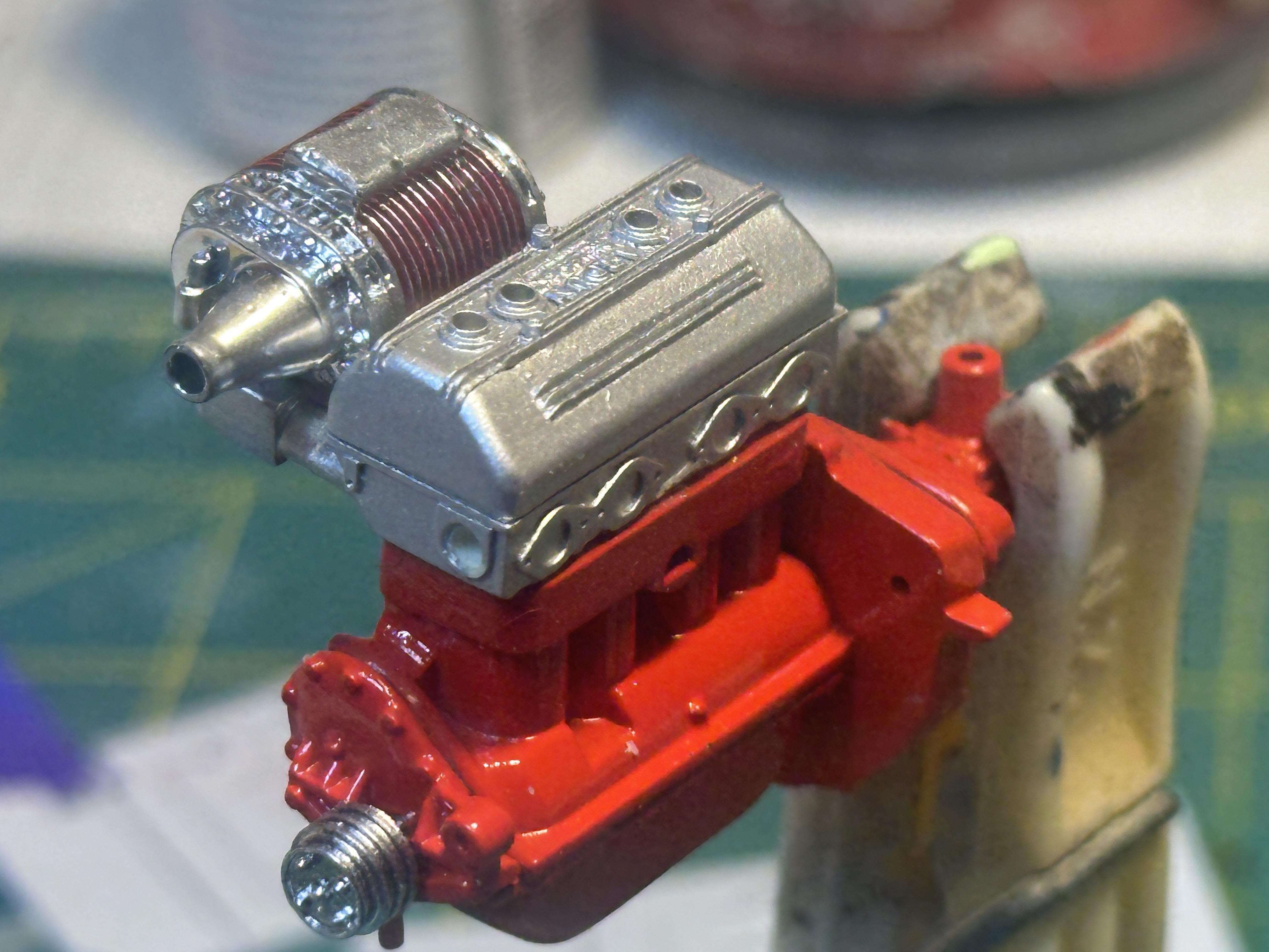 A little bit of progress on the banger. I have turned down the rear wheels to fit the slicks - sorry no pix. I have cleaned up the Revell motor/gearbox and painted them Tamiya Pure red that I will be using on the drive train too. The head is SMS aluminium The head on siting the wrong way around as the valve gear on A motors is on the RH side of the motor so the push rods for the Ardun will need to be on that side as well along with the intake. I have also been doing prep on the chassis, guards and body. The chassis was in the paint shop when this was taken Thanks for looking