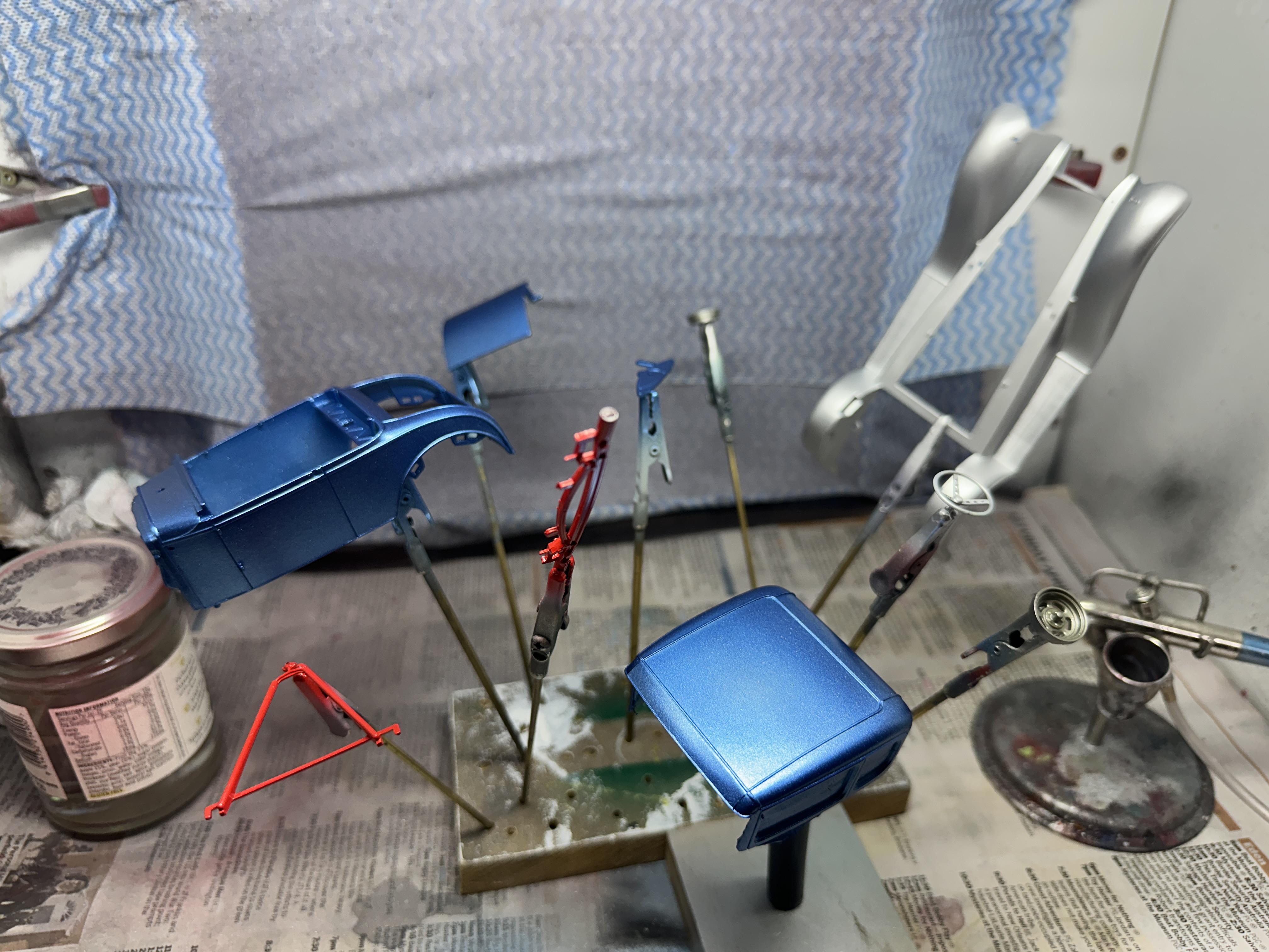 Been away again - it was a long weekend last weekend here in NZ so modelling has taken a back seat But - I have got the body prep done and some colour on before heading off. And clear this week Paint is ancient from LMG given to me ages ago so thought I would give it a go. I was very thick and so spent a bit of time reviving it and thinning enough to airbrush I am using the blue as main body colour and SMS Super Silver on the guards. A typical 50/60's colour combo. I just did not want the hassle of black guards. I used the silver as a base coat under the blue for two reasons - a sealer coat for the green body and primer and as a base coat for the blue. And the result. The clear will get a sand back and another coat before I hit it with decals Thanks for looking