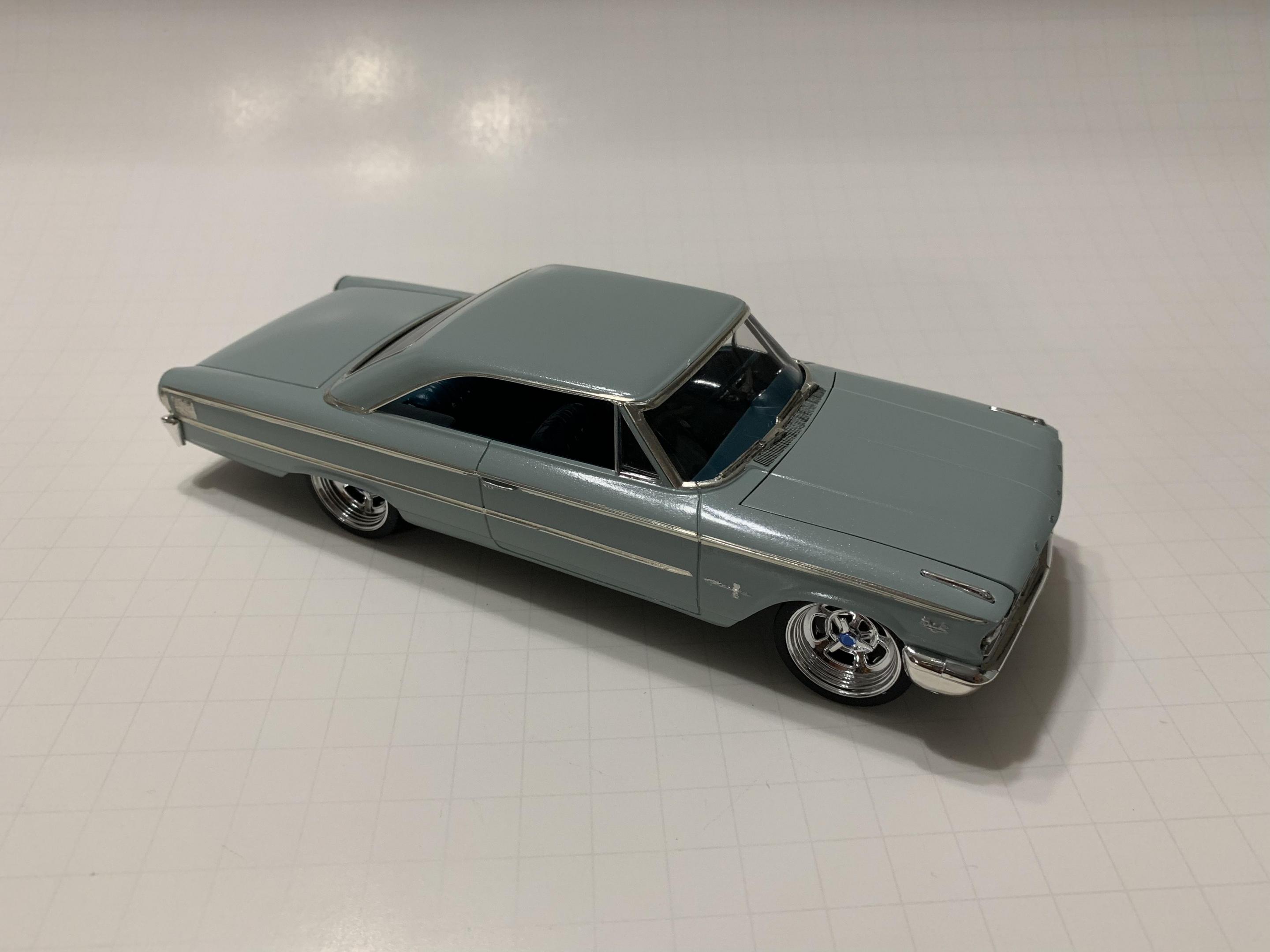 To expand on what Snake said; gloss clear, wet sand and polish will make her shine. Testors Wet Look clear and Model Master work great over Tamiya paints. A word of caution, though, I’ve never had any success spraying Tamiya products over Model Master products. The following builds were all Tamiya AS (dull) lacquers with Testors Wet Look clear. The Galaxie and Imperial got a coat of Tamiya Pearl Clear between the paint and gloss clear.