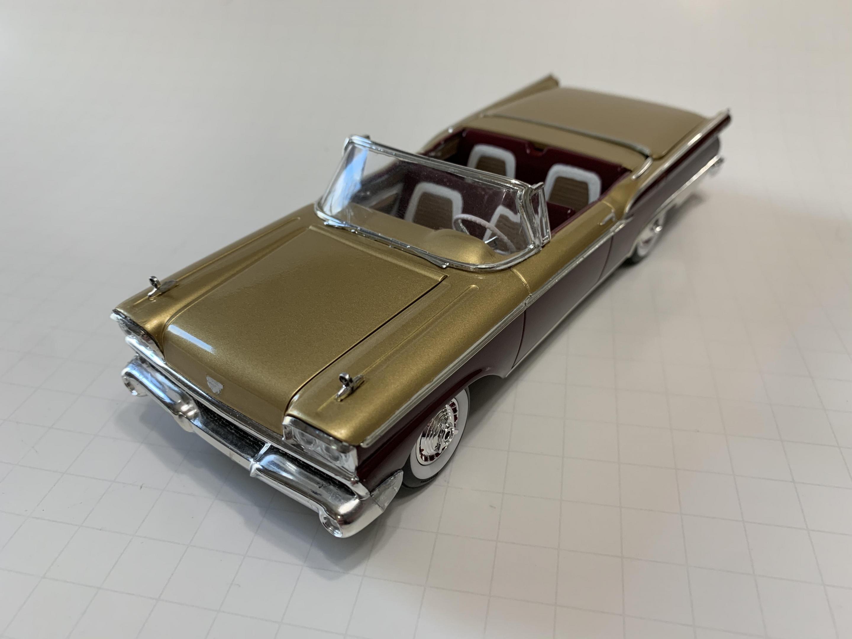 I recently completed the Skip’s Fiesta version of the ‘59 Skyliner. I’ll attempt to chronicle the adventure whilst it’s still fresh in my noggin. As far as the multi-piece body is concerned, to me it equated to nothing more than extra steps in the process. It certainly required more patience, ingenuity, forward thinking and mock-ups than anything I’ve encountered, but I have zero complaints about Revell’s engineering as it pertains to the body. My biggest complaint with this particular version of this kit is the salmon-colored goo from which it is molded. I played hell finding the right glue (more accurately; glue combinations) to hold this house of cards together. Typically one of my first steps in a build is to, at least, partially assemble my suspension parts so that I can mock things up to check the stance and ride height. Luckily, I suppose, this is when I discovered what a headache the adhesive issue was going to be. I glued the two part rear end and axle together with Plastruct Plastic Weld (orange label) clamped it and went to bed. The next morning I found that the Plastruct had reacted badly with the soft plastic and the spring loaded clamps had squished the axle housing into a flat piece of sticky, yet crackly, pinkish goop. (Think baseball card chewing gum exposed to a light spring shower.) I cut the leaf springs off, salvaged the pumpkin and scratched out a new axle housing from aluminum tubing and kept pushing forward. For the engine halves I applied Testors liquid cement, clamped and waited. Upon removing the clamp the two halves, by no force other than gravity, fell apart as if I’d used sugar water to glue them. Tamiya liquid cement (orange label) didn’t bare fruit either. Plastruct Bondene (white label) actually dried but didn’t hold well at all. In a fit of desperation I mixed 2 parts Tamiya Extra Thin (green label) with 1 part Plastruct Bondene (white label) and low and behold it worked great without distorting the plastic. The downside is that it is very thin. In the end, 90% of the build is stuck together with Gorilla brand clear 5 minute epoxy with the thin home brew run into seams and joints where applicable. Also, Tamiya putty seemed to react poorly with this particular variation of styrene. I had much better results with Squadron putty. Where the roof and deck lid are concerned, again, lots of patience and test fitting but no real issues. I drilled and pinned all of the hinge points but that was for my own piece of mind and not out of necessity. Probably the most daunting and migraine inducing step in this entire build for me was the windshield and it’s spindly, delicate, ill-fitting frame. In it’s natural, unmolested state the frame neither fits nor forms to either the body or the windshield. The icing on the cake is that the windshield would either fit the contours of the cowl or the contour of the roof, but not both at the same time, and neither when fitted to the windshield frame. After 2 days of nervously shaving, sanding and using steam to gently reshape all parties involved, I got it to fit with very little forceful persuasion. All I had to do now was affix it to the body without destroying the paint job. In summation, the multi-piece body was the least of this kit’s issues. I’ll say this much, even though the build is far from perfect, I cannot imagine being more proud of any accomplishment in this hobby than when I pause and look at this one on the shelf. And I’m not even a Ford guy.