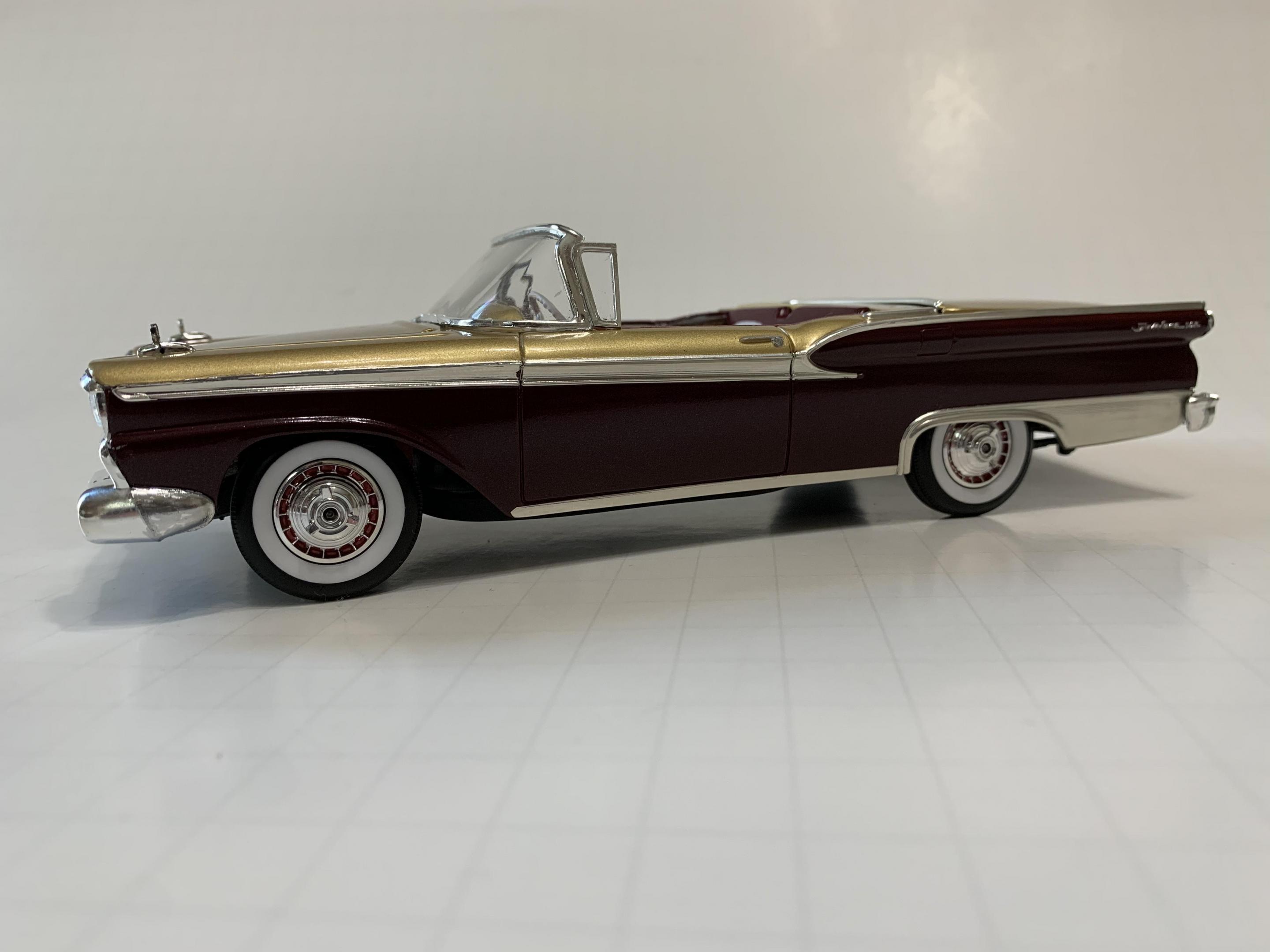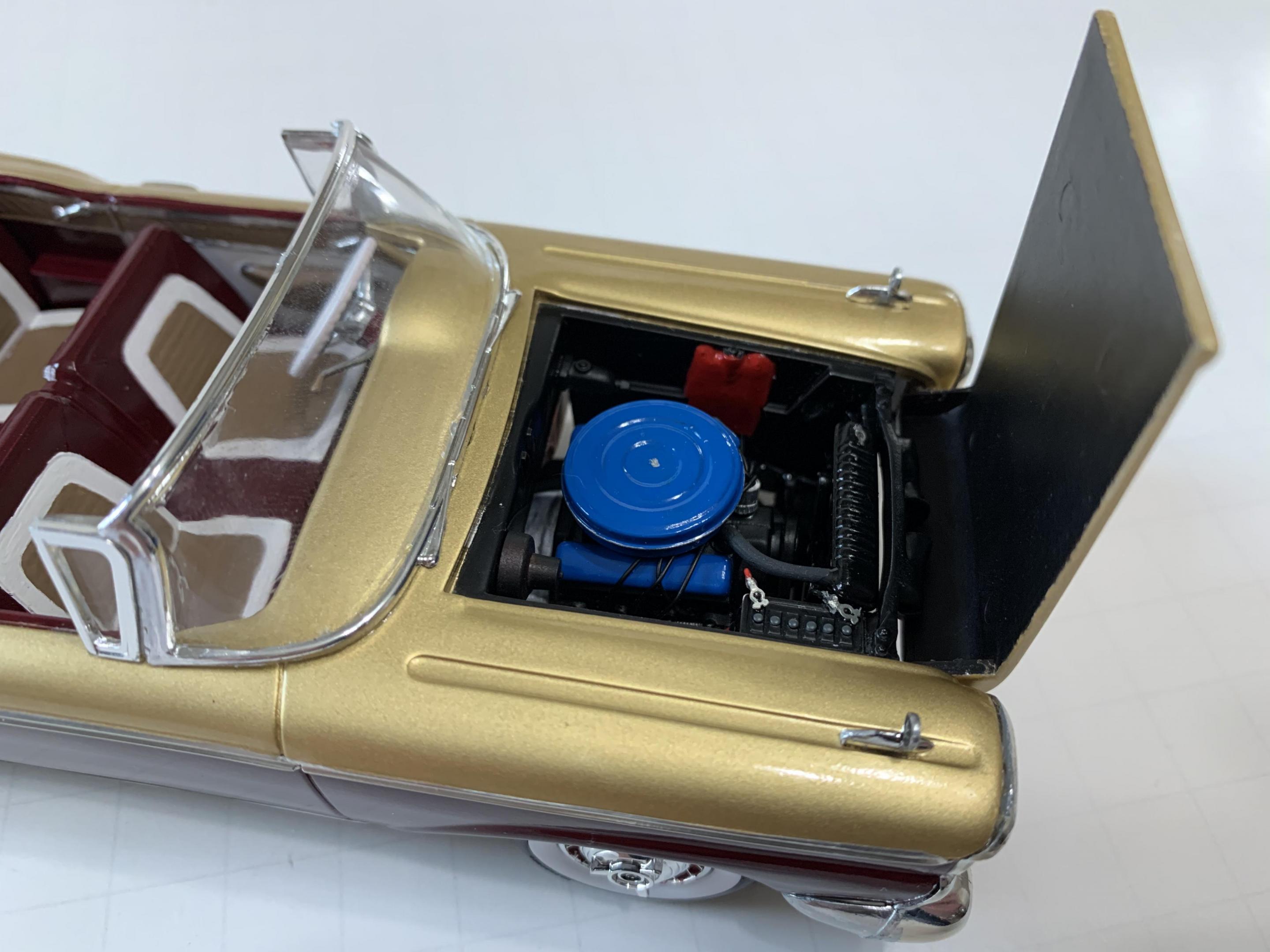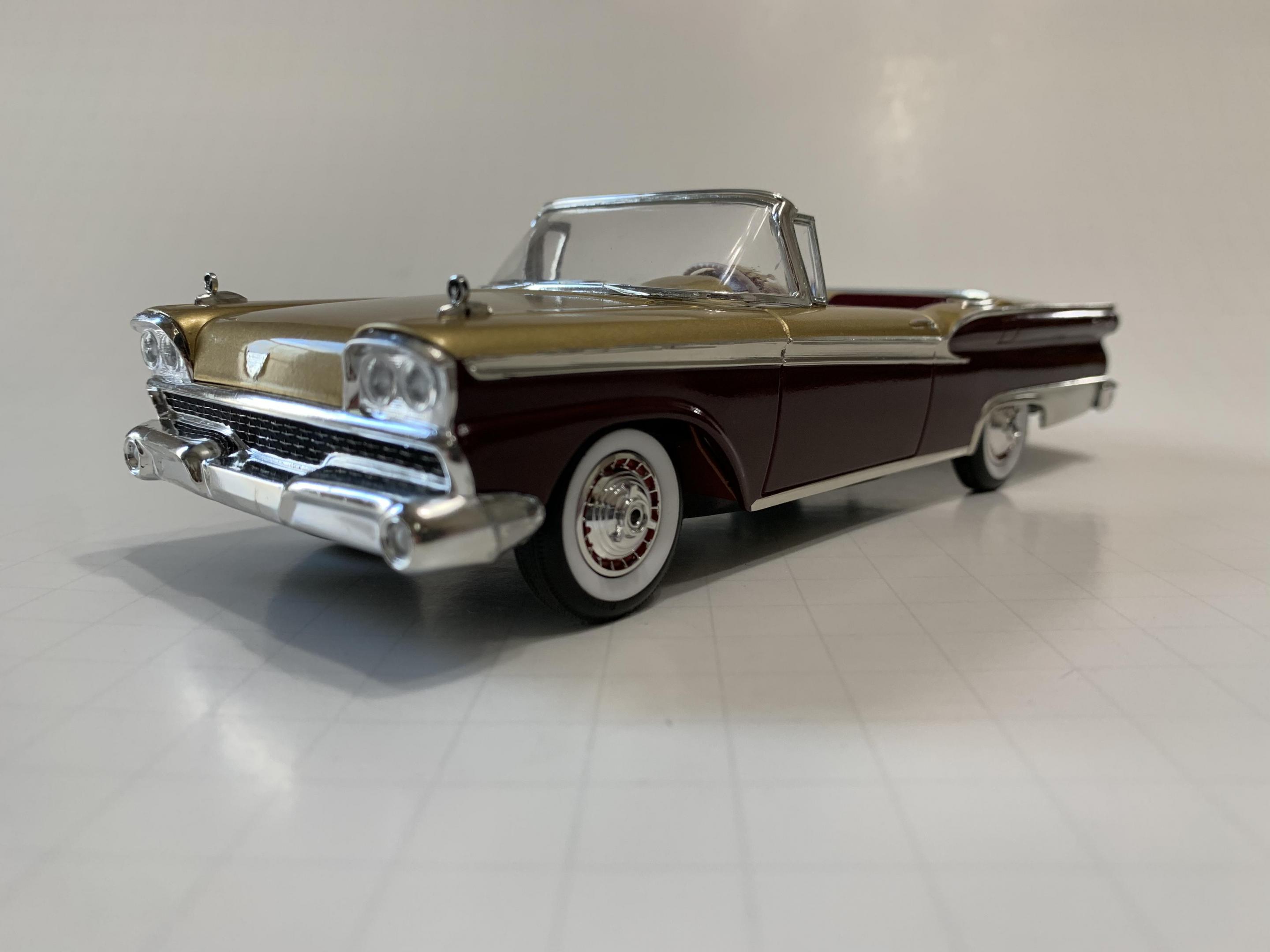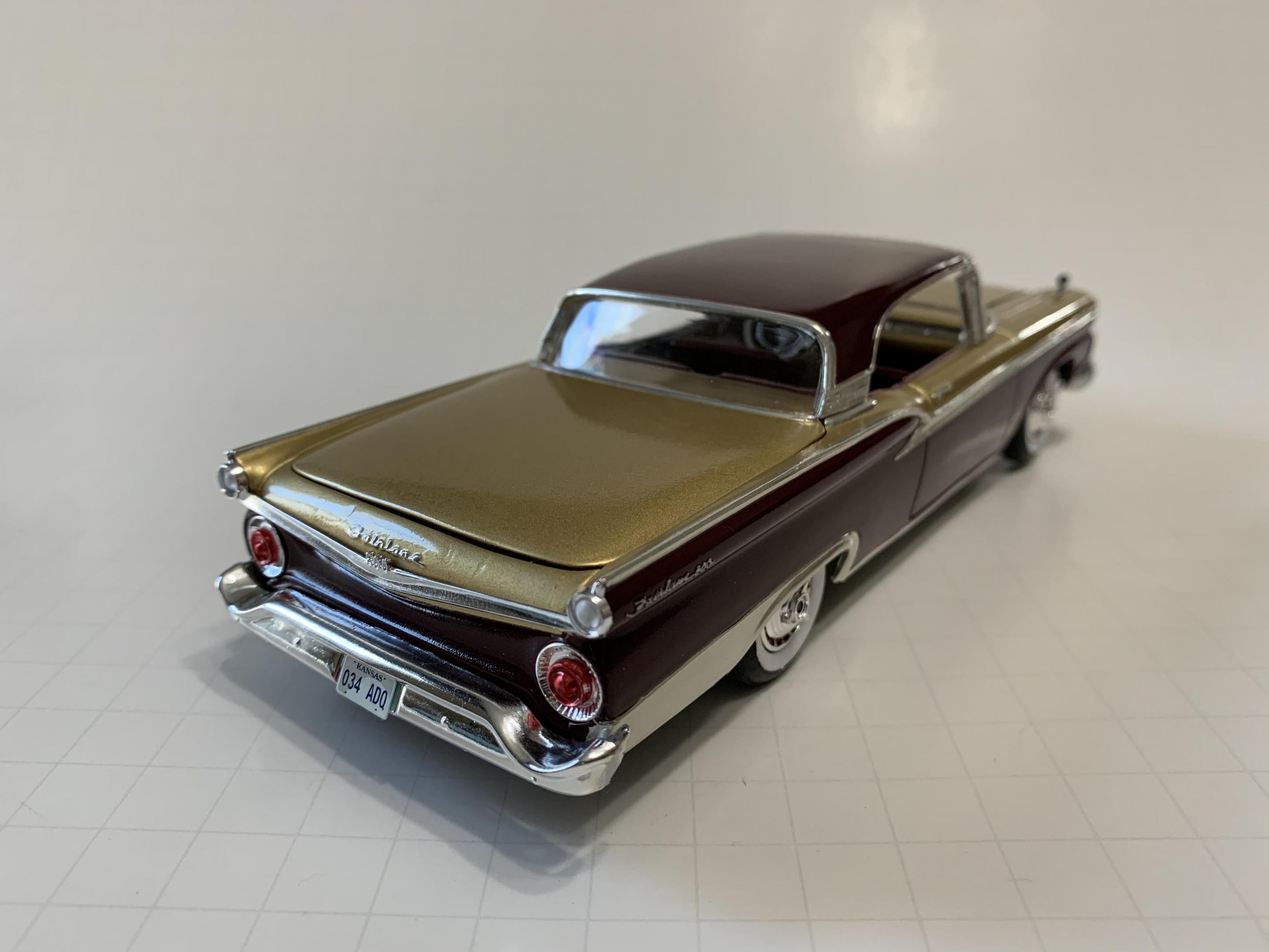 3. Well. Where to begin... I’ve heard numerous horror stories about this kit. They’re all true. In the spirit of putting positive vibes into the universe for 2021 I’ll say 3 nice things about this kit: 1. M.C. Escher didn’t draw the instructions. 2. Salvador Dali wasn’t commissioned for the box art. 3. With patience, care, a little know-how and a prescription for Xanax, it really does build up nicely. I reworked every single hinge (and there’s no shortage of them). The original tabs on the deck lid were gaudy, so they had to go. I filled the square holes left behind in the body and mounted a “swinging” hinge with 2 C mounts and a pin beneath the lid, run through tube stock that I reshaped i to an oval mounted to the underside of the lip of the trunk. I repinned the hinges on the hood because once the grille was mounted the fit was too tight for the hood to tilt forward. With the top up, there was a dip where the two-piece roof came together, so I beefed that up with newly fabricated hinges that “snap” into place when I want the top up and will only fold down when “unsnapped.” I did the same with the folding, two-piece deck lid. The biggest problem I encountered was actually glueing the dogged thing together. I tried every model glue in the arsenal, but nothing seemed to want to bond the soft, salmon-colored goo of which this kit is cast. 90% of this sucker is held together with 5 minute epoxy. I added a few details under the hood and went with the wheels from the AMT ‘63 Galaxie for no good reason other than I like the looks of them better. Then paint is TS-21 Gold and TS-11 Maroon with a shot of Tamiya Pearl Clear over the maroon then Testors Wet Look clear over the whole enchilada. Trim is BMF. Thank you for looking. Comments, tips, pointers, critiques, questions and conversation are always welcome. Namaste ?