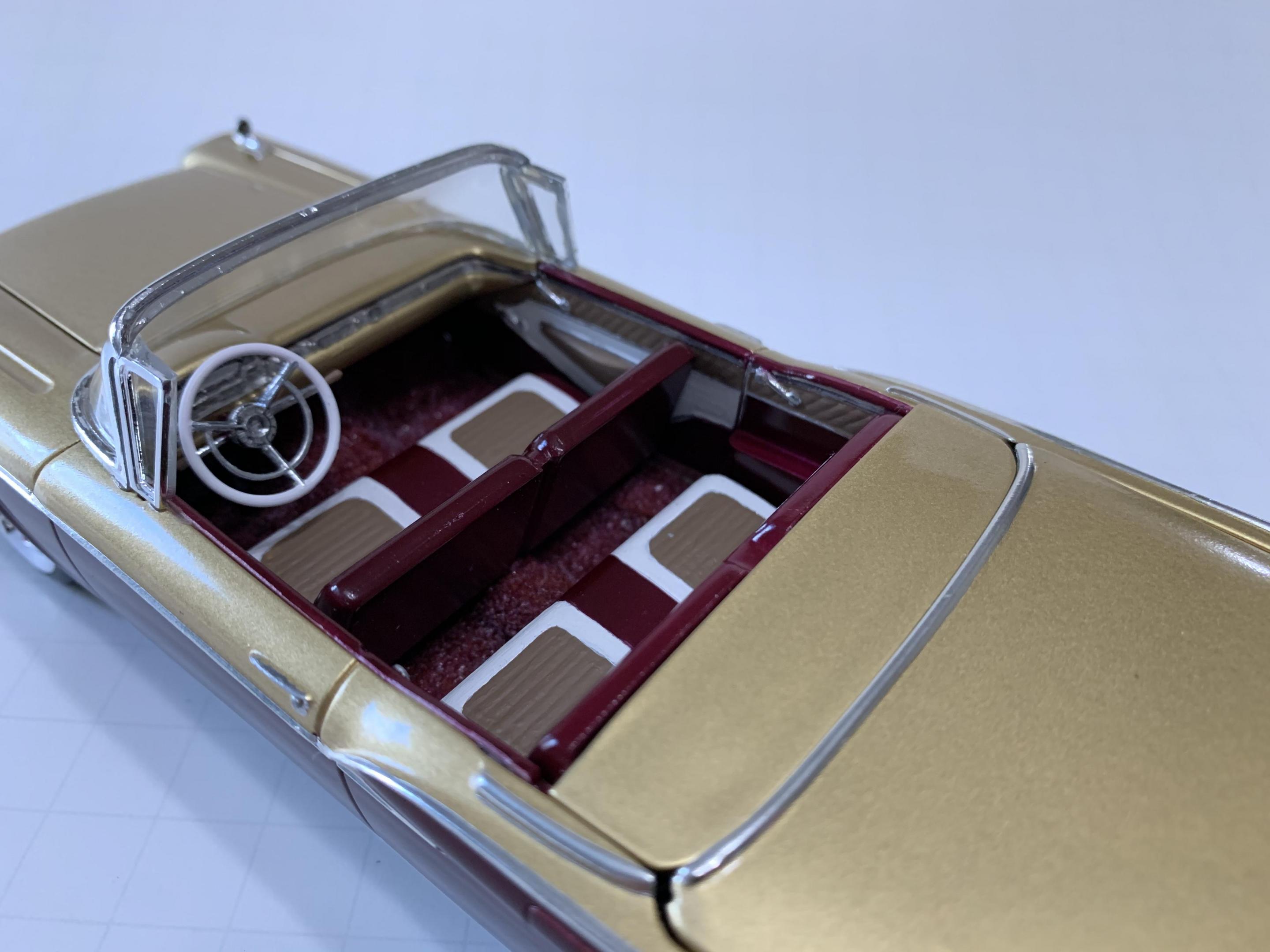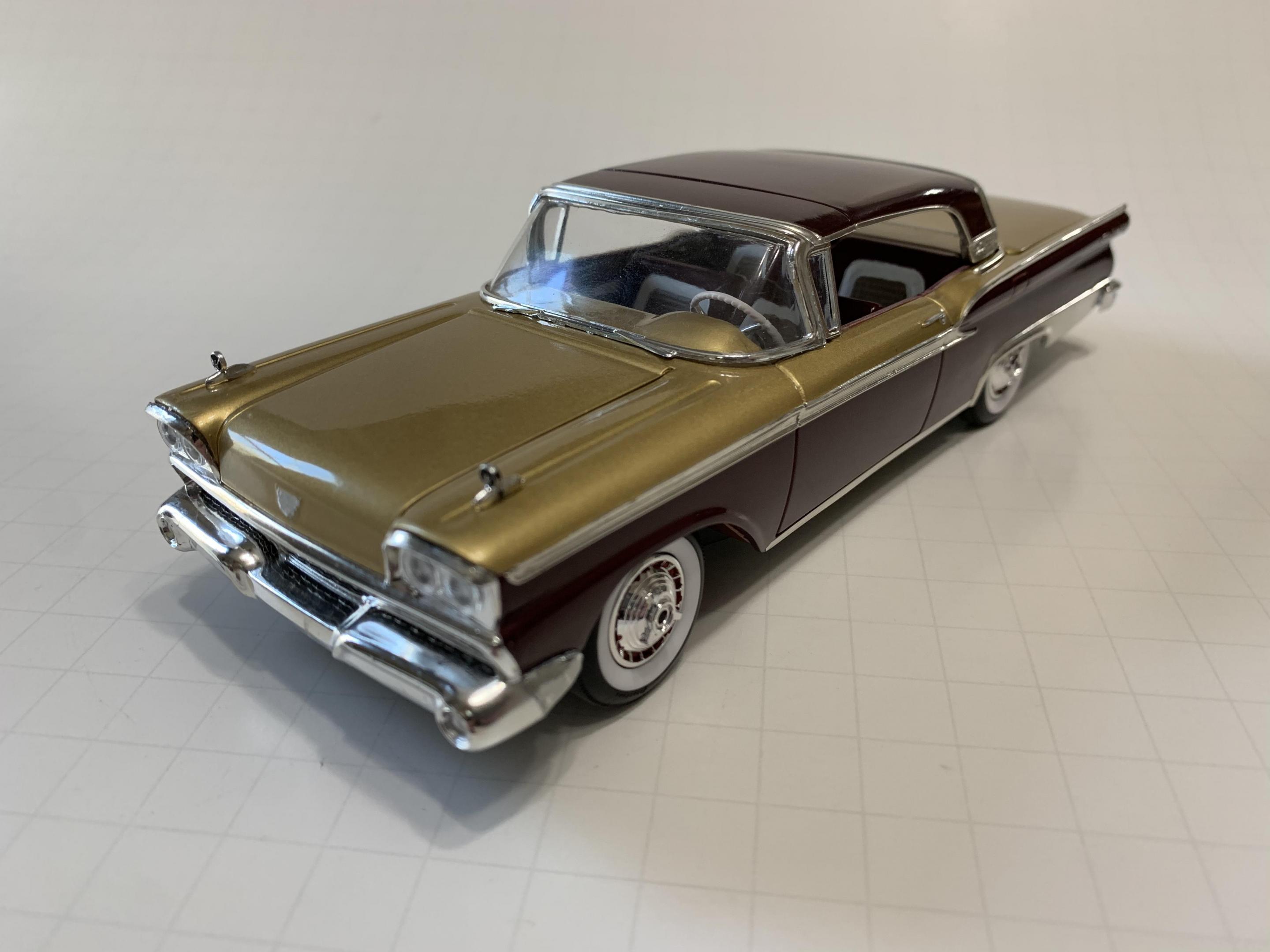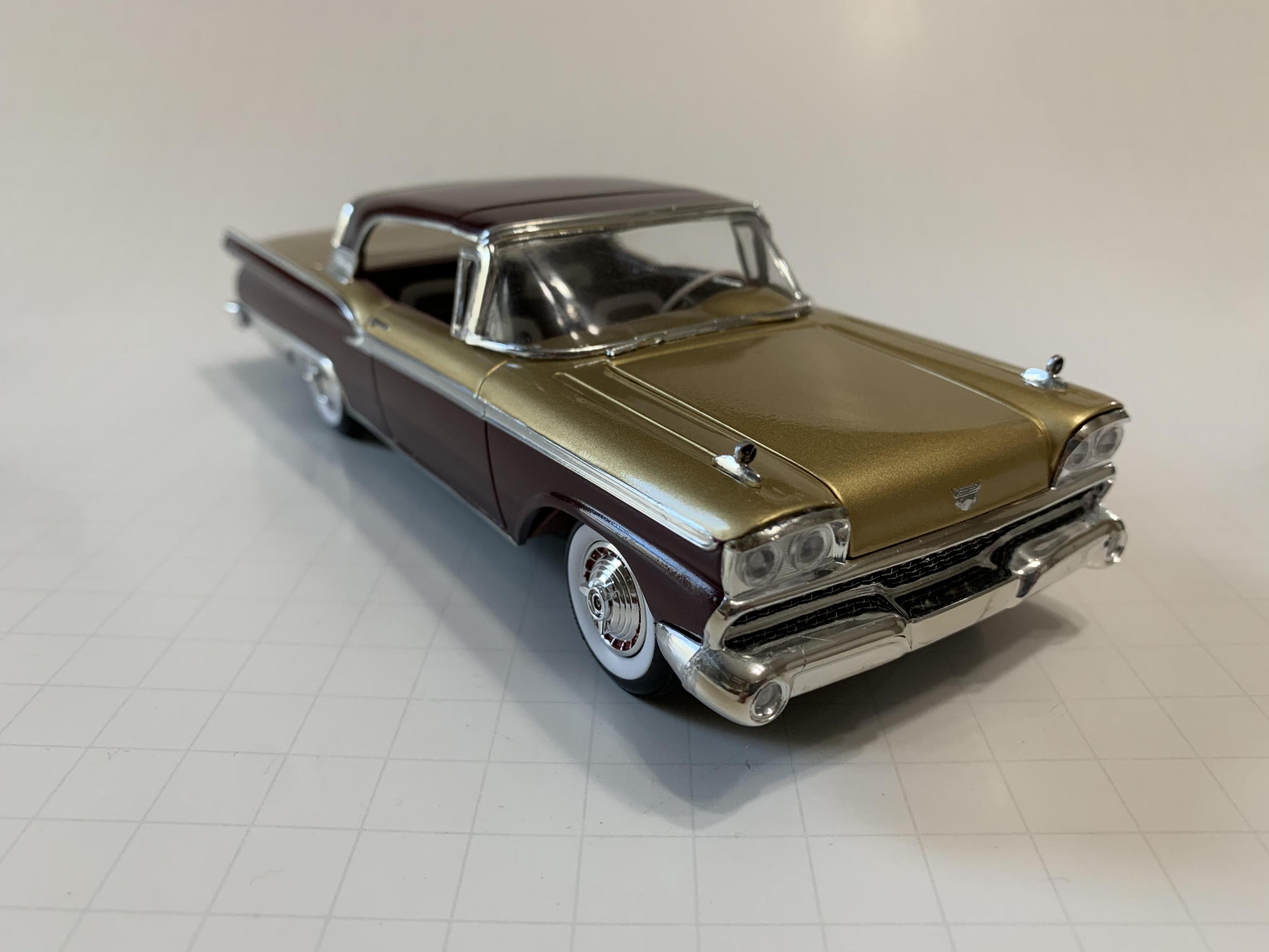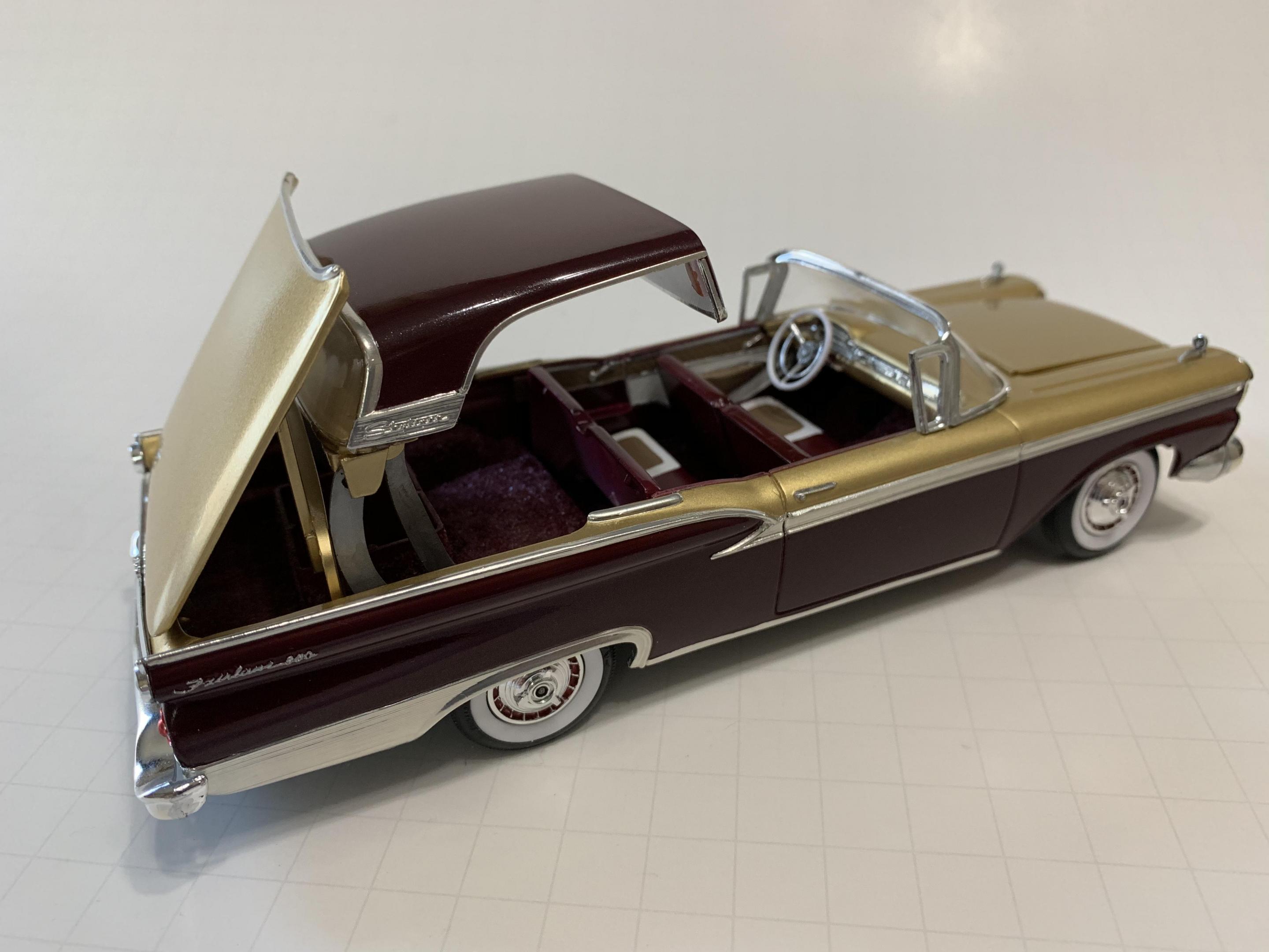 3. Well. Where to begin... I’ve heard numerous horror stories about this kit. They’re all true. In the spirit of putting positive vibes into the universe for 2021 I’ll say 3 nice things about this kit: 1. M.C. Escher didn’t draw the instructions. 2. Salvador Dali wasn’t commissioned for the box art. 3. With patience, care, a little know-how and a prescription for Xanax, it really does build up nicely. I reworked every single hinge (and there’s no shortage of them). The original tabs on the deck lid were gaudy, so they had to go. I filled the square holes left behind in the body and mounted a “swinging” hinge with 2 C mounts and a pin beneath the lid, run through tube stock that I reshaped i to an oval mounted to the underside of the lip of the trunk. I repinned the hinges on the hood because once the grille was mounted the fit was too tight for the hood to tilt forward. With the top up, there was a dip where the two-piece roof came together, so I beefed that up with newly fabricated hinges that “snap” into place when I want the top up and will only fold down when “unsnapped.” I did the same with the folding, two-piece deck lid. The biggest problem I encountered was actually glueing the dogged thing together. I tried every model glue in the arsenal, but nothing seemed to want to bond the soft, salmon-colored goo of which this kit is cast. 90% of this sucker is held together with 5 minute epoxy. I added a few details under the hood and went with the wheels from the AMT ‘63 Galaxie for no good reason other than I like the looks of them better. Then paint is TS-21 Gold and TS-11 Maroon with a shot of Tamiya Pearl Clear over the maroon then Testors Wet Look clear over the whole enchilada. Trim is BMF. Thank you for looking. Comments, tips, pointers, critiques, questions and conversation are always welcome. Namaste ?
