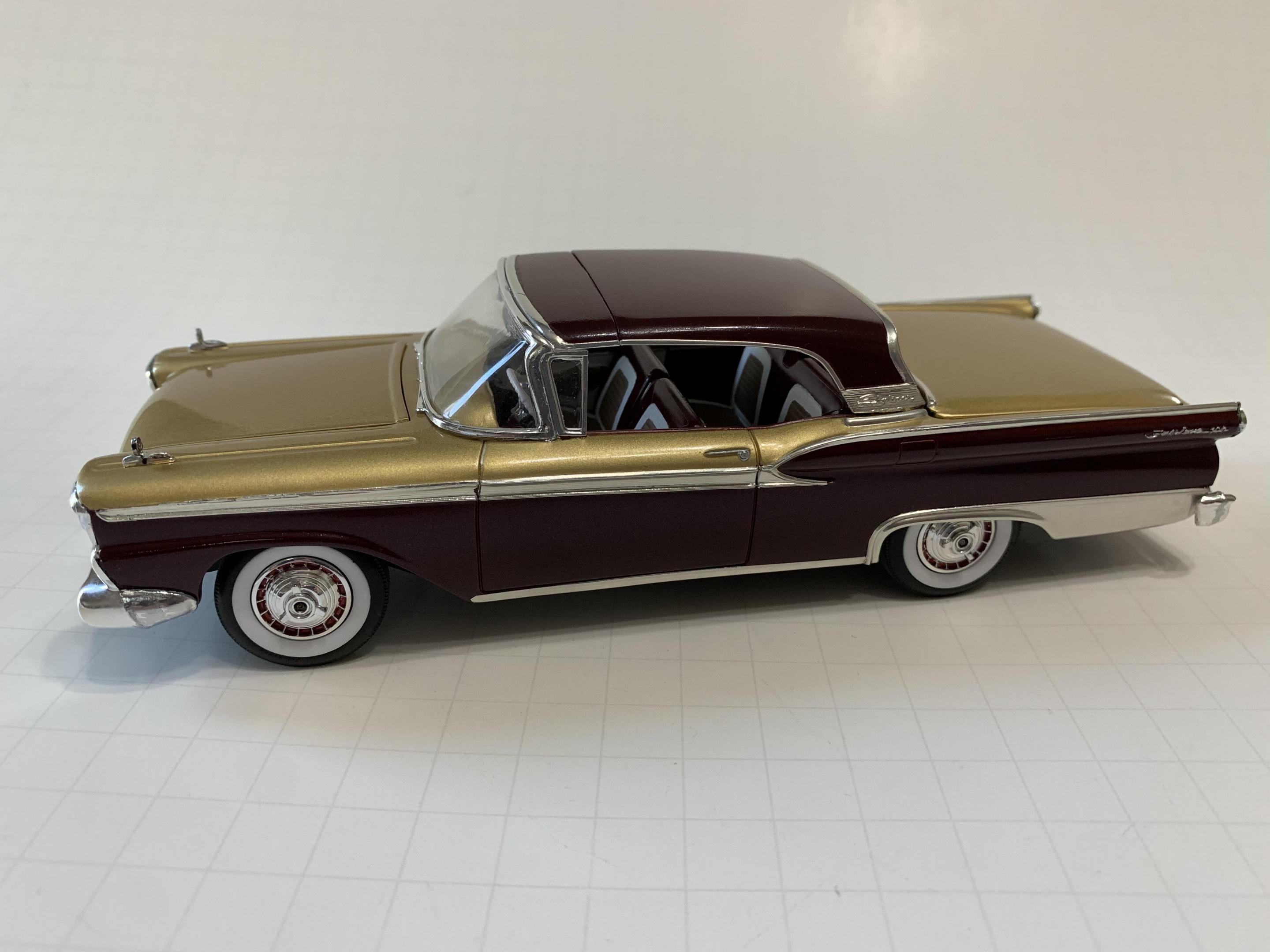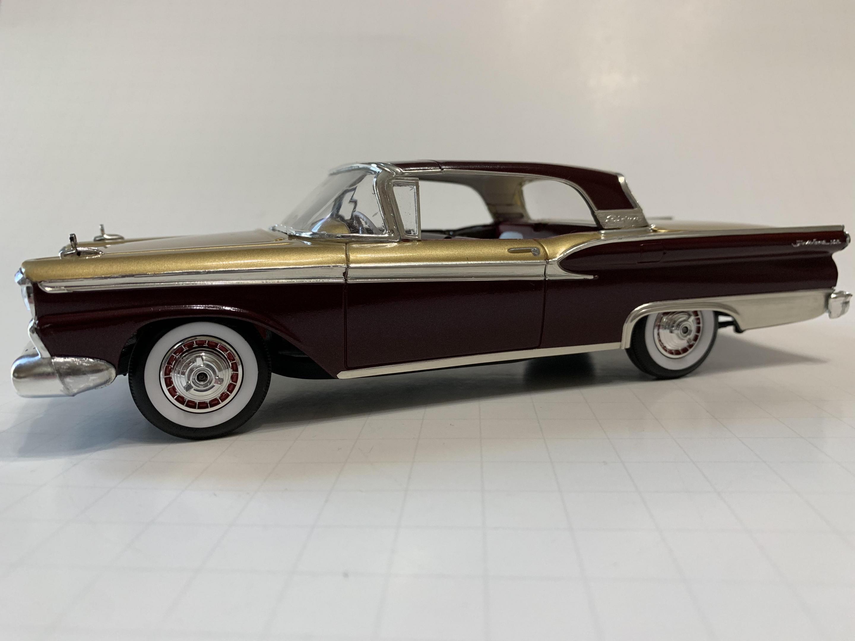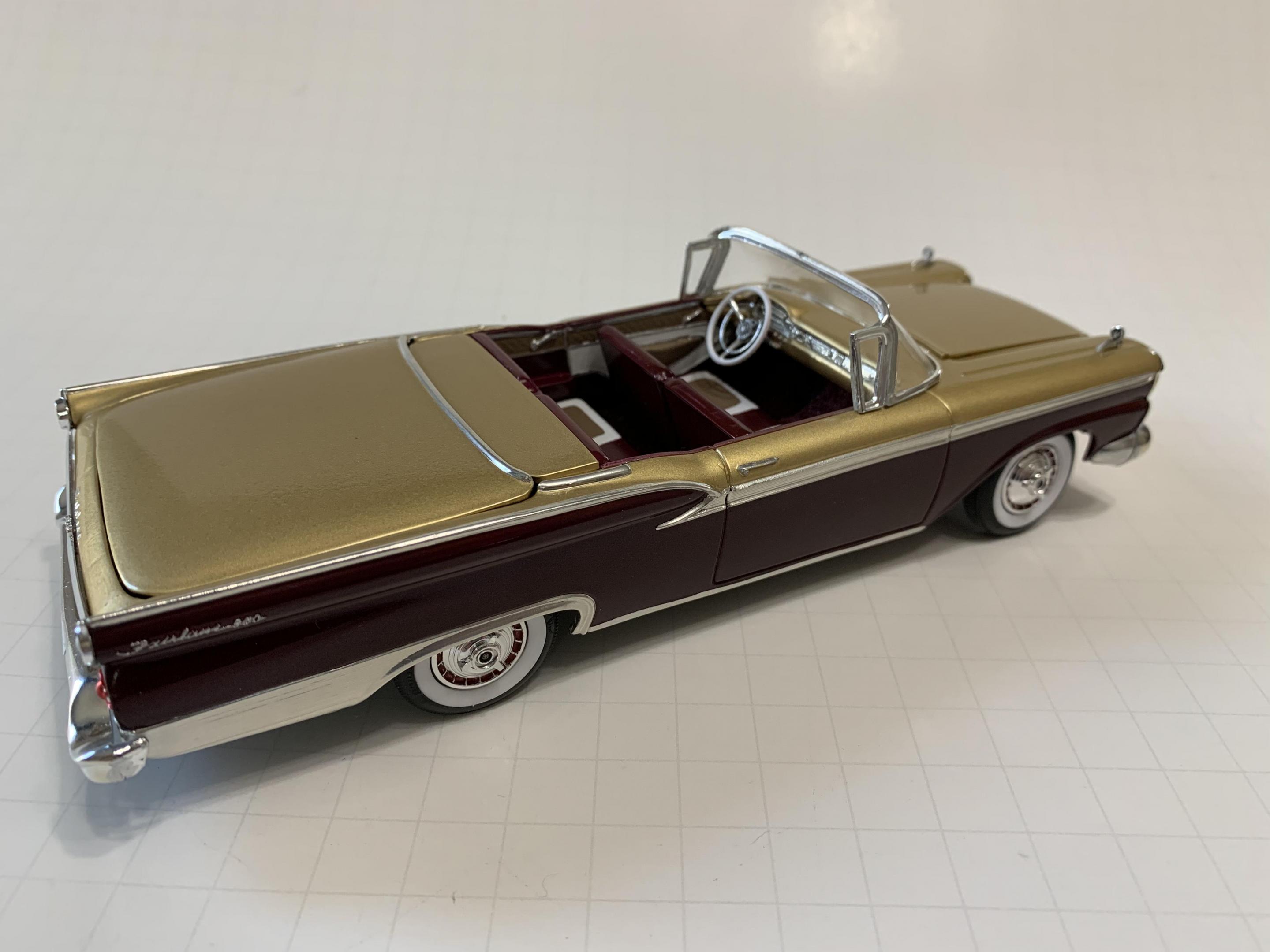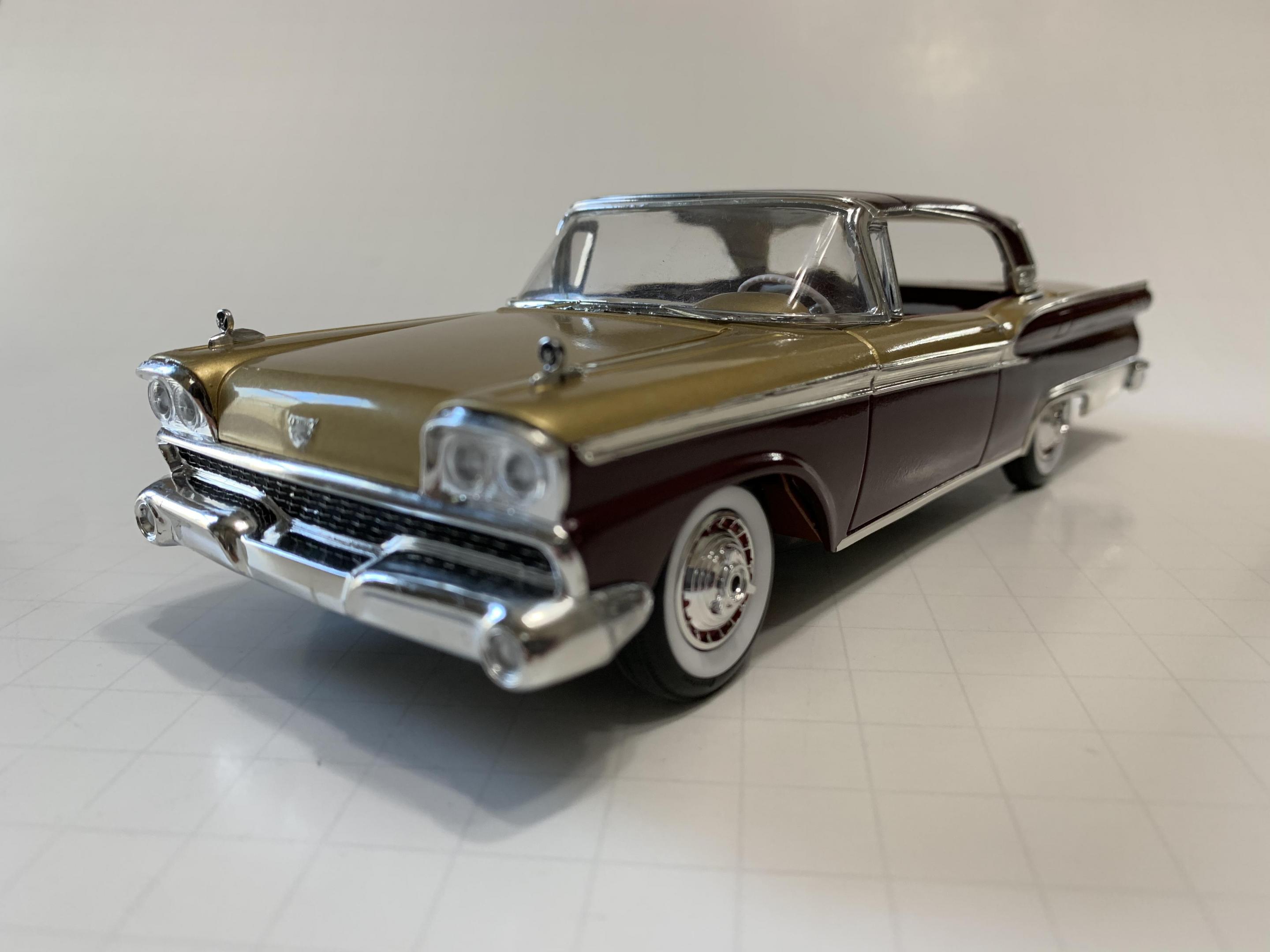 3. Well. Where to begin... I’ve heard numerous horror stories about this kit. They’re all true. In the spirit of putting positive vibes into the universe for 2021 I’ll say 3 nice things about this kit: 1. M.C. Escher didn’t draw the instructions. 2. Salvador Dali wasn’t commissioned for the box art. 3. With patience, care, a little know-how and a prescription for Xanax, it really does build up nicely. I reworked every single hinge (and there’s no shortage of them). The original tabs on the deck lid were gaudy, so they had to go. I filled the square holes left behind in the body and mounted a “swinging” hinge with 2 C mounts and a pin beneath the lid, run through tube stock that I reshaped i to an oval mounted to the underside of the lip of the trunk. I repinned the hinges on the hood because once the grille was mounted the fit was too tight for the hood to tilt forward. With the top up, there was a dip where the two-piece roof came together, so I beefed that up with newly fabricated hinges that “snap” into place when I want the top up and will only fold down when “unsnapped.” I did the same with the folding, two-piece deck lid. The biggest problem I encountered was actually glueing the dogged thing together. I tried every model glue in the arsenal, but nothing seemed to want to bond the soft, salmon-colored goo of which this kit is cast. 90% of this sucker is held together with 5 minute epoxy. I added a few details under the hood and went with the wheels from the AMT ‘63 Galaxie for no good reason other than I like the looks of them better. Then paint is TS-21 Gold and TS-11 Maroon with a shot of Tamiya Pearl Clear over the maroon then Testors Wet Look clear over the whole enchilada. Trim is BMF. Thank you for looking. Comments, tips, pointers, critiques, questions and conversation are always welcome. Namaste ?