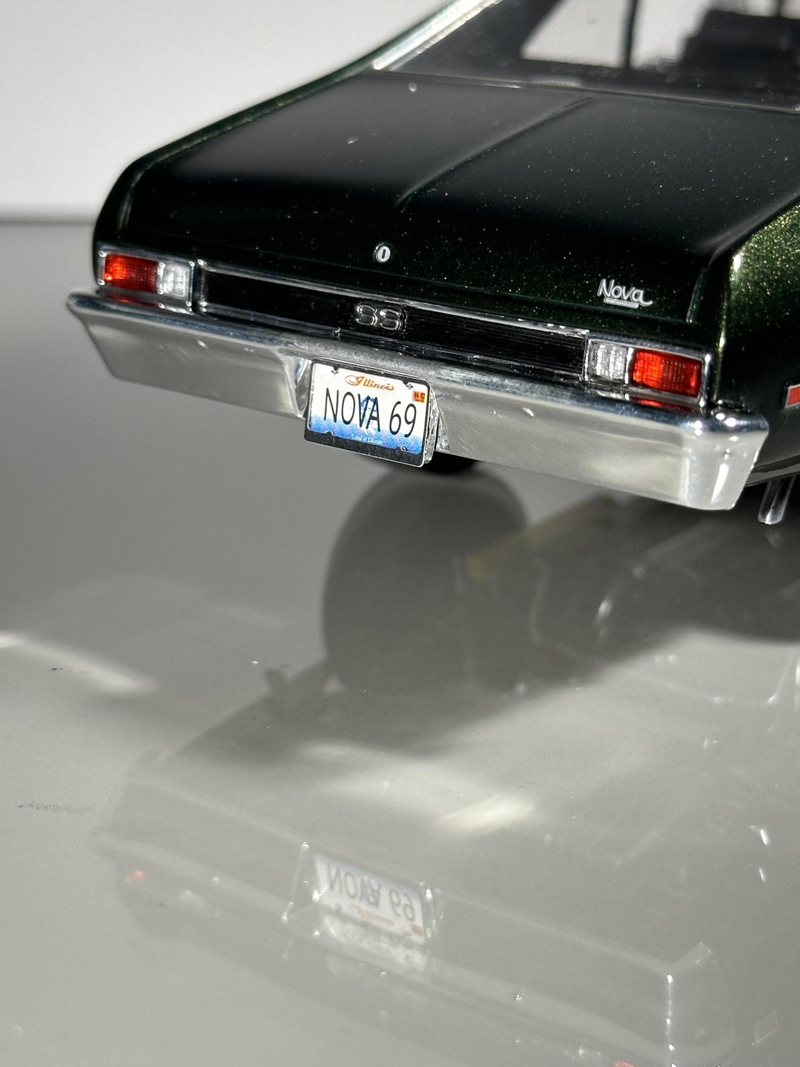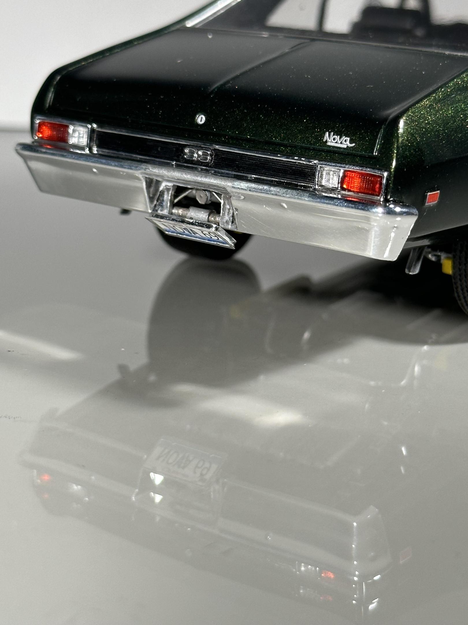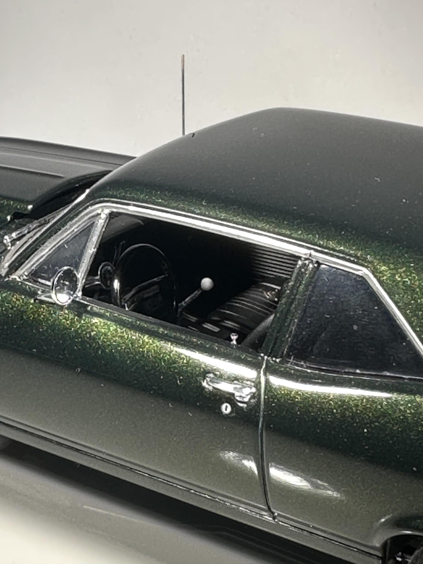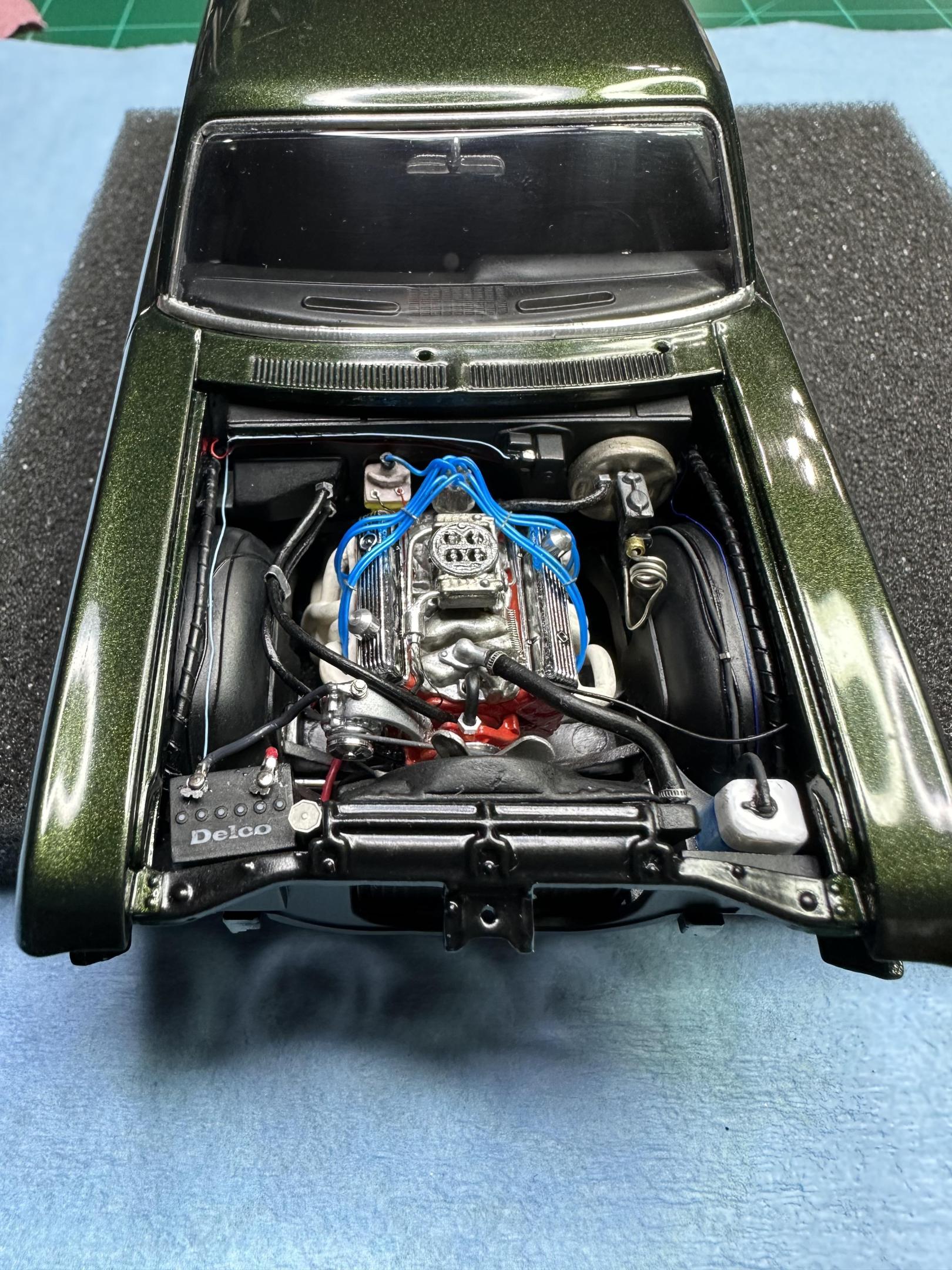 I built this Revell kit as a typical muscle car that could be found on the streets in the 70's. I added a lot of detail to make it look realistic, even adding a working pull-down license plate with the gas filler neck and gas cap, which was common back then. Door locks, tire valve stems, drive shaft balance weights and a lot of work in the engine bay, on the engine and chassis. The paint is Model Masters Dark Green Metallic enamel with their enamel High Gloss clear. I made mistakes but pleased with the end result.