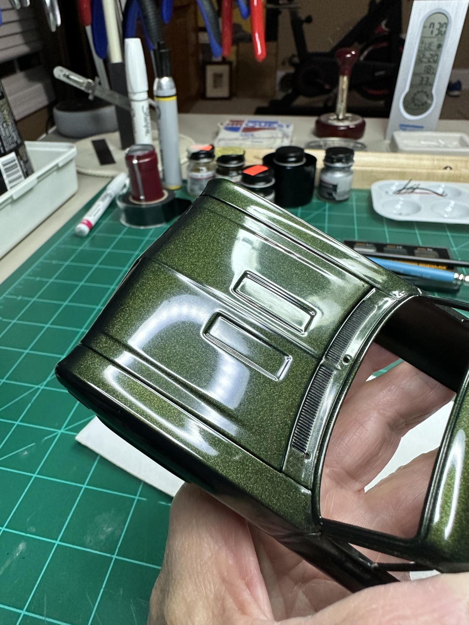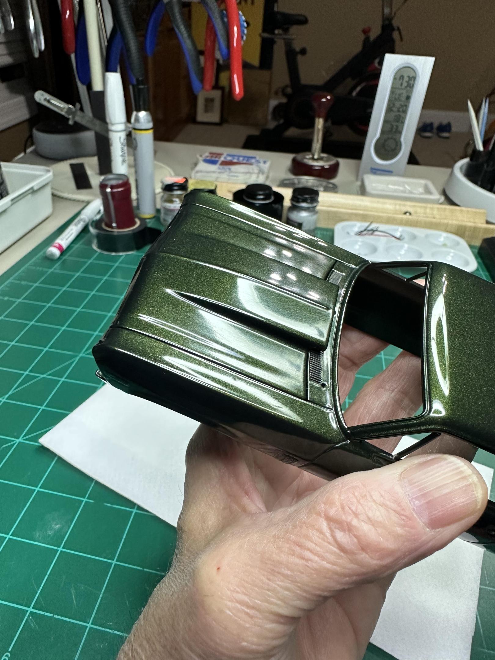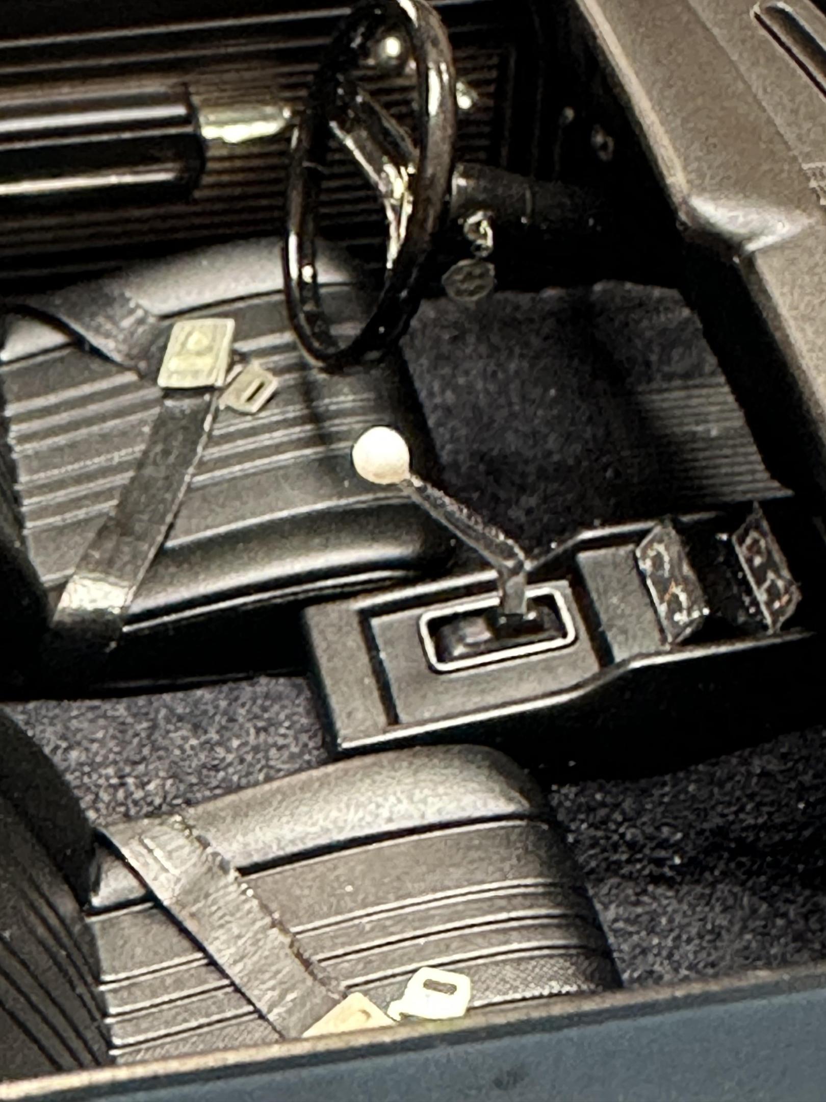 I built this Revell kit as a typical muscle car that could be found on the streets in the 70's. I added a lot of detail to make it look realistic, even adding a working pull-down license plate with the gas filler neck and gas cap, which was common back then. Door locks, tire valve stems, drive shaft balance weights and a lot of work in the engine bay, on the engine and chassis. The paint is Model Masters Dark Green Metallic enamel with their enamel High Gloss clear. I made mistakes but pleased with the end result.