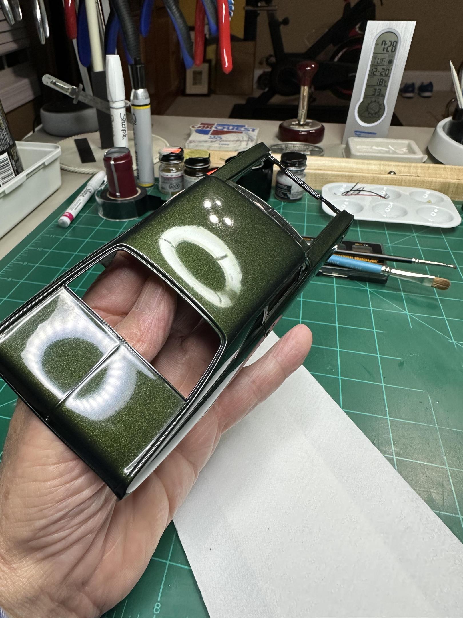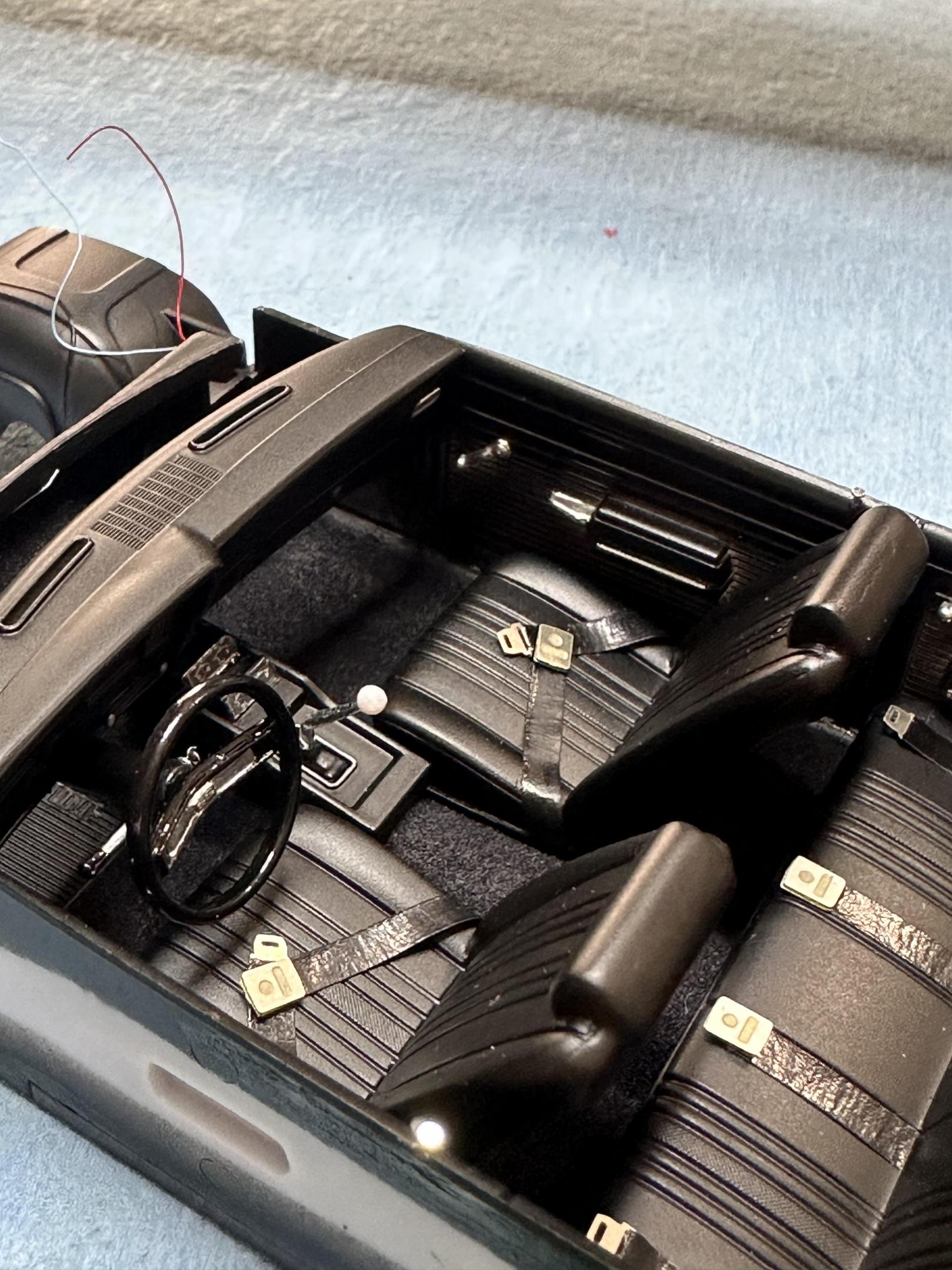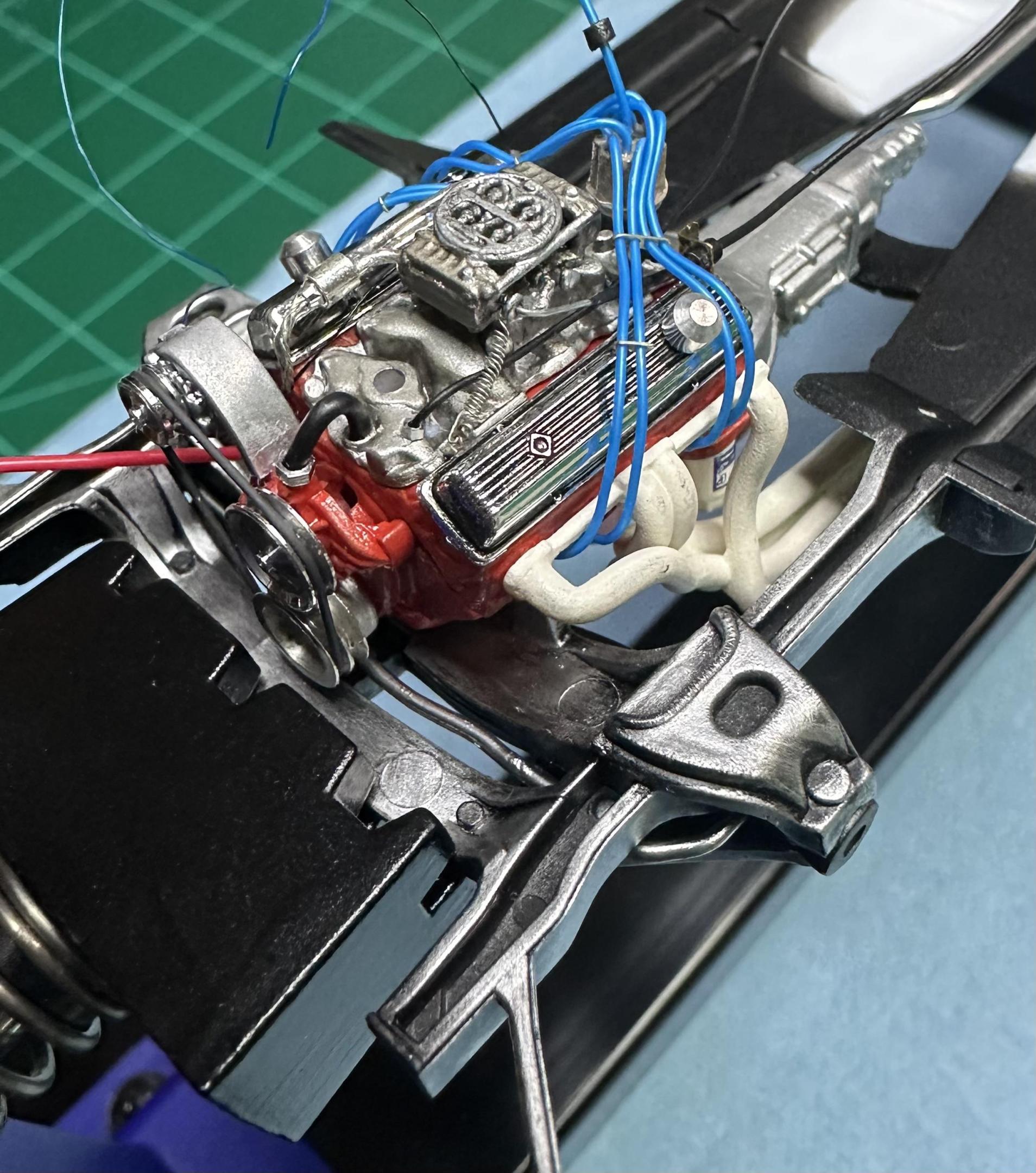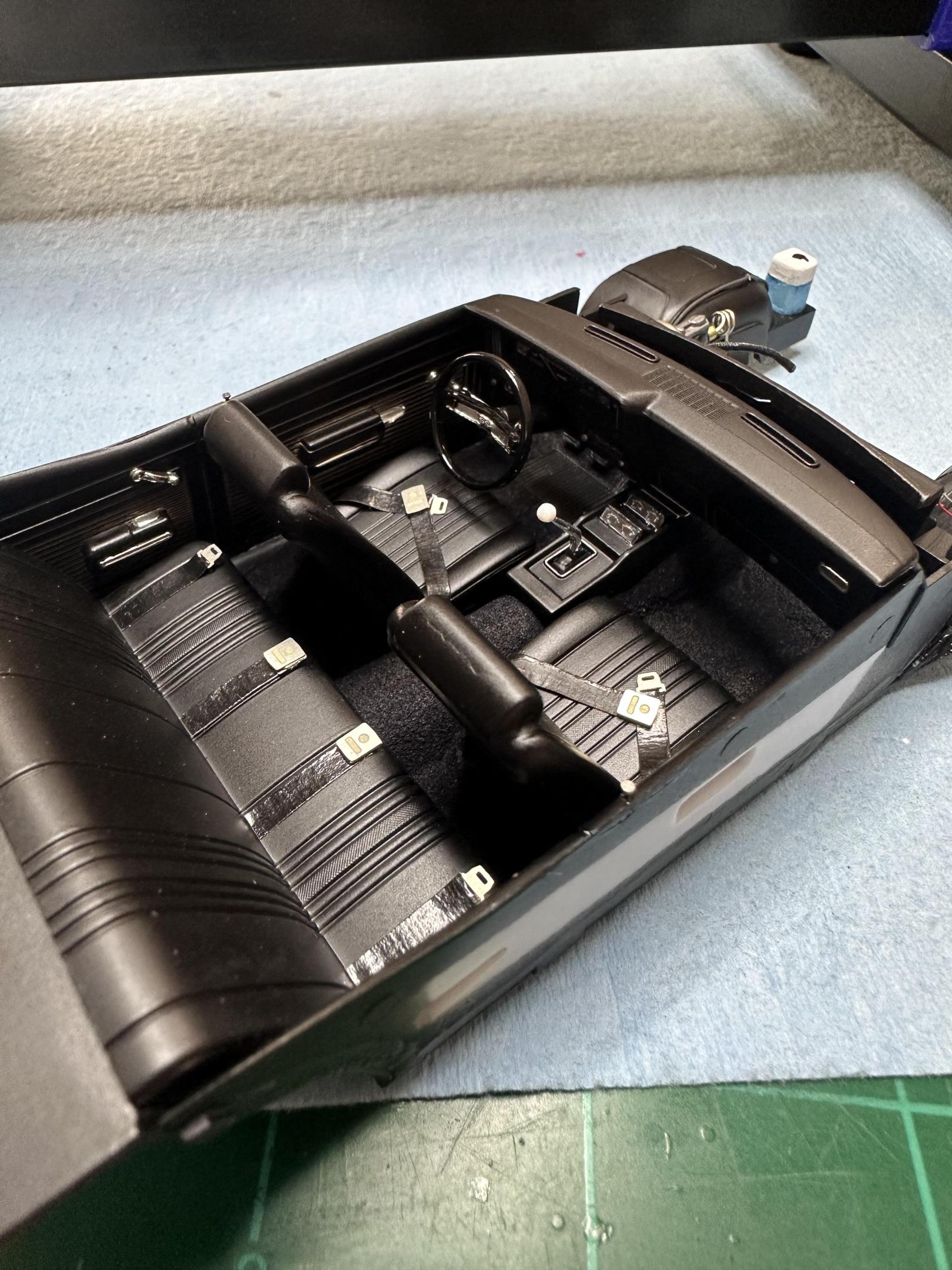 I built this Revell kit as a typical muscle car that could be found on the streets in the 70's. I added a lot of detail to make it look realistic, even adding a working pull-down license plate with the gas filler neck and gas cap, which was common back then. Door locks, tire valve stems, drive shaft balance weights and a lot of work in the engine bay, on the engine and chassis. The paint is Model Masters Dark Green Metallic enamel with their enamel High Gloss clear. I made mistakes but pleased with the end result.