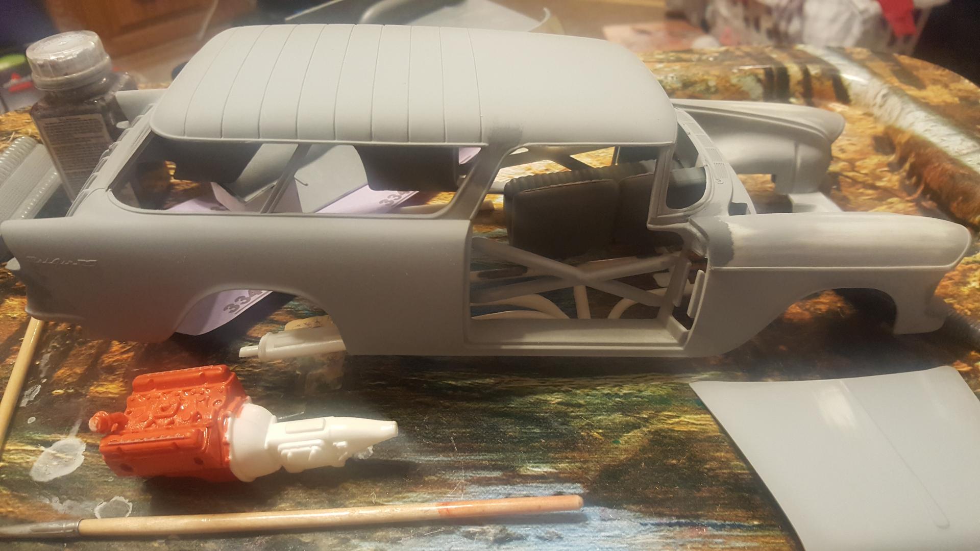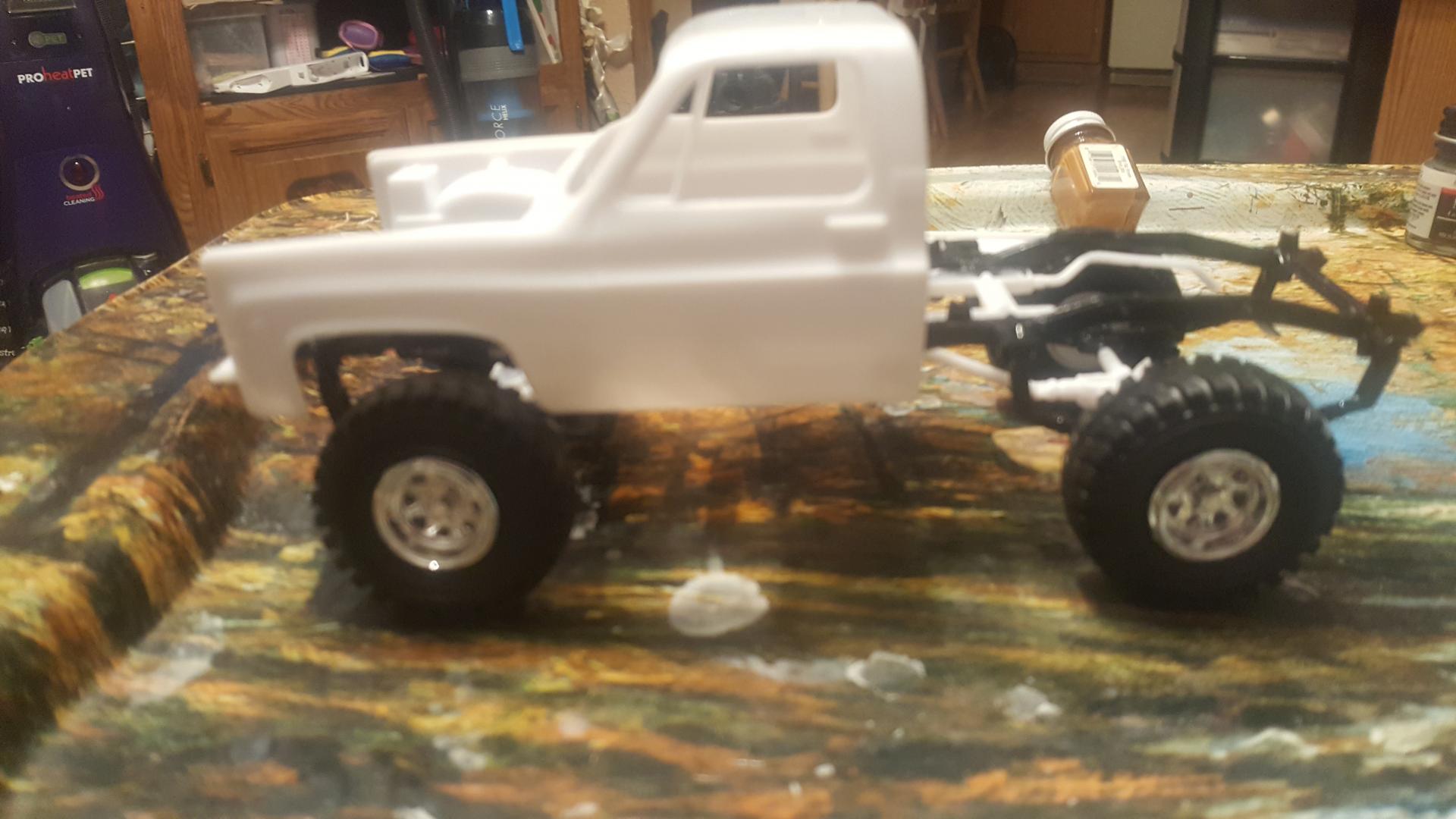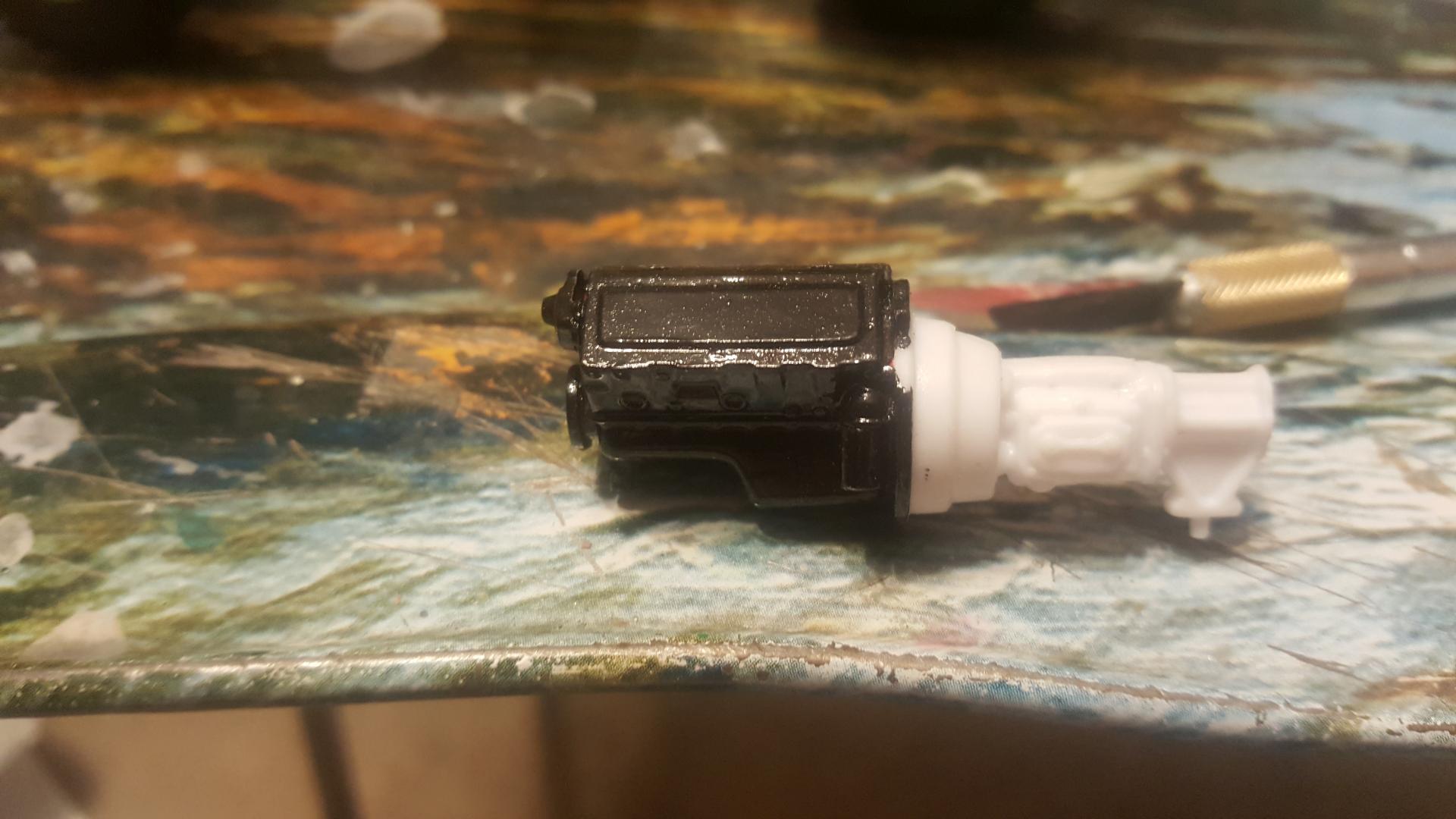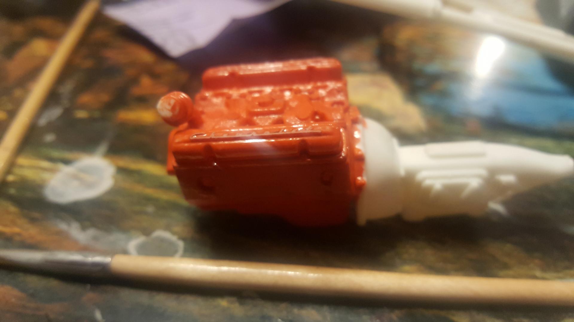 Ok so here's one of the many big rigs I have going at this time. It started life as a 378 long hauler. I used Tim's method to pie cut the hood,lower the cab and make it the 379 short nose. The frame has been stretched 1". The sleeper has been converted to a flt top. It has custom rear double hump fenders as well as intergrated rear bumper. Texas front bumper as well as custom headlights. This will be a full custom job. I have completed one bone stock per a challenge from the wife a couple years back(it killed me to go full stock with no extra detail)lol. Now this one is my baby. I've gotten all this much in primer before the weather turned unfavorable today. The last pic is of the motor and a sneak peak of whats to come with the color scheme. Hope you guys enjoy this. Any suggestions are welcome.