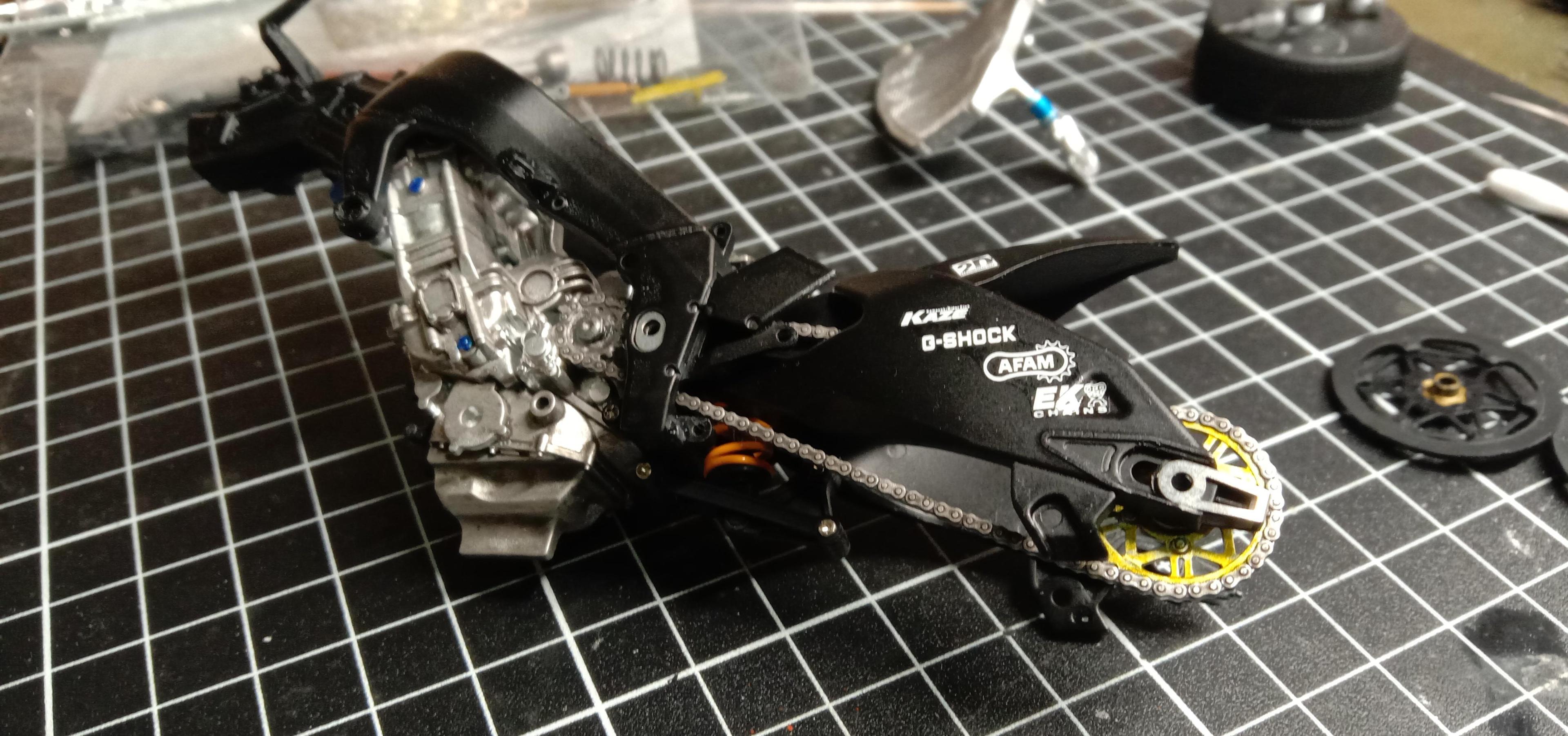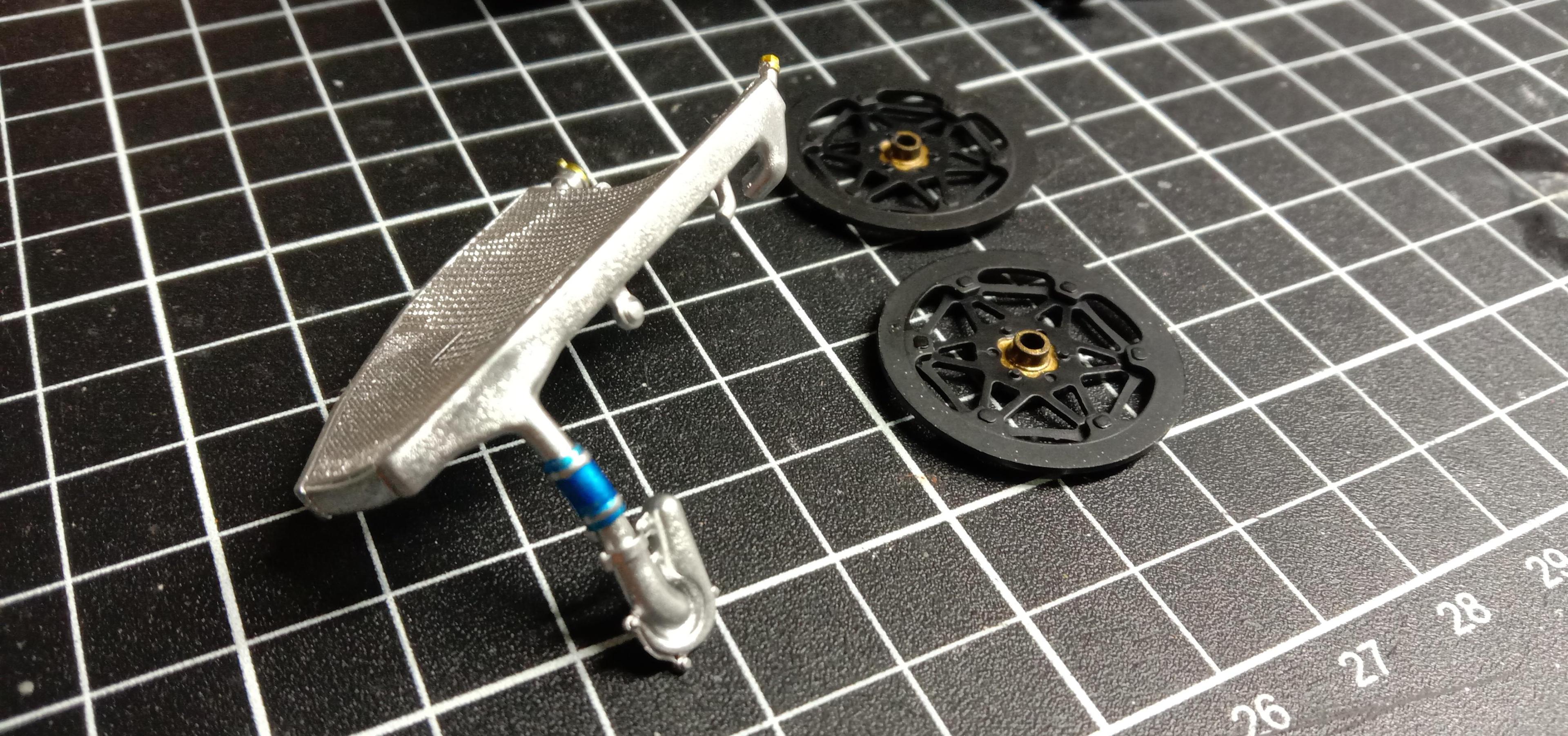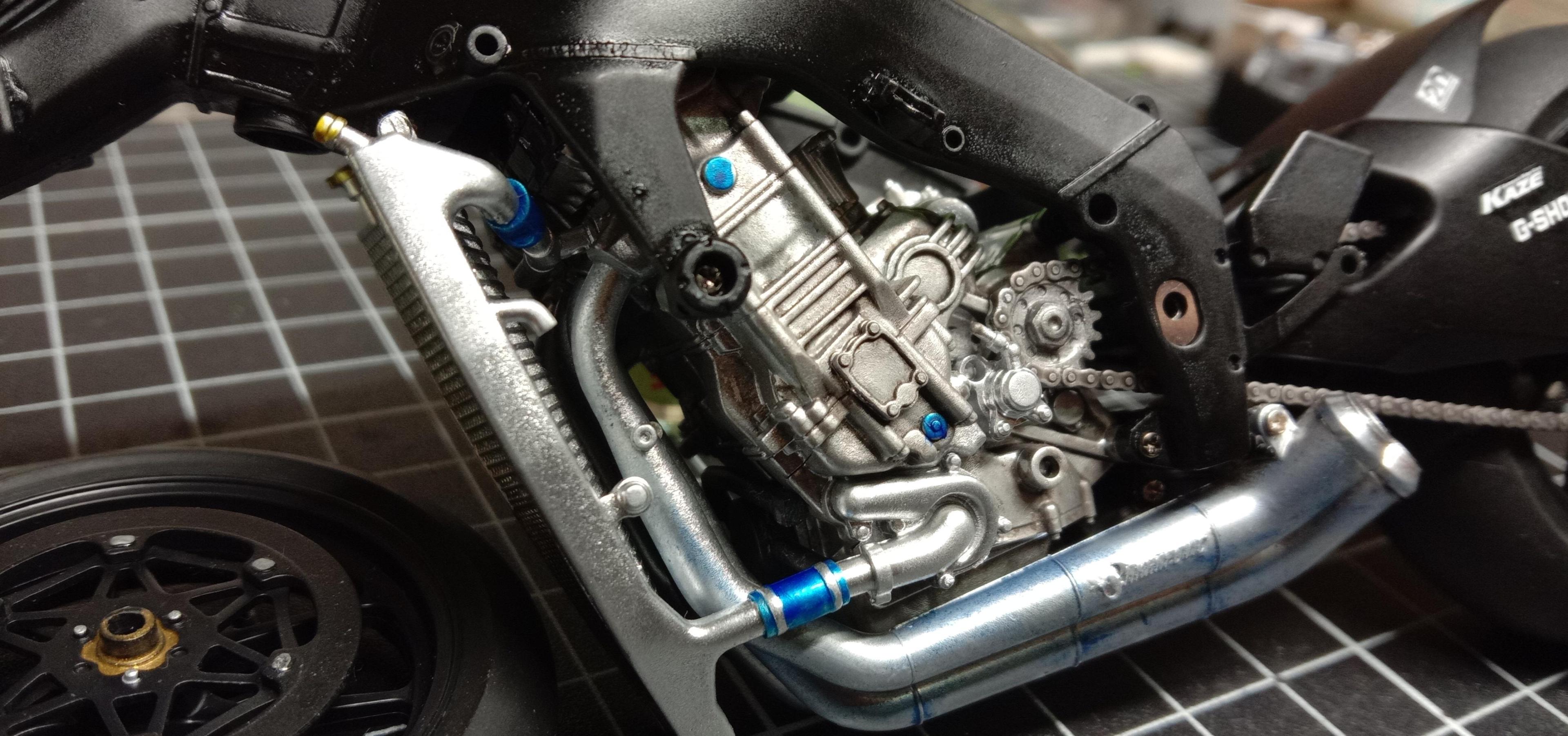 16. Progress again! I'm really loving building this one. Engine is in the frame and the swing arm is on now for good. The 2mm aluminium tube works great for the swingarm pivot and should do the trick for the axles as well. Radiator got some detail along with the front brake rotors and upper triple clamp. Thanks for looking in. Jim