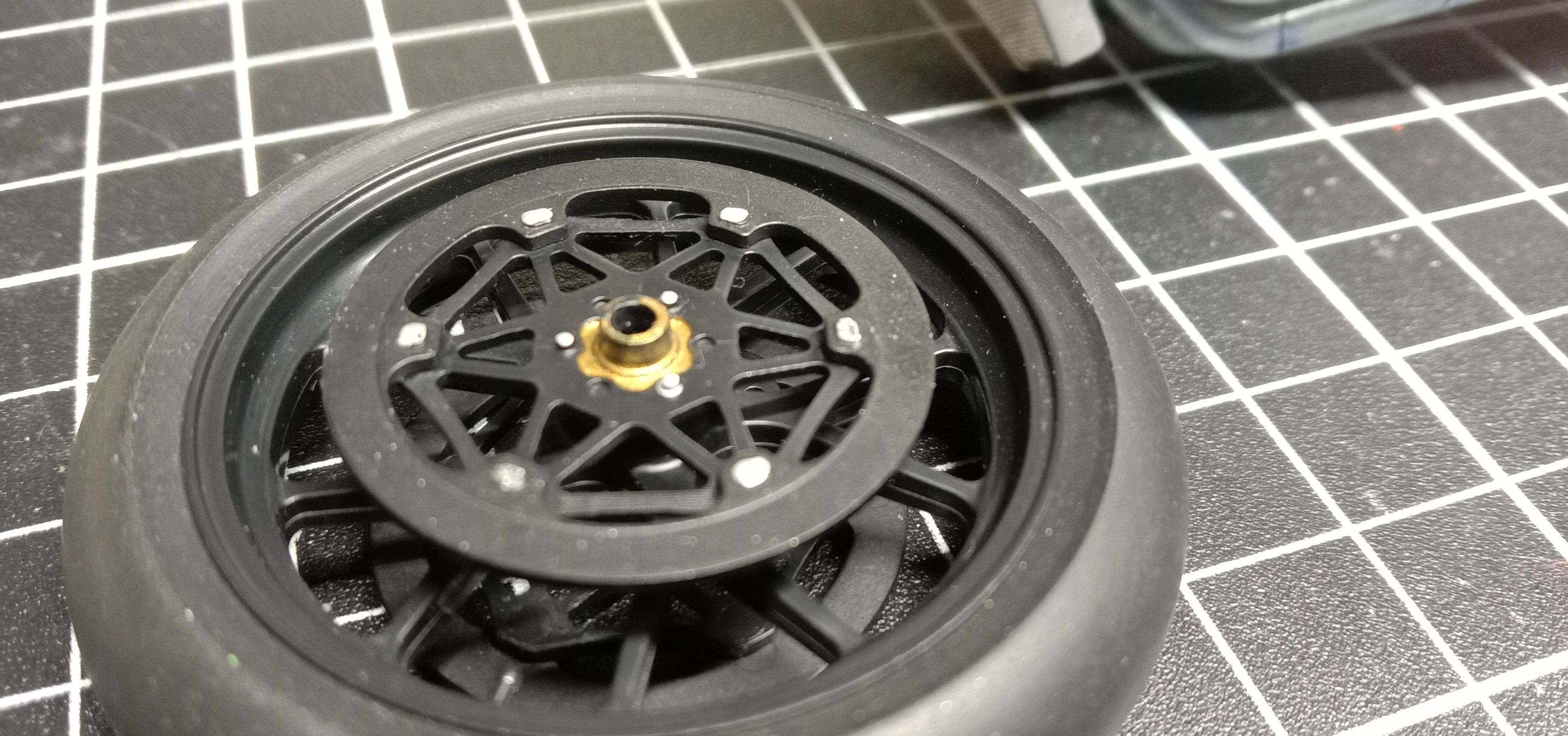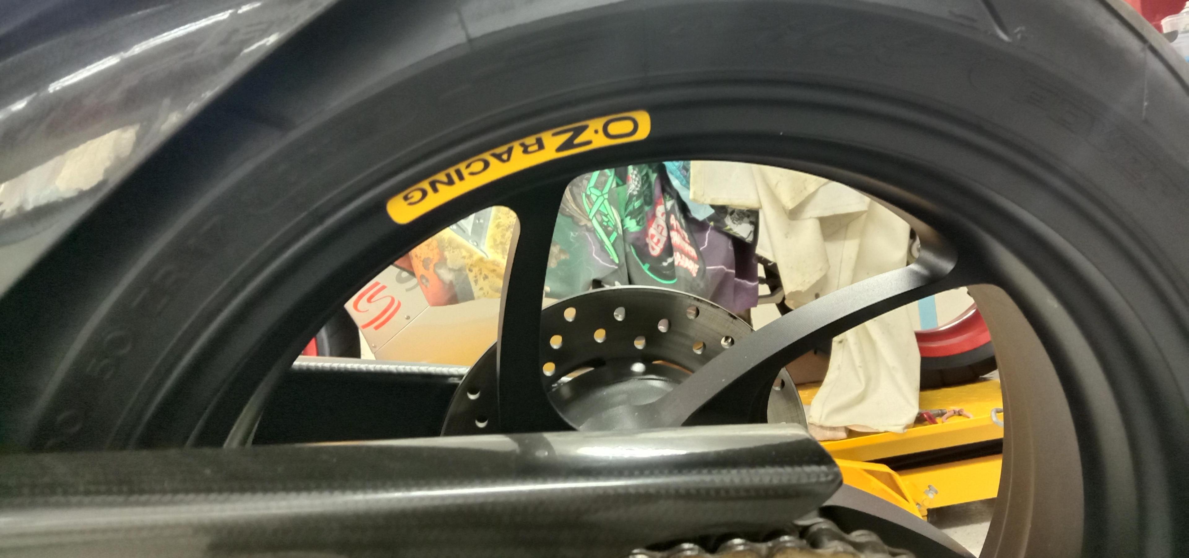 15. I wanted to try and get a carbon appearance on the brake rotors so I played around a bit with speckling a little silver over the SG black. I think it looks ok. Also got the exhaust system and radiator on. I tried for nearly 2 hours on the rim band decals and couldn't get them right so plain black wheels it gets! I may add some smaller decal like the Oz wheels have. Jim