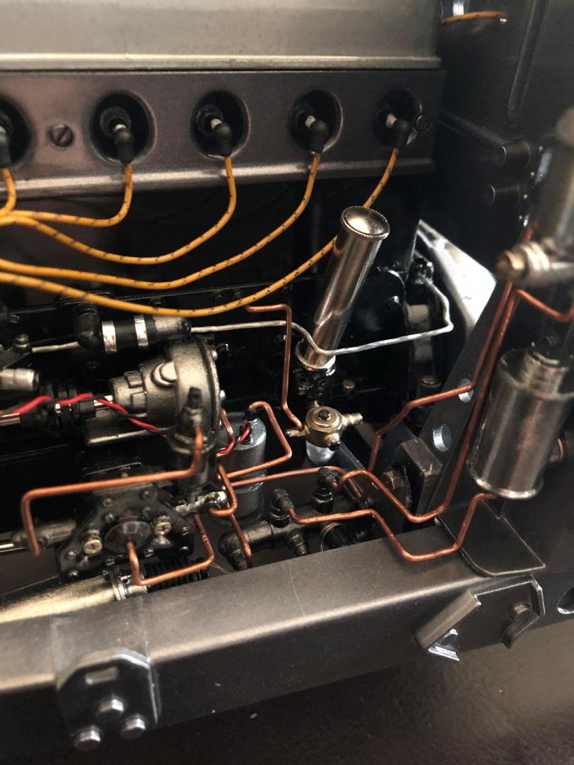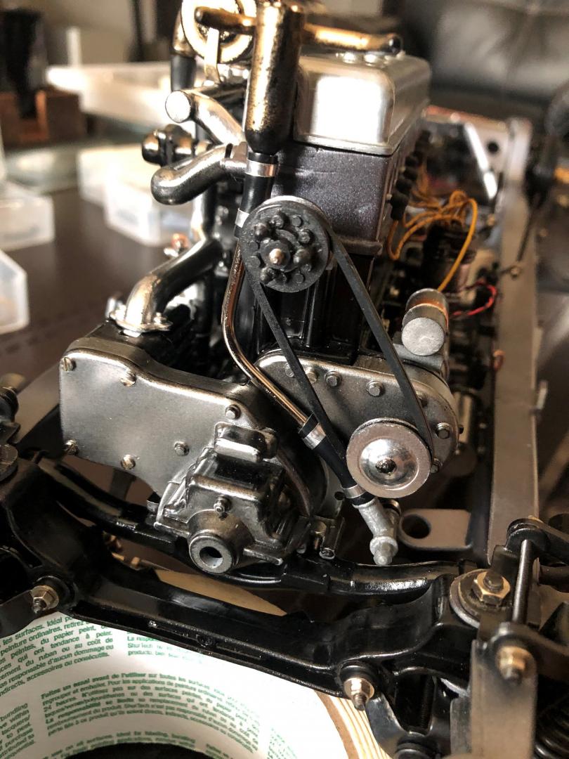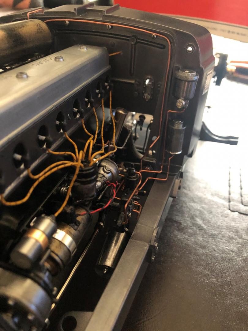 detail of the engine and all pipes , wires connection . my stage 2 of the completion is done , stage 1 was the fitting , stage 2 the painting and re assembly , stage 3 will be the body frame fitting, then painting , leather seat upgrade dashboard aluminium and mother of pearl , and all finals details . painting should be a blue .. still searching the one that will be matching the light beige or white leather seat ...