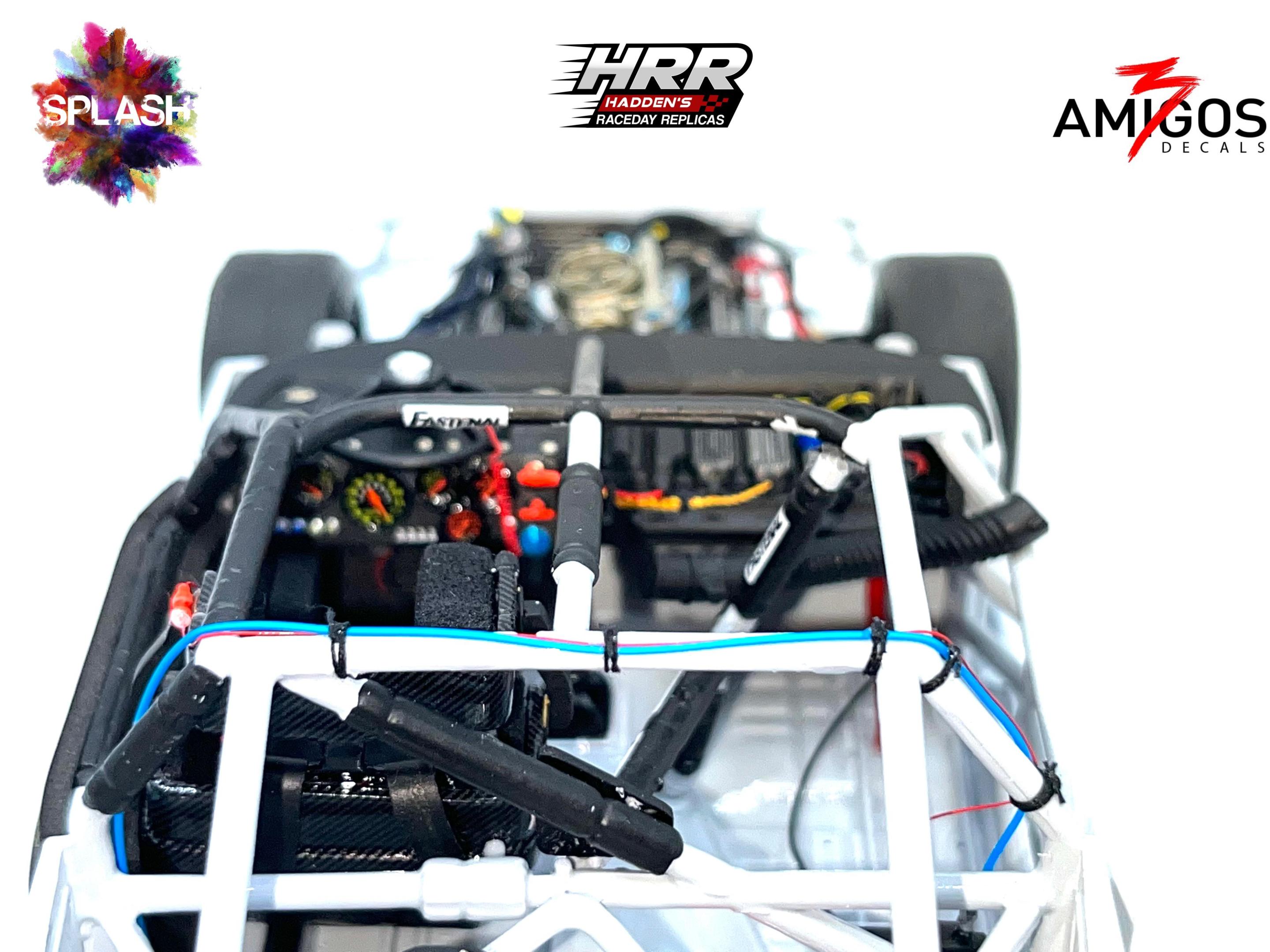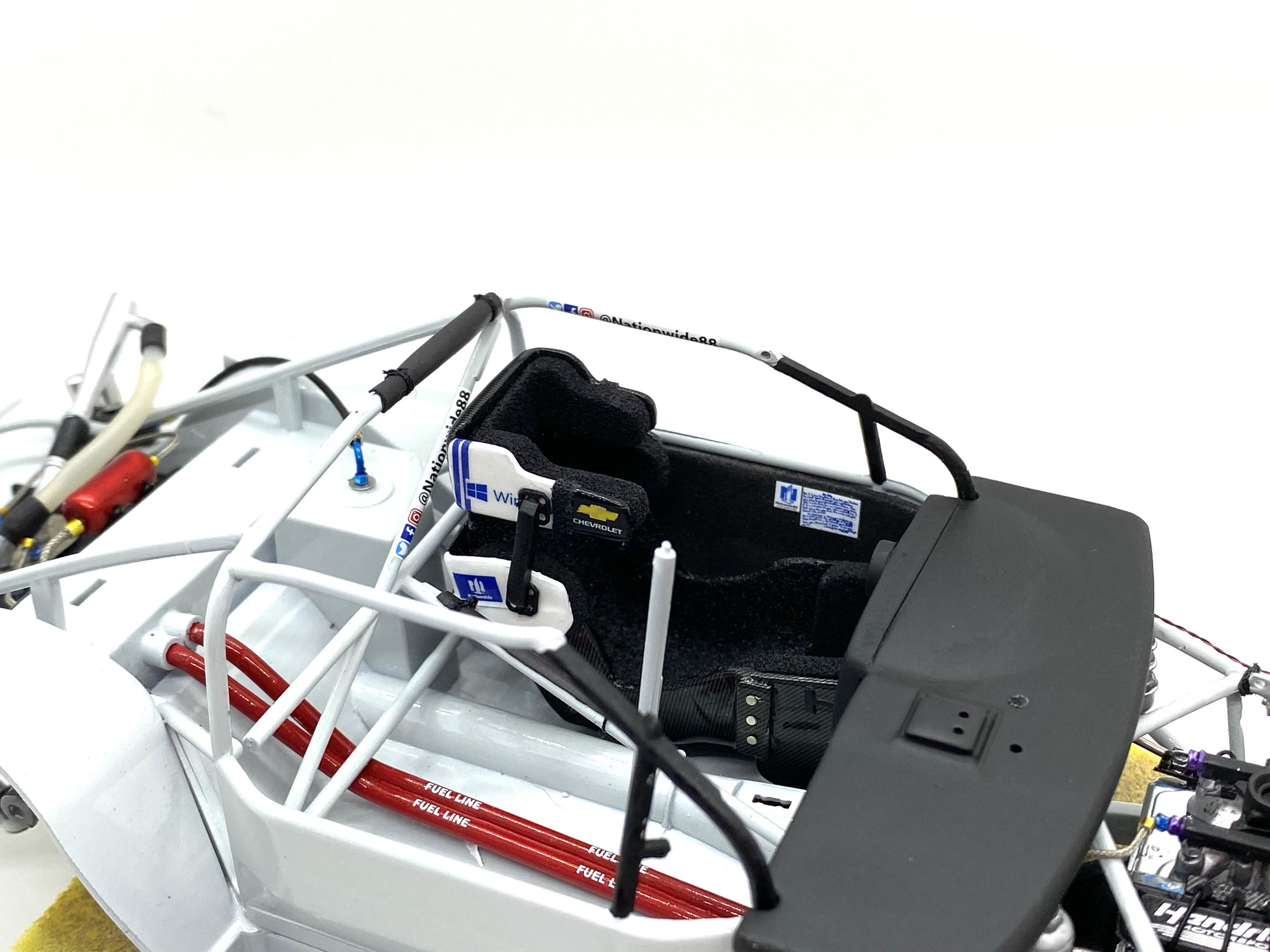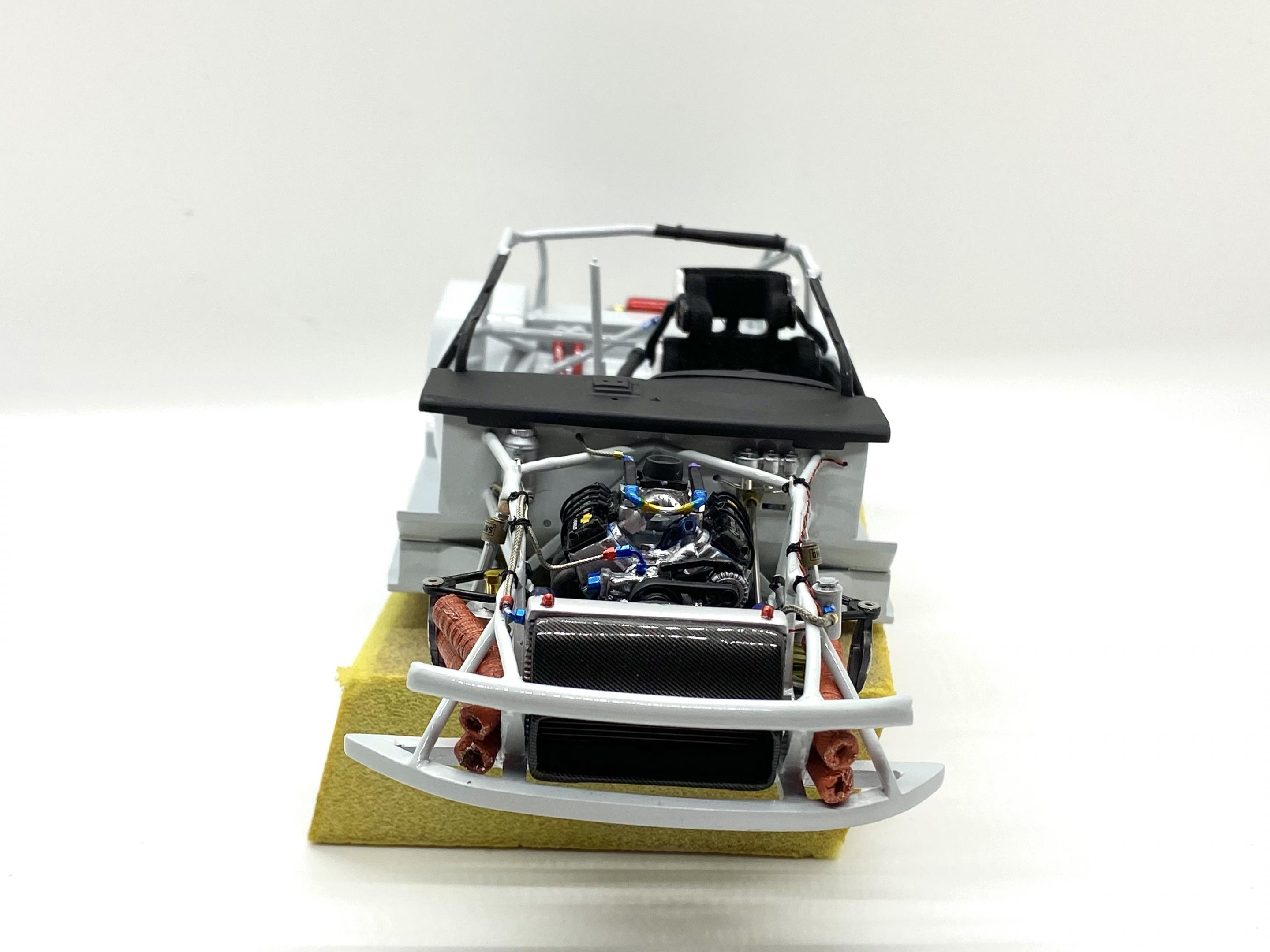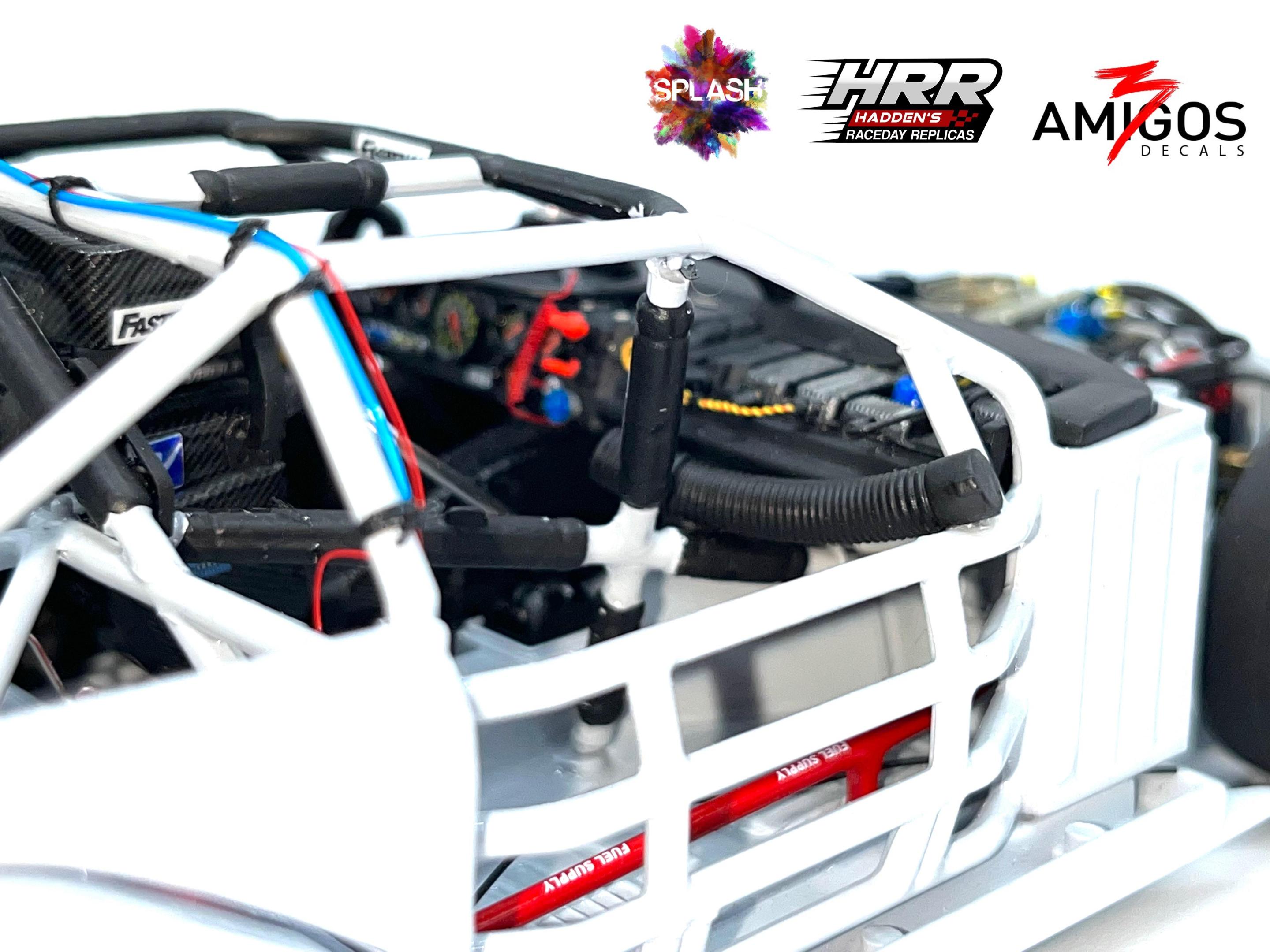 This one has been done for sometime now just getting around to posting it. This is a Revell kit, splash paints and 2k, 3 Amigos decals, also can’t thank Mark at MPR decals for the roof camera logos. I used a lot of protech fittings, a lot of detail nuts from rb motion, also fittings and wire from Detail Masters. I added the superspeedway splitter and bumper extensions. The helmet and HANS device are from GF Models.