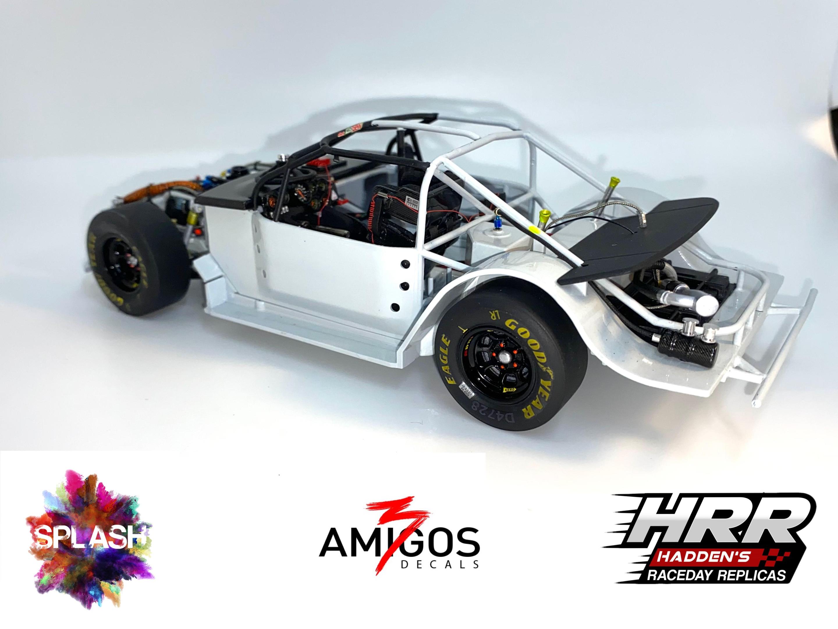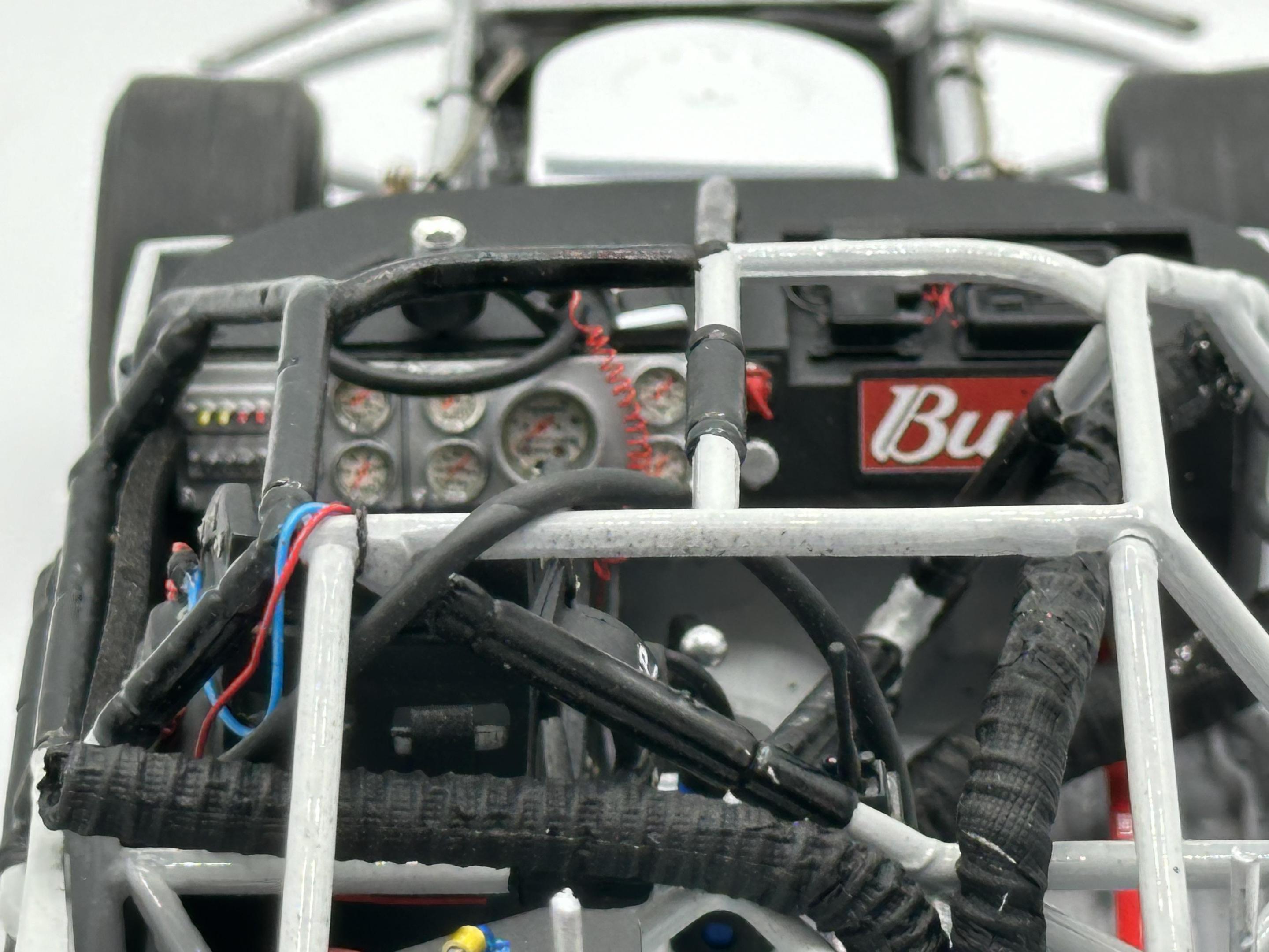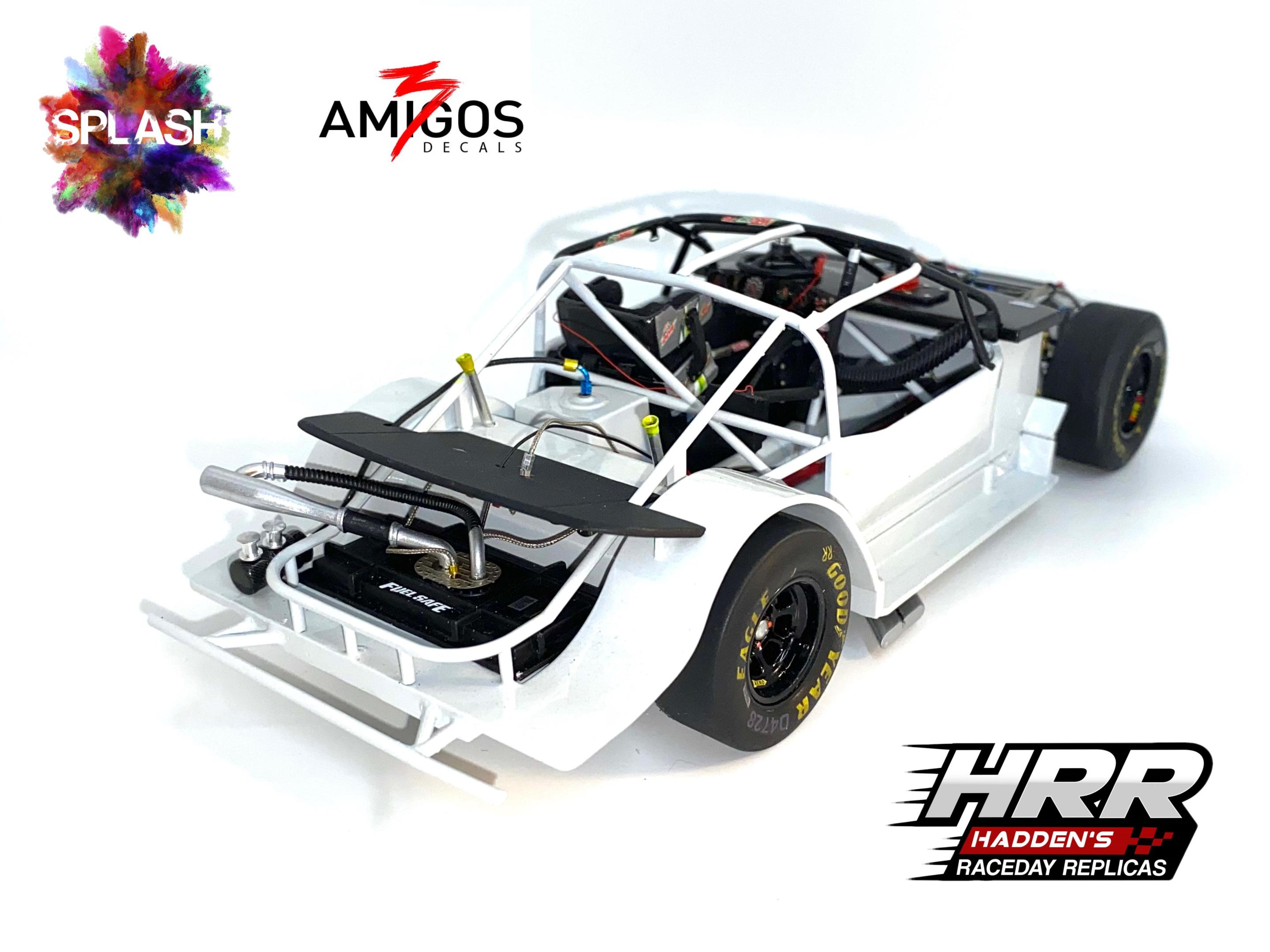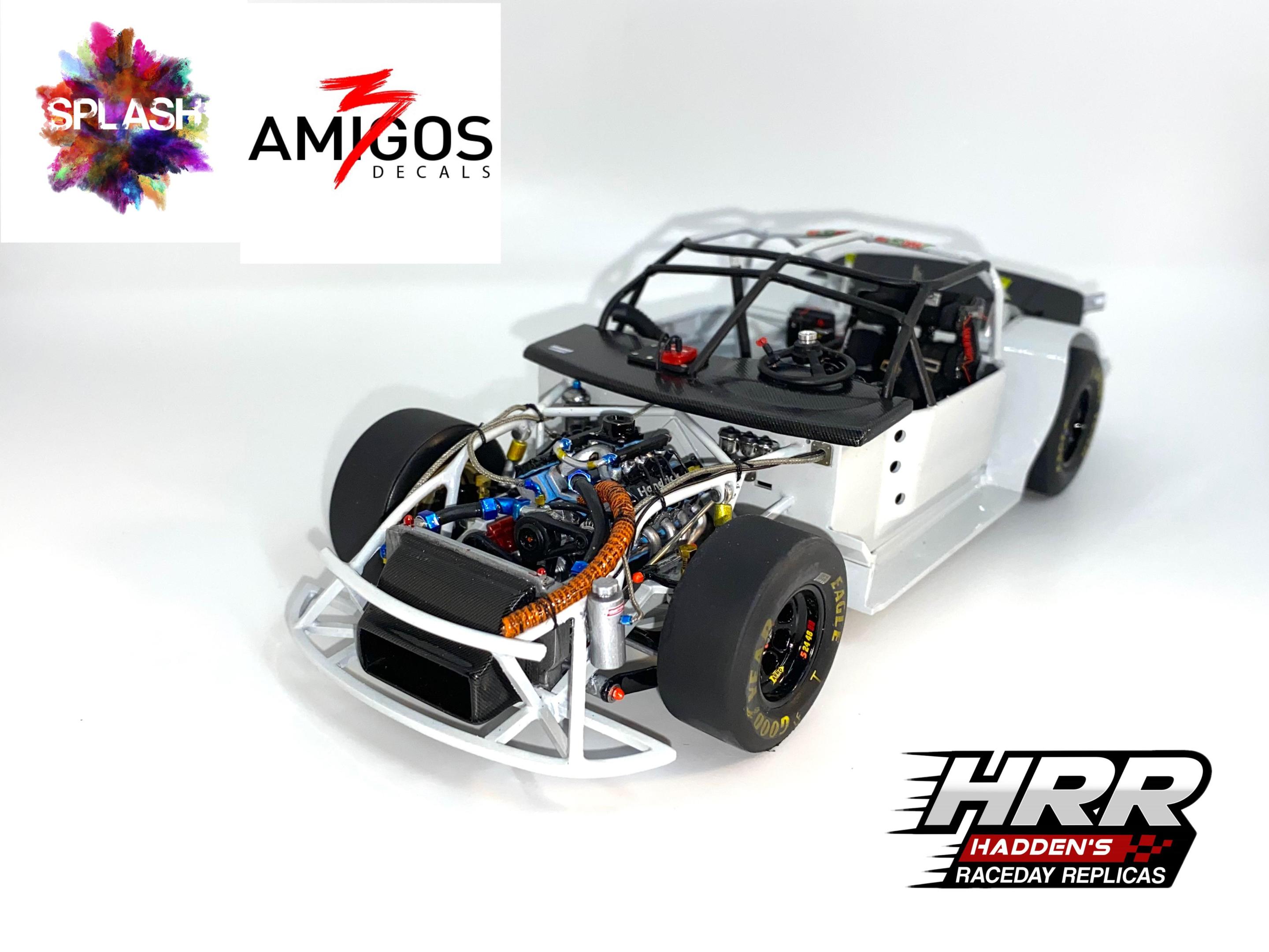 This one has been done for sometime now just getting around to posting it. This is a Revell kit, splash paints and 2k, 3 Amigos decals, also can’t thank Mark at MPR decals for the roof camera logos. I used a lot of protech fittings, a lot of detail nuts from rb motion, also fittings and wire from Detail Masters. I added the superspeedway splitter and bumper extensions. The helmet and HANS device are from GF Models.