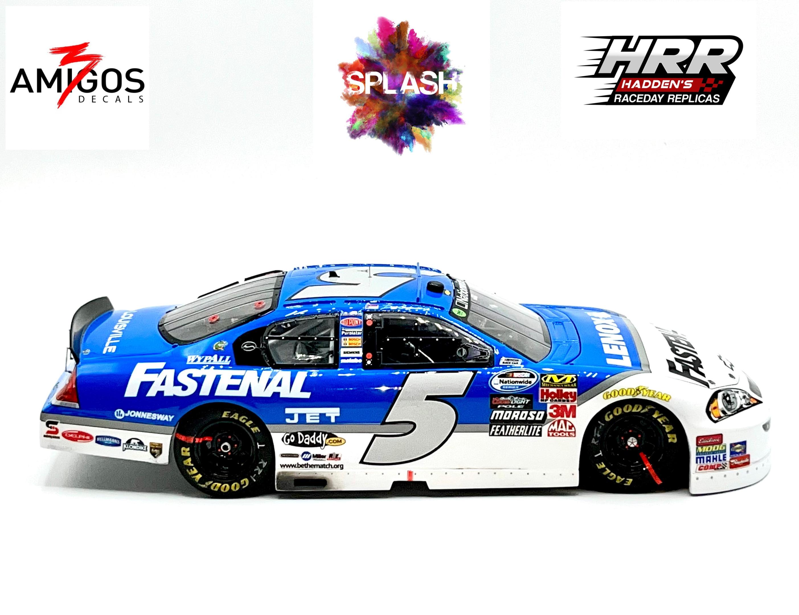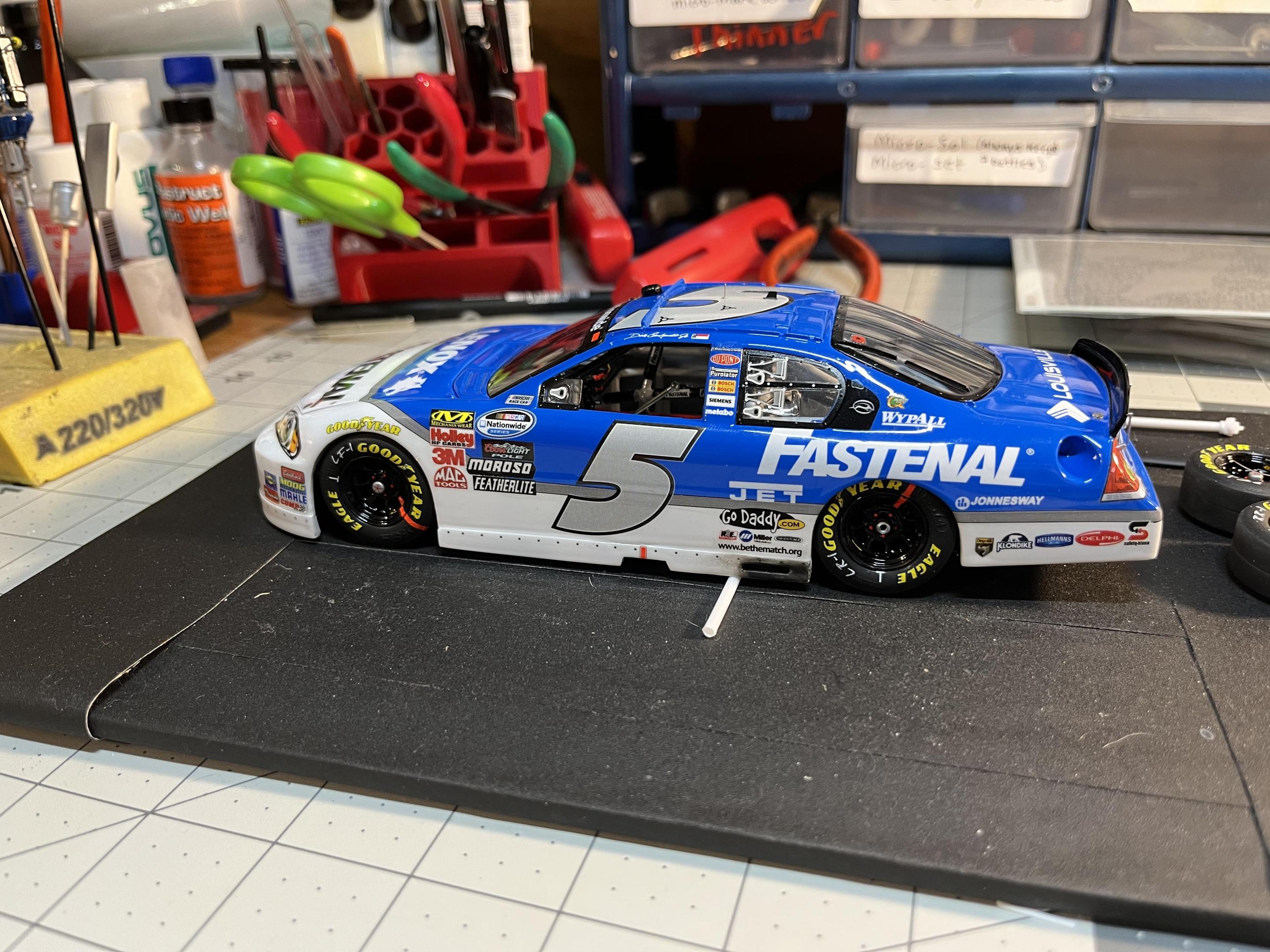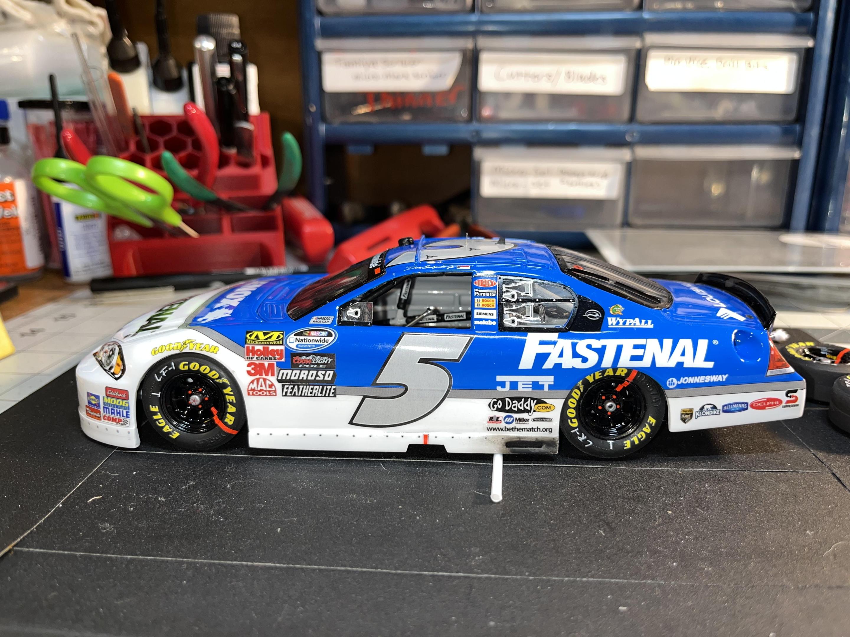 Finished up my 2009 Dale Jr Fastenal build, this was a 2007 Revell kit, modified the chassis, also reworked the nose with styrene and milliput to make the superspeedway package the nationwide series ran. Paint is from splash paints, also used the gloss 2k clear. Decals are from 3 Amigos. This was a fun build, still have some learning to do and trying to be a better builder.