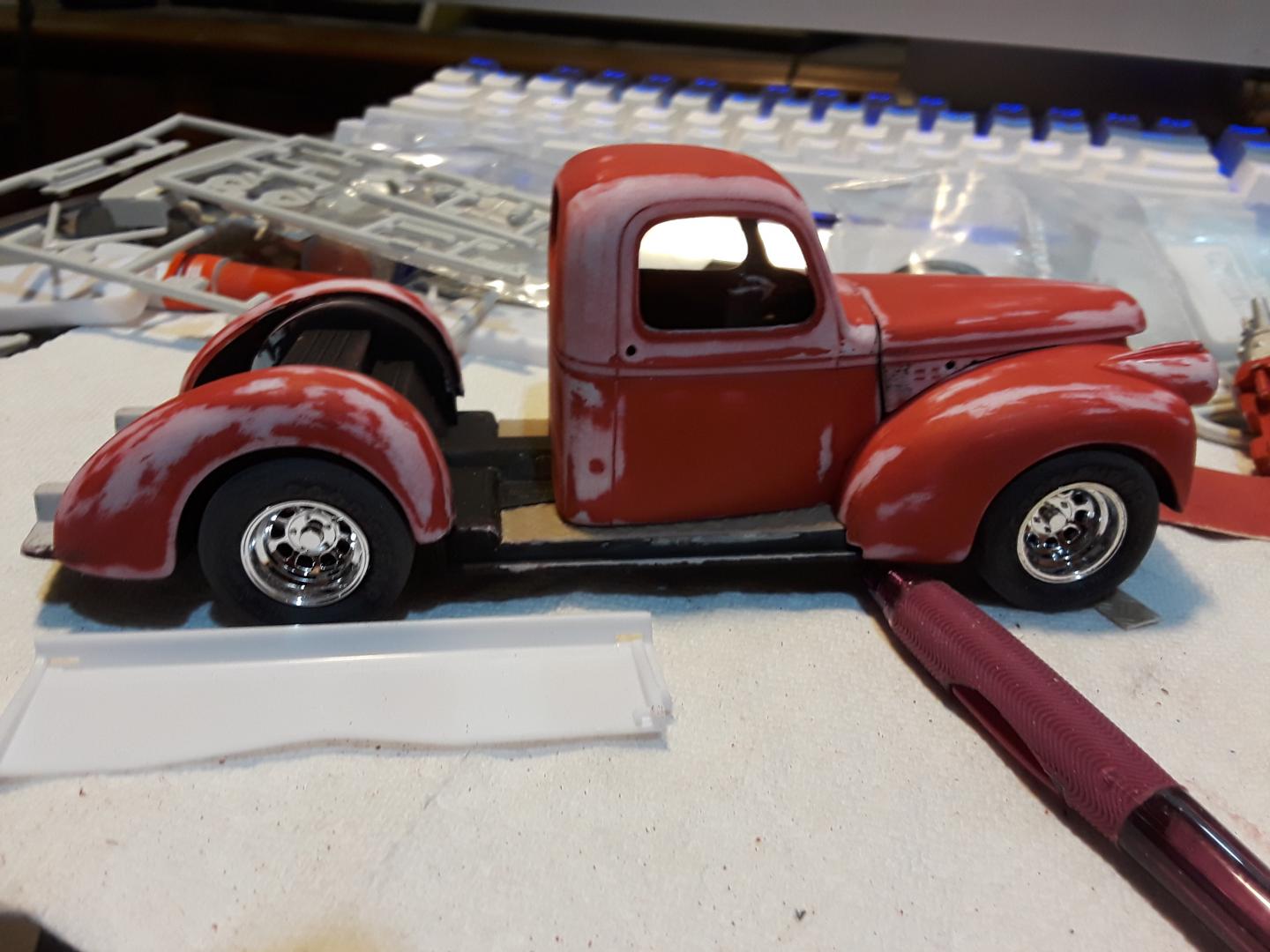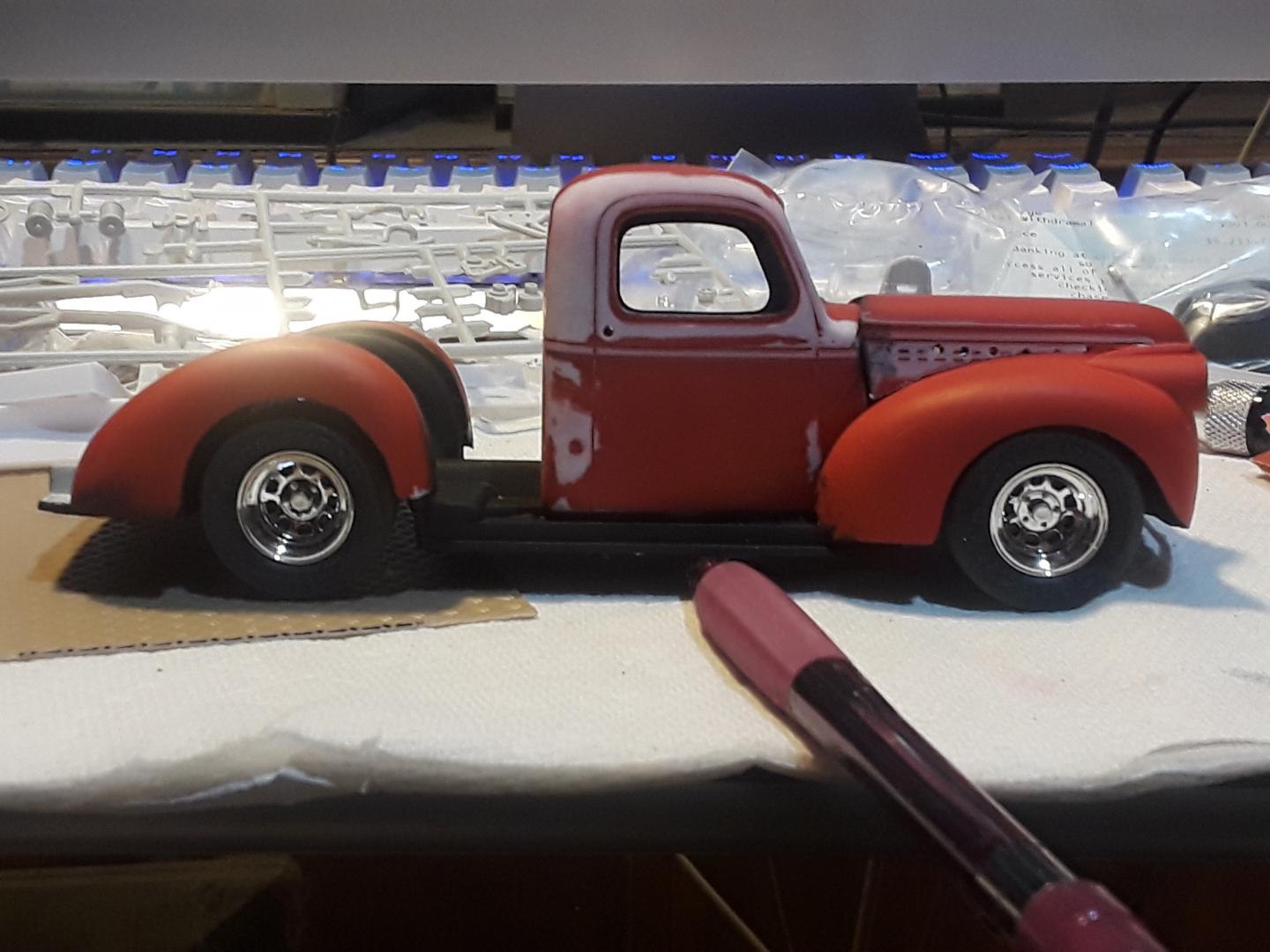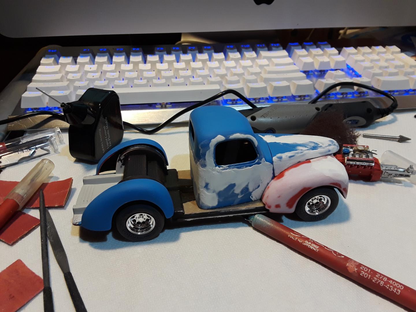 First post for me on this forum! Was happy to find this community. I'm working on building a fictional concept dirt track race truck that combines the power/speed of a NASCAR chassis and the idea of a "full-sized dwarf sprint" car. Starting with the basic AMT NASCAR Thunderbird (I think this is a mid 90's Bill Elliot Coors Light kit), I've been working on bashing an AMT '41 Chevy Pickup kit onto it. Thus far, all I've done to the NASCAR frame/tub is to clip the front radiator shroud and trimmed down the firewall to fit/work with the '41 Chevy cab/engine well. Most of the time, when I do NASCAR->Real Car builds, I do a lot of heavy altering to the race frame and such, so this one has been a little different for me. The first major modification to the stock truck body that I've done is to section the cab/hood down about (what I think is) 6 inches. I left the fenders full size so far, because I like the look of the big, sexy and aged swells that they give to the vehicle. I thought about chopping the top a little bit, but I think I'm going to keep it stock, because it gives the whole thing that great look that dwarf sprints give with all of the old-timey scaling that you see on them. Regarding the back fenders, I'm working to extending the bottom forward portion down to match the same height as the front fenders, and then building the connecting, pared-down running boards out between the front/rear fenders. By using the NASCAR tubbed chassis on the back end, I'm widening the bed-stretch about 12" from wheel to wheel between fenders to allow for the NASCAR rear-end and wheels/tires to be used. I still haven't decided whether I'm going to extend the insides of the fenders and use the stock bed width, or stretch the bed out to the wider fender stretch. Any thoughts or input would be welcomed! Here's a few pics of my frankenstrosity mocked up with the NASCAR wheels (still working on getting the sectioned hood/cowl into plane...the pencil is holding up the chassis to show how the wheels should look after the suspension is put in):
