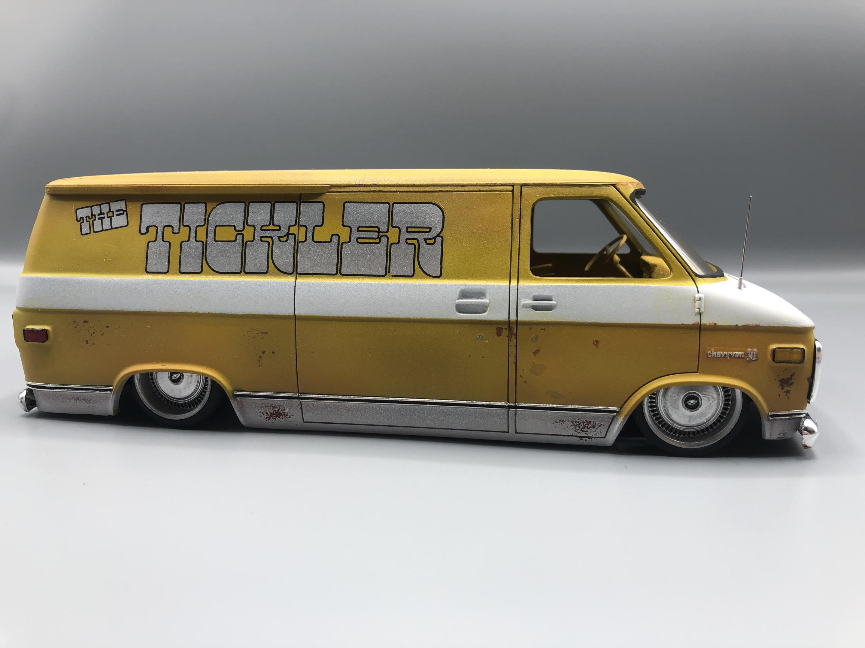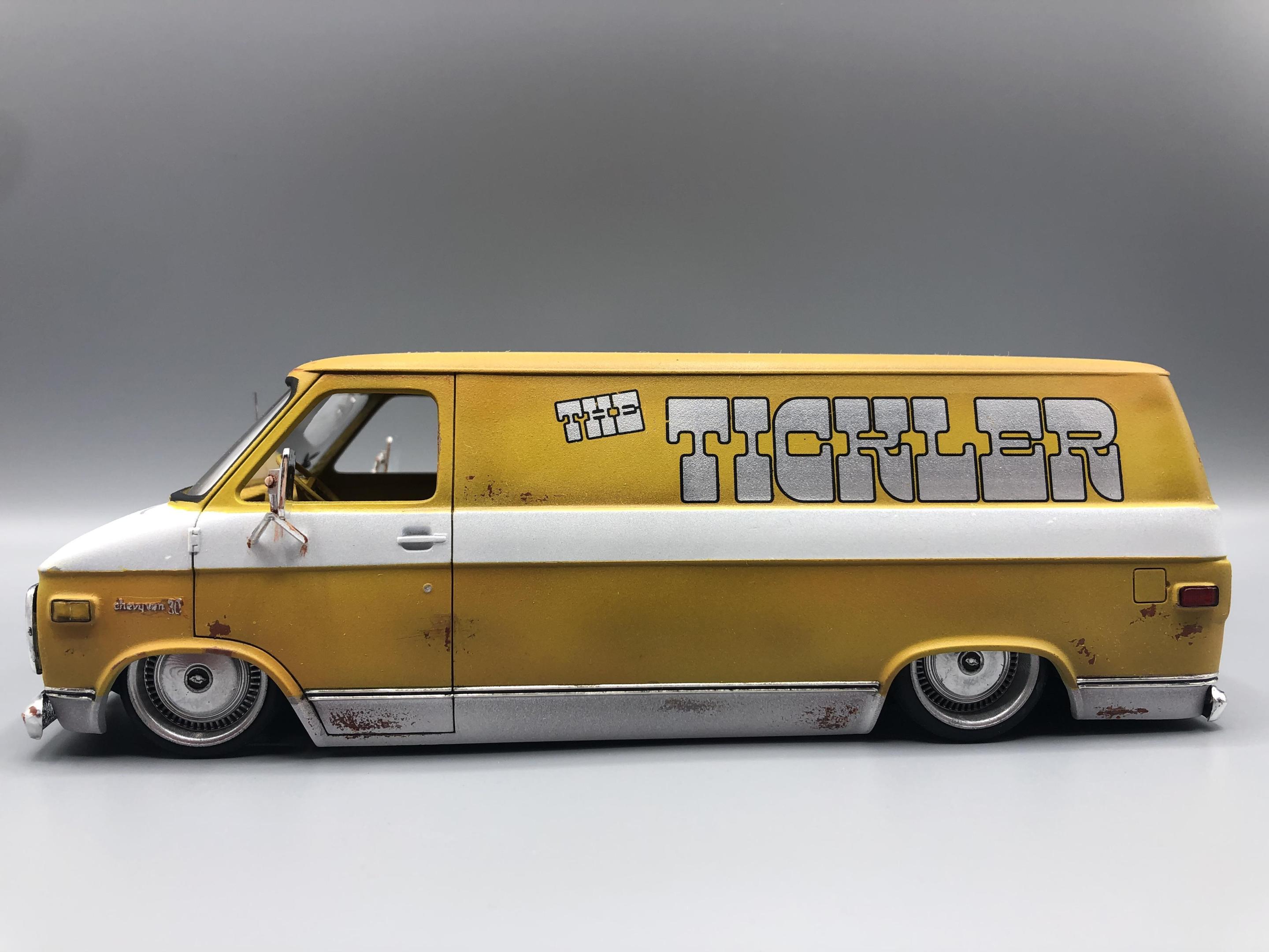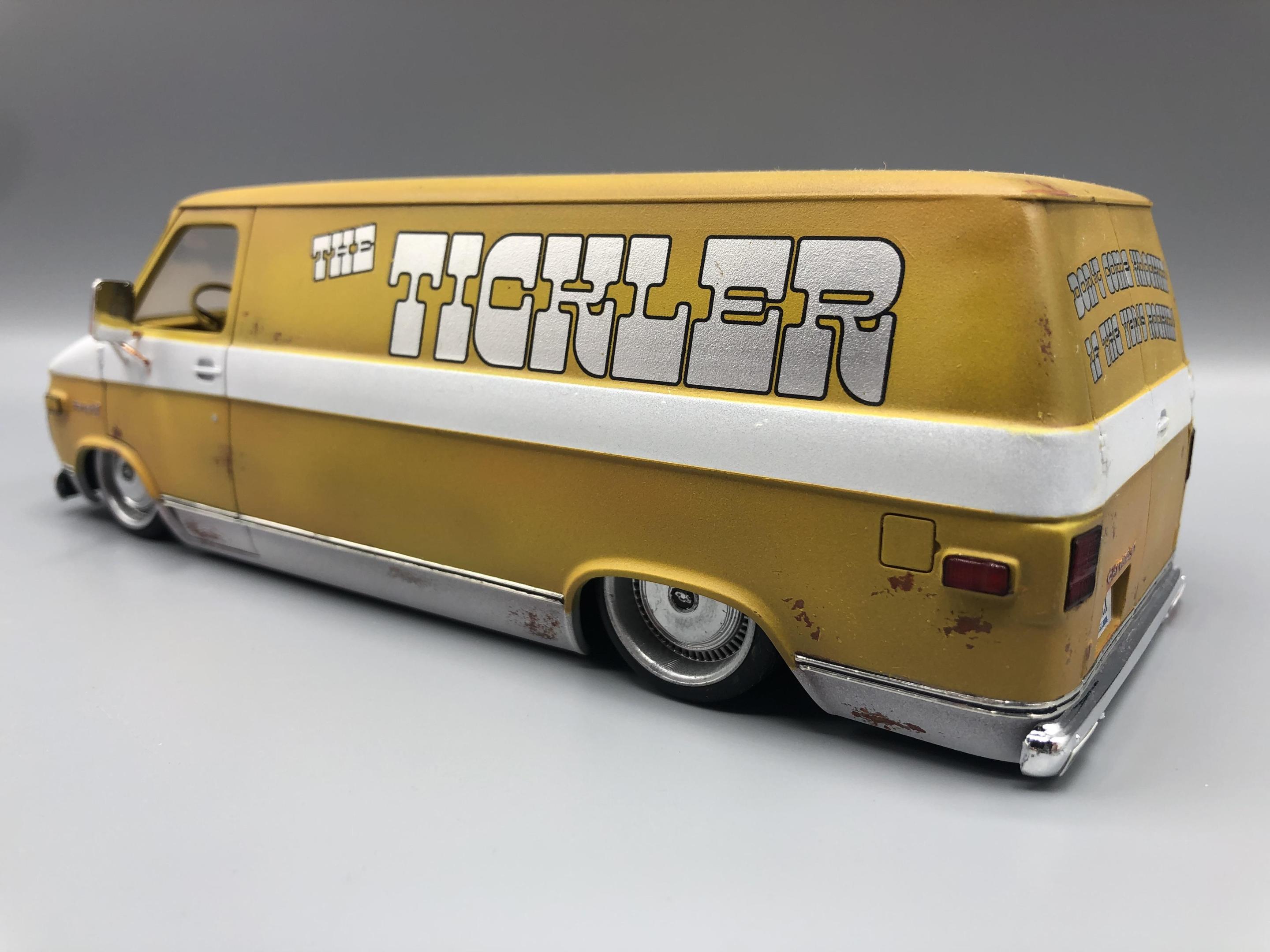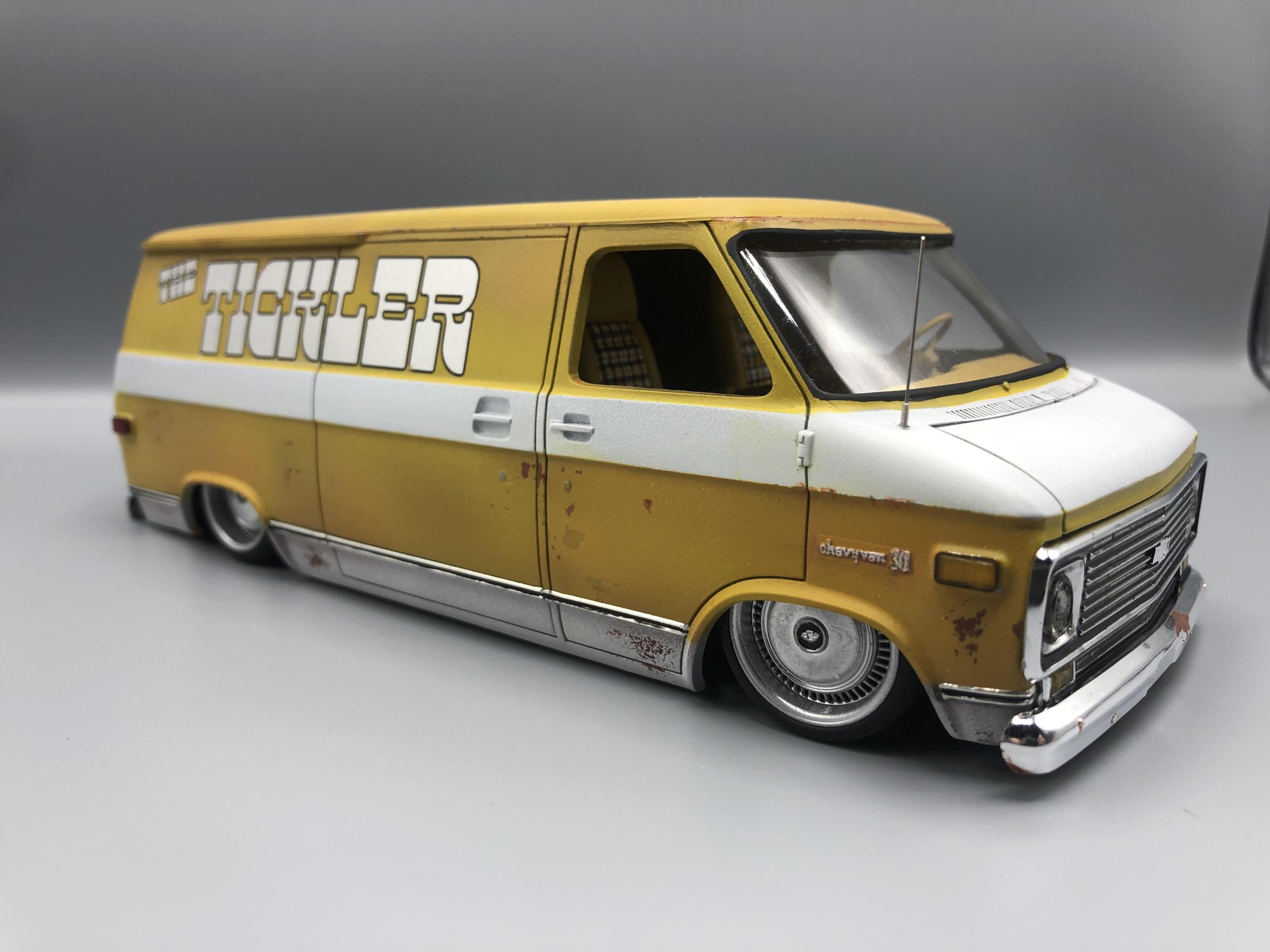 1976 Chevy Van - "The Tickler" built in a 70's boogie van style with Weathered appearance and a Slammed stance, ZForcemodelworx wheels and tires, custom decals, 3D printed Keg tap handle for column Shifter, Kens Fuzzy Fur interior, self printed seat pattern inserts. Zig Zag front plate, Norml bumper sticker, larry flynt for president bumper sticker