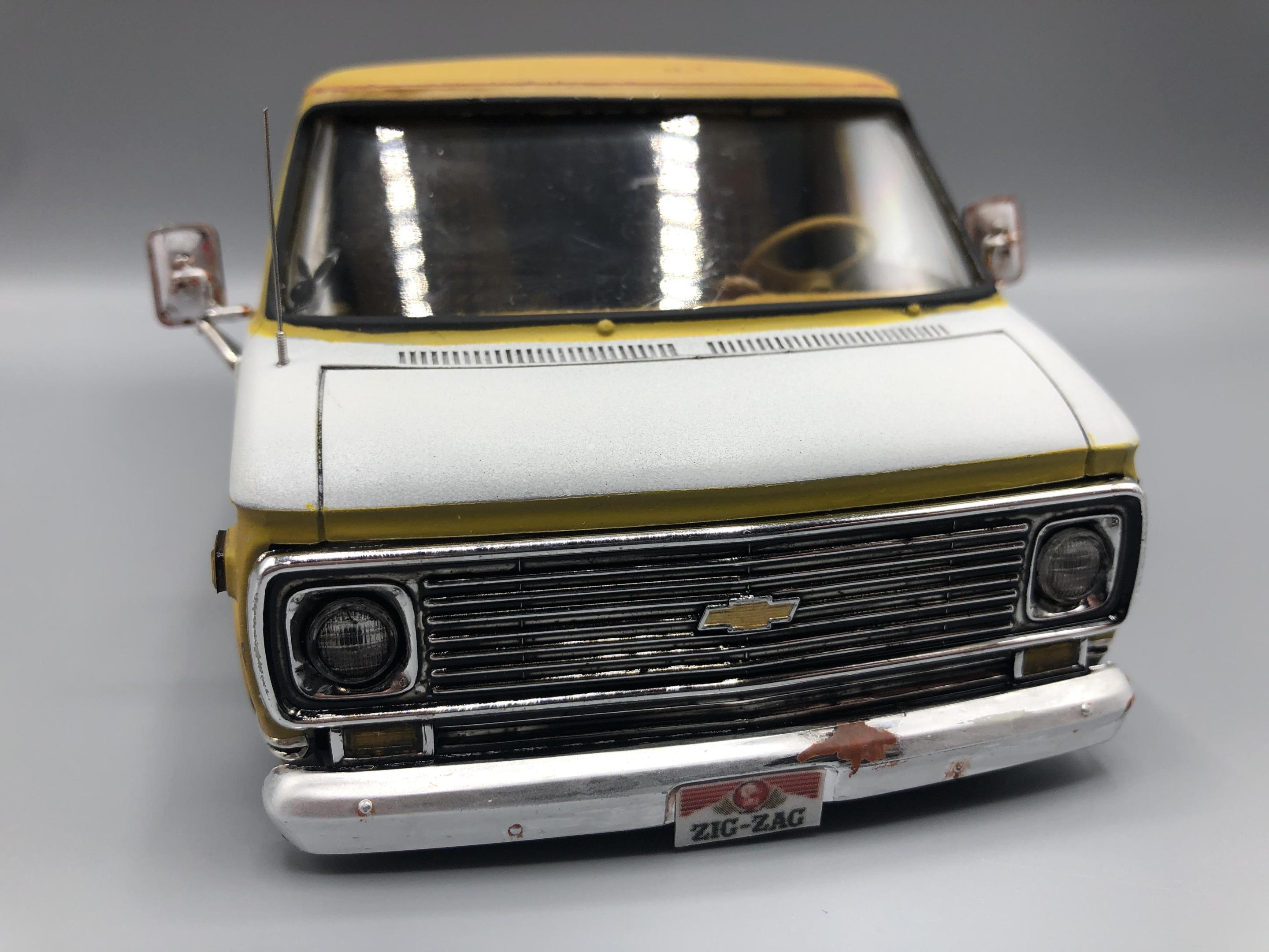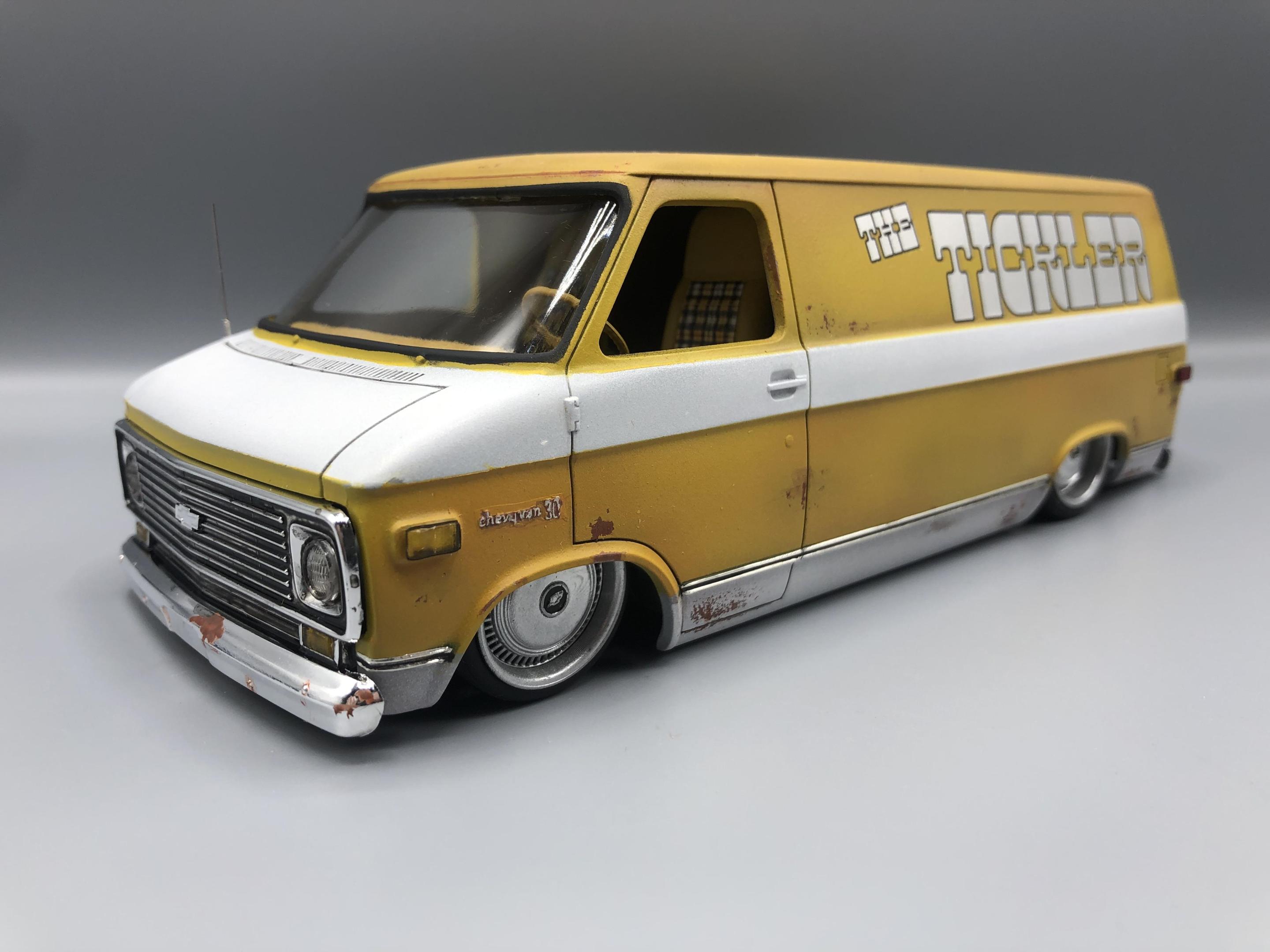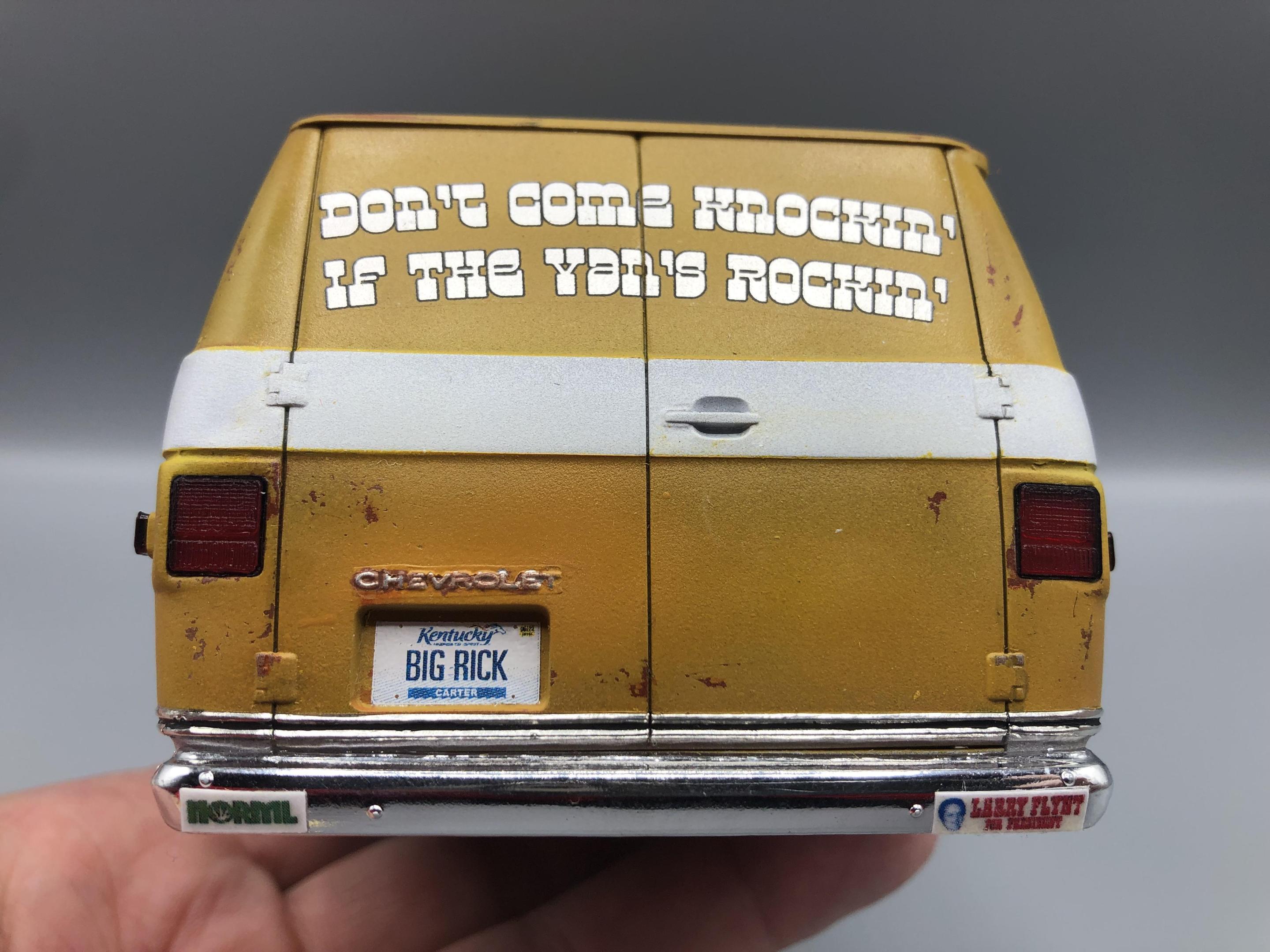 1976 Chevy Van - "The Tickler" built in a 70's boogie van style with Weathered appearance and a Slammed stance, ZForcemodelworx wheels and tires, custom decals, 3D printed Keg tap handle for column Shifter, Kens Fuzzy Fur interior, self printed seat pattern inserts. Zig Zag front plate, Norml bumper sticker, larry flynt for president bumper sticker