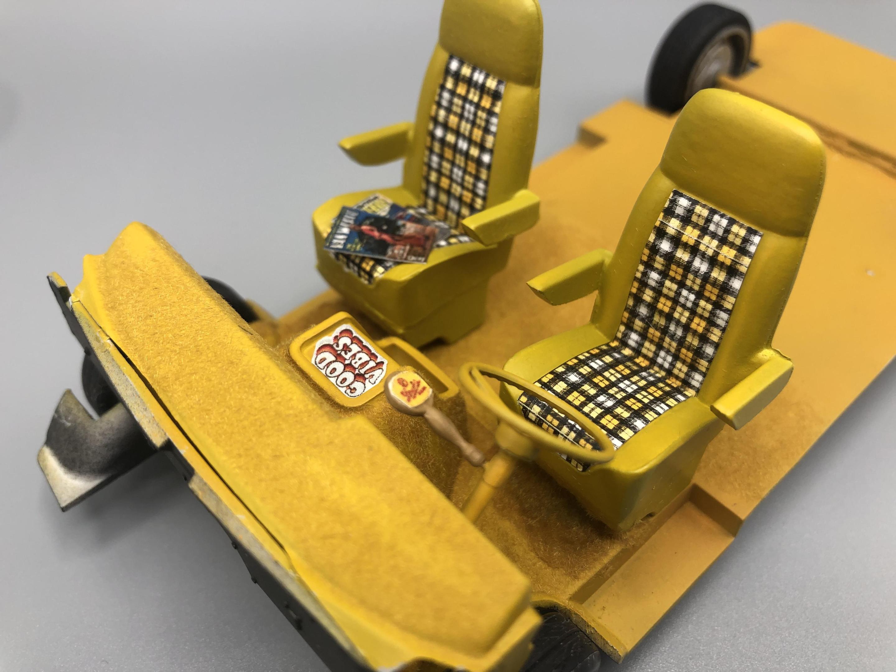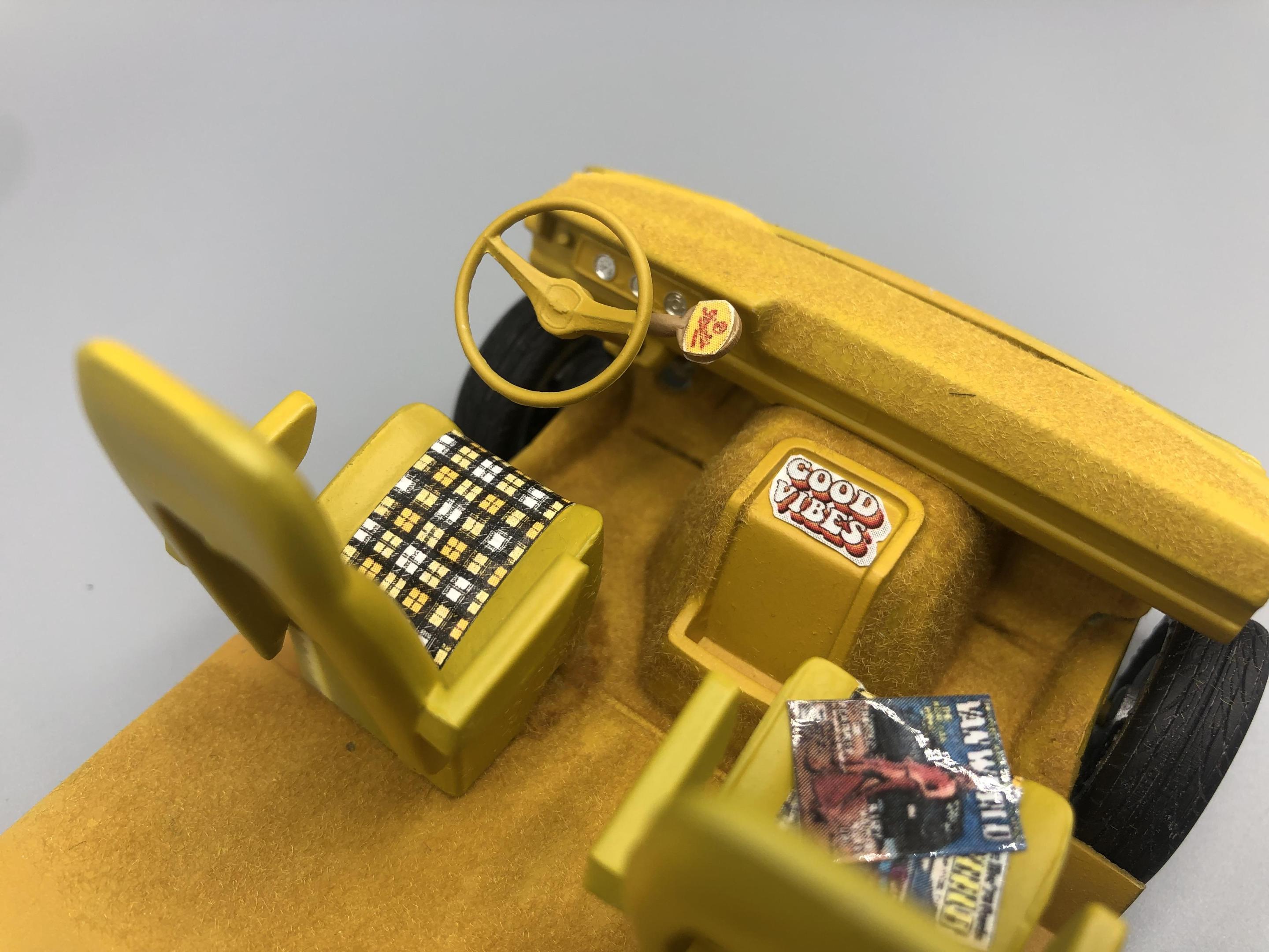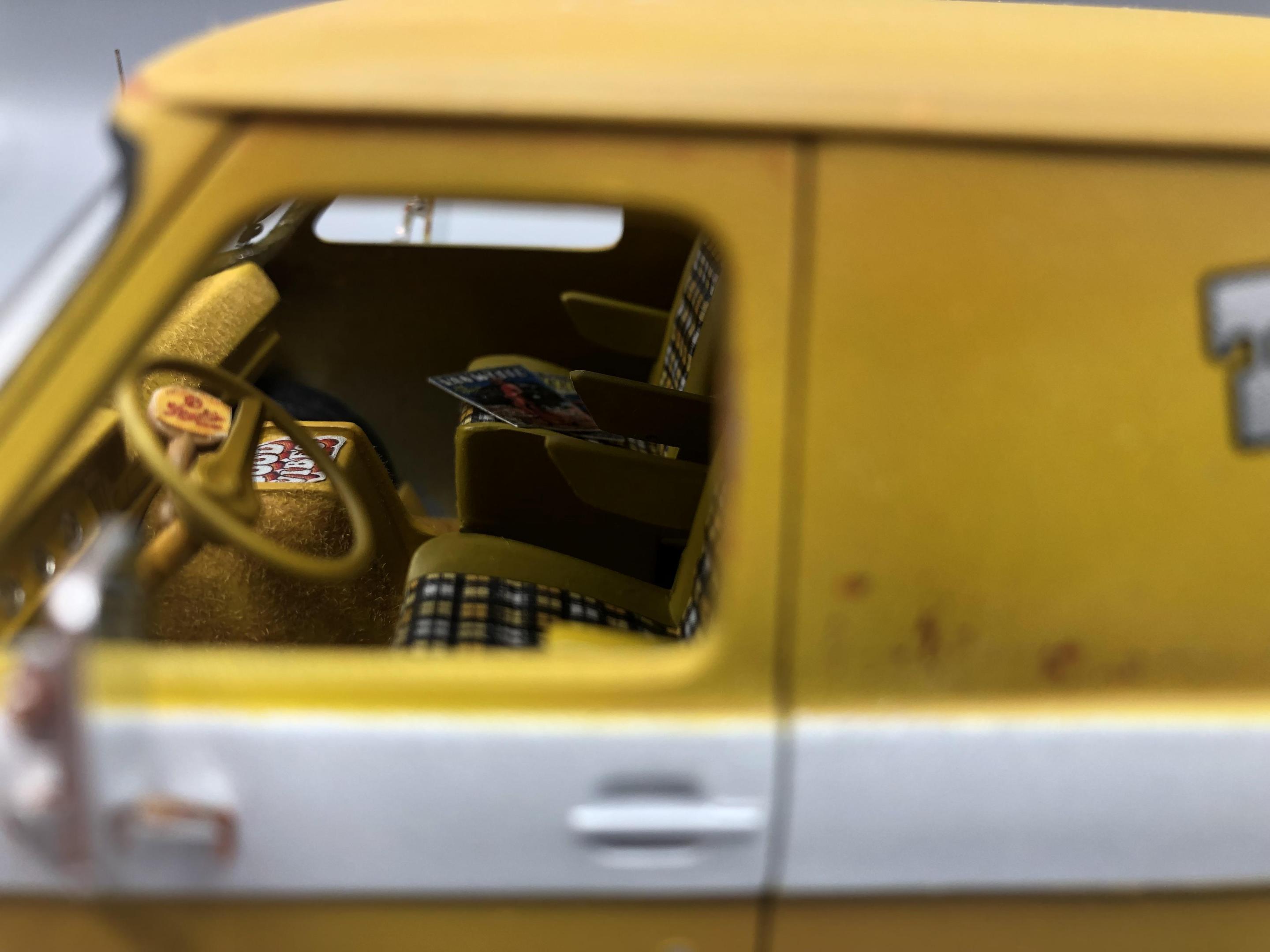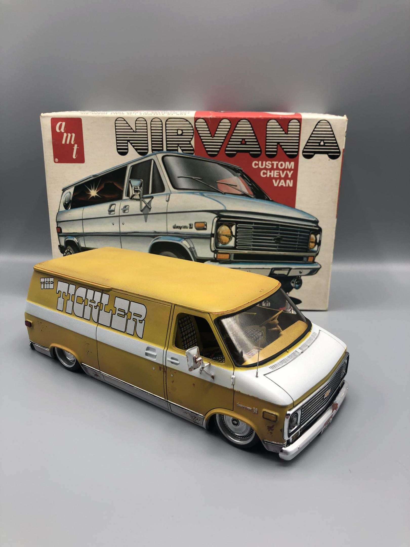 1976 Chevy Van - "The Tickler" built in a 70's boogie van style with Weathered appearance and a Slammed stance, ZForcemodelworx wheels and tires, custom decals, 3D printed Keg tap handle for column Shifter, Kens Fuzzy Fur interior, self printed seat pattern inserts. Zig Zag front plate, Norml bumper sticker, larry flynt for president bumper sticker