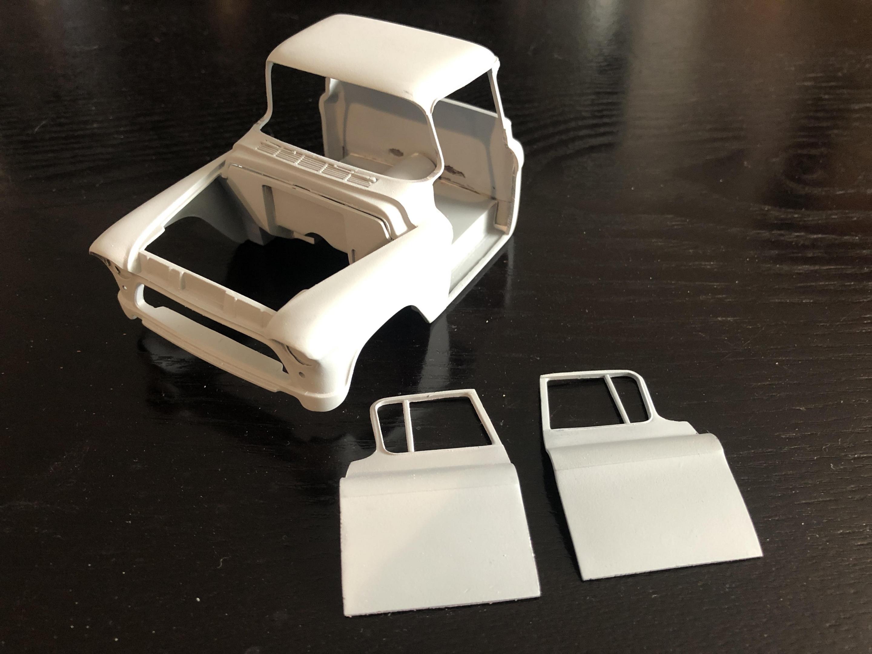 Hey All !! Finally, back at the hobby table! (health issue got in the way) BUT,.... back at this project,... hoping to finish one day (never in a hurry, good things come if you wait) Anyways scratched built an interior/firewall tub for this truck so she will stayed slammed to the ground! I think they call it "channeling" (not sure) then opened the doors! The 'A' piller is brutally thin with the 55 so my 1st attempt went south!! Butchered the cab and found another one on eBay. This time instead of scribing the doors endlessly Grrrrrr! I took the smallest drill bit I had in my arsenal and drilled a million and one holes down the door seams. Then used a X-acto knife razor saw to cut the doors. Doors and door jam clean up,... it just might work!! Gotta to remember to leave enough gap for primer, paint, clear coat or like many other shoulda, coulda projects the doors will function like they should. So, .... small update but hopefully staying at the bench for awhile!! -