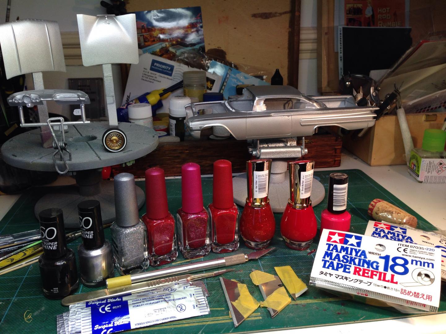 I'm currently in love with lowriders and bombs. There's something about the detail and the colours that fascinates me. I'm trying to improve my paint skills, so lowrider paint jobs are a great way to learn new techniques and get creative. So I've got my supplies ready: tamiya tape, new #11 blades, 4 different width line knives, 6 shades of glitter nail polish and 3 solid colours. I'm going to freestyle my design. The horizontal surfaces will be patterned with shades of red with pinstripes in silver and the sides will be mica white with some subtle pinstripes in silver. The gold Daytons will either be stripped and painted red/white or red candy over the gold. I'll try and post the steps of taping and painting, as I go.