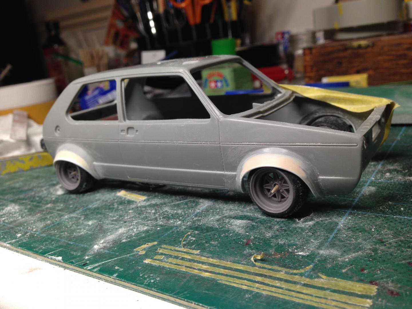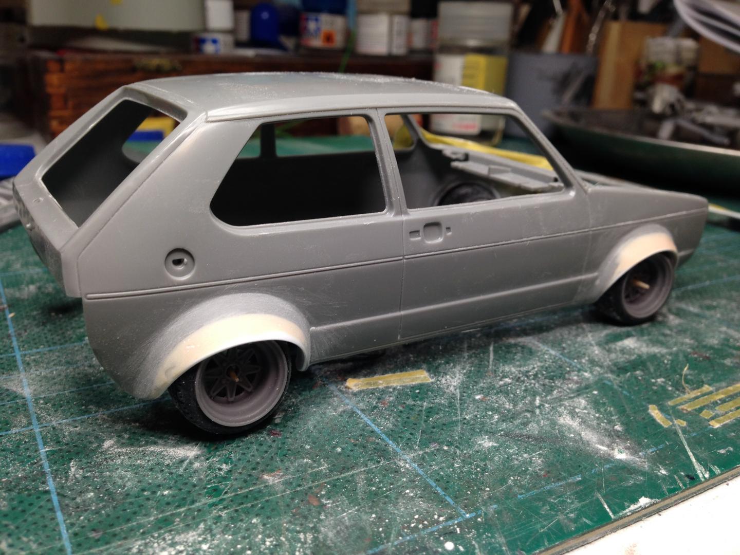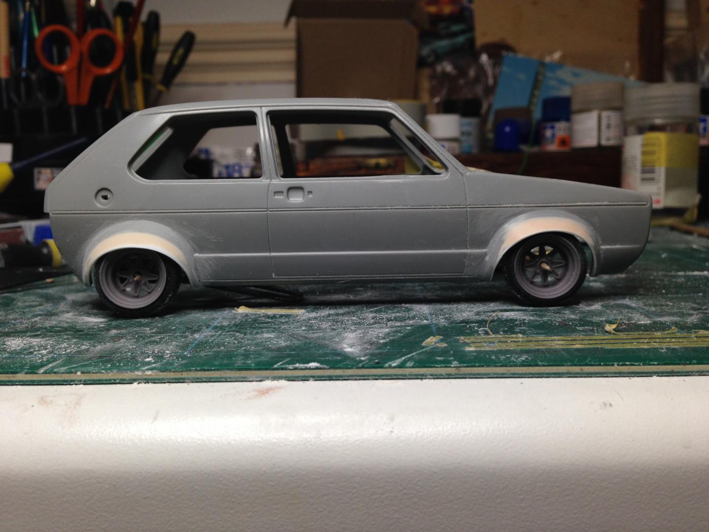 After a lot of thought, I decided to make my own flared arches. The Aoshima ones were too big and I wanted to retain the original arch radius. a bit of suspension tweaks and it'll be sitting quite low on these 13's
