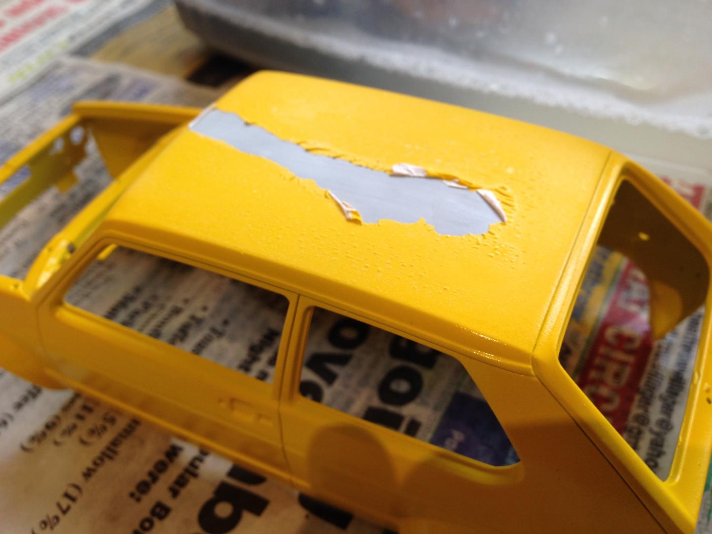 DISASTER!! I have just discovered that Vallejo acrylic paint, topped off with Klear, is way less durable than automotive paint. I was giving the Klear a wet-sand and the roof began to bubble. Then this happened ?
