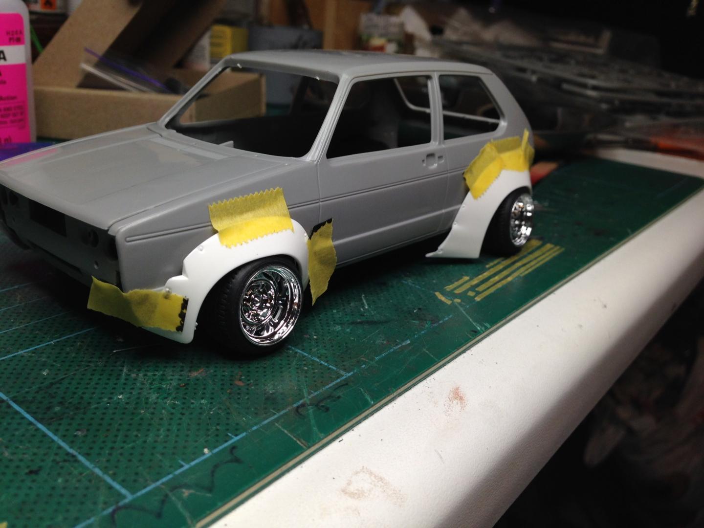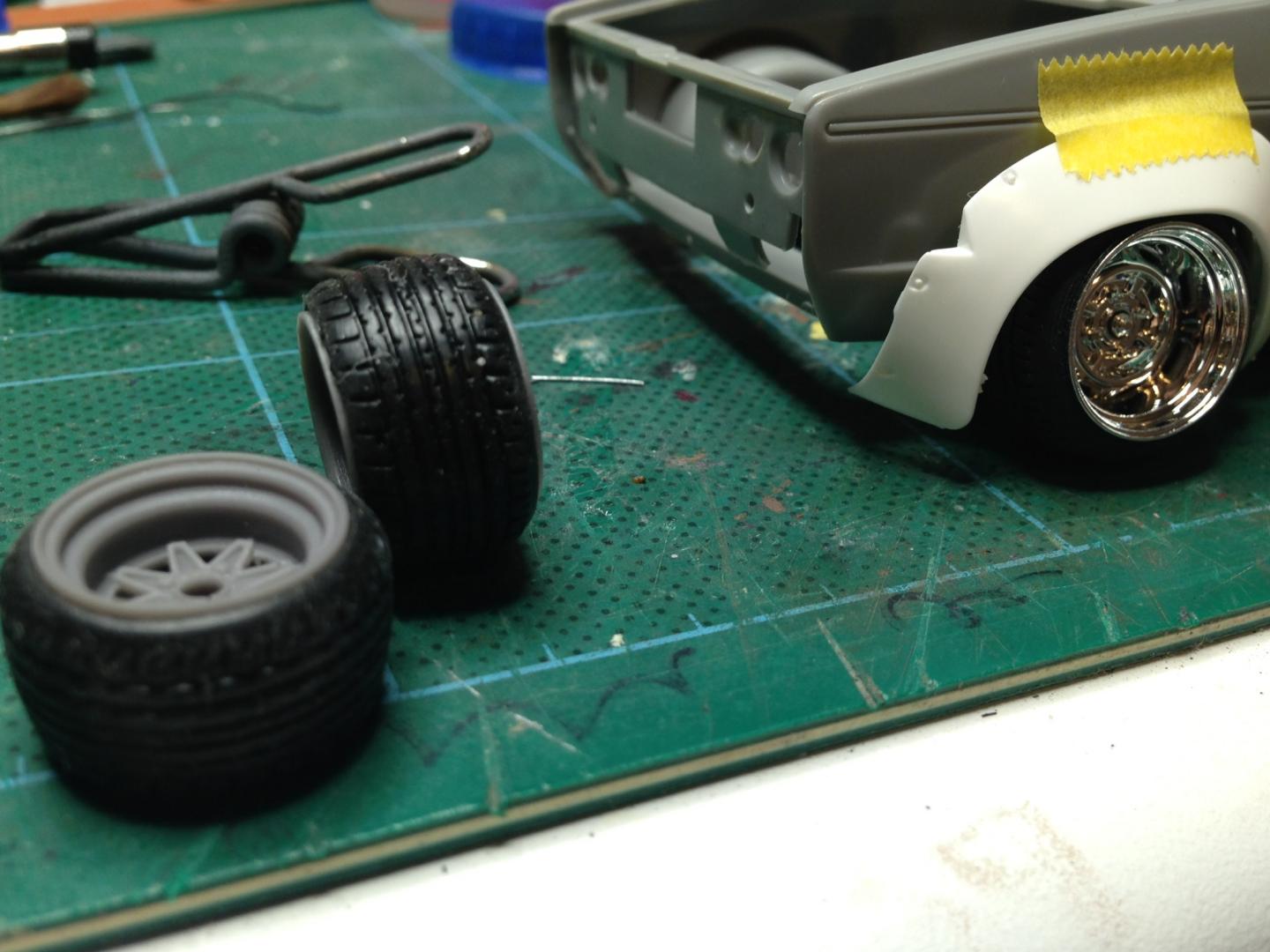So, a quick build turned into a longer one after I deliberated over wheels. I ended up buying two sets from some dudes in Japan and one set from a matey in Ukraine. I can't decide whether to modify these Aoshima flared arches, or cut n wedge the body arches and blend them with filler. I'm using 14" wheels, as my research shows these are a popular choice with the Dub crowd. the Chrome rims are Aoshima and the resin ones are Scale Productions. Both have asymmetrical stance tyres.