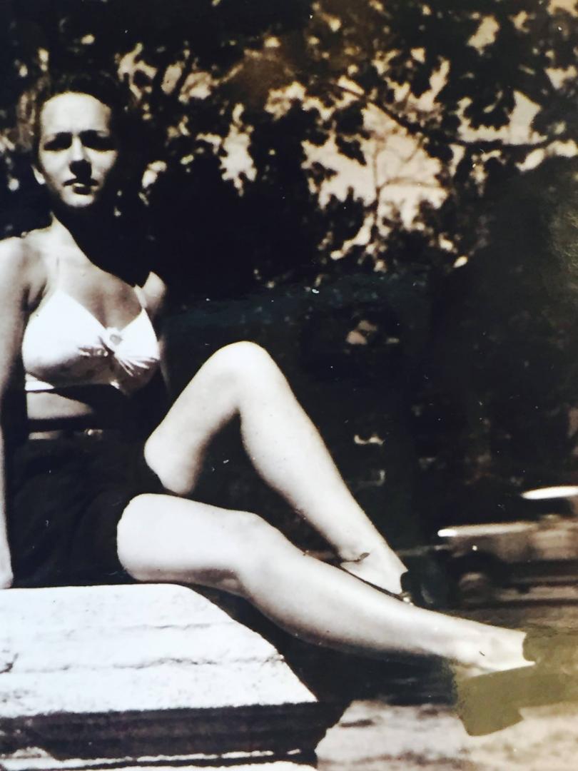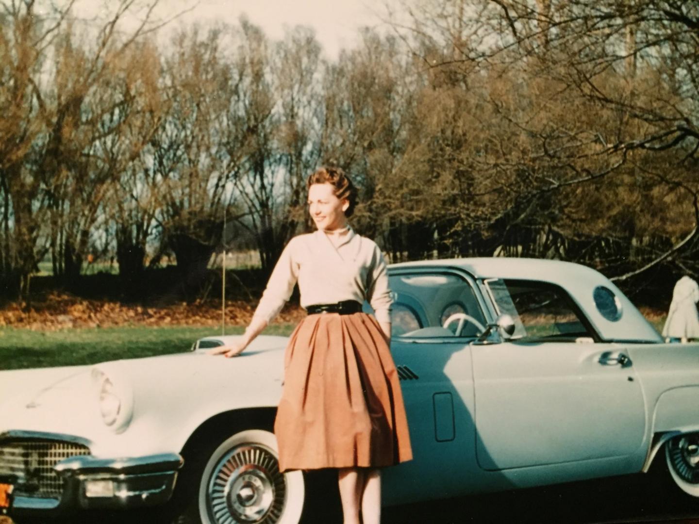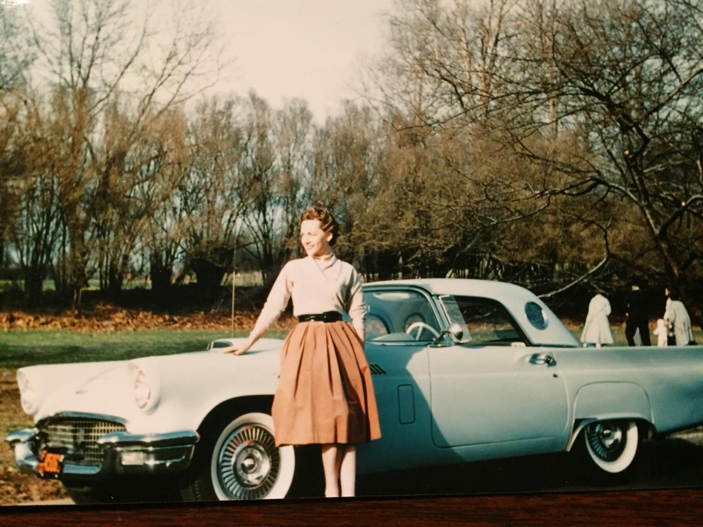 You want 1950s class? I submit for your consideration this original Kodachrome of my Aunt Irene "dressed to the nines" in front of her 1957 port-hole T-Bird., painted, I believe, in Starmist Blue. When I was young Aunt Irene always seemed to me to be like a glamorous Hollywood Starlet from one of those jet-setting romantic movies in Technicolor from the 1950s. I imagined her flying off to the French Alps to ski with Cary Grant, or speeding down a street in Rome on back of an Italian scooter with Gregory Peck. And Irene was always in Technicolor - I'm pretty sure that it was invented for women like her. She did, in fact, ski. To me, at the tender, very provincial, age of 7, skiing was an exotic sport that only rich and beautiful people were able to do.Her hubby, my Uncle Paul, smoked a pipe, skied, etc., so he also cut an urbane and sophisticated picture in my 7 year old mind, too. My impression of Aunt Irene was certainly cemented in place by her choice of super cool vehicles - her 1957 Powder Blue Porthole Removable Hard-top T-Bird. You can tell it's a 57: 1. Thunderbird emblem 2. Massive 2-part curved bumper 3. Taller grill 4. Parking lights in bumper 5. Licence plate position formed in bumper 6. Tail fins 7. Fender vent 8. script on front fender 9. Windwings and sunvisors 10."Thunderbird" by hash marks My aunt was stunningly gorgeous, as the last two photos prove, and she was always the life of the party. I am happy to report that, at 93, she still is.