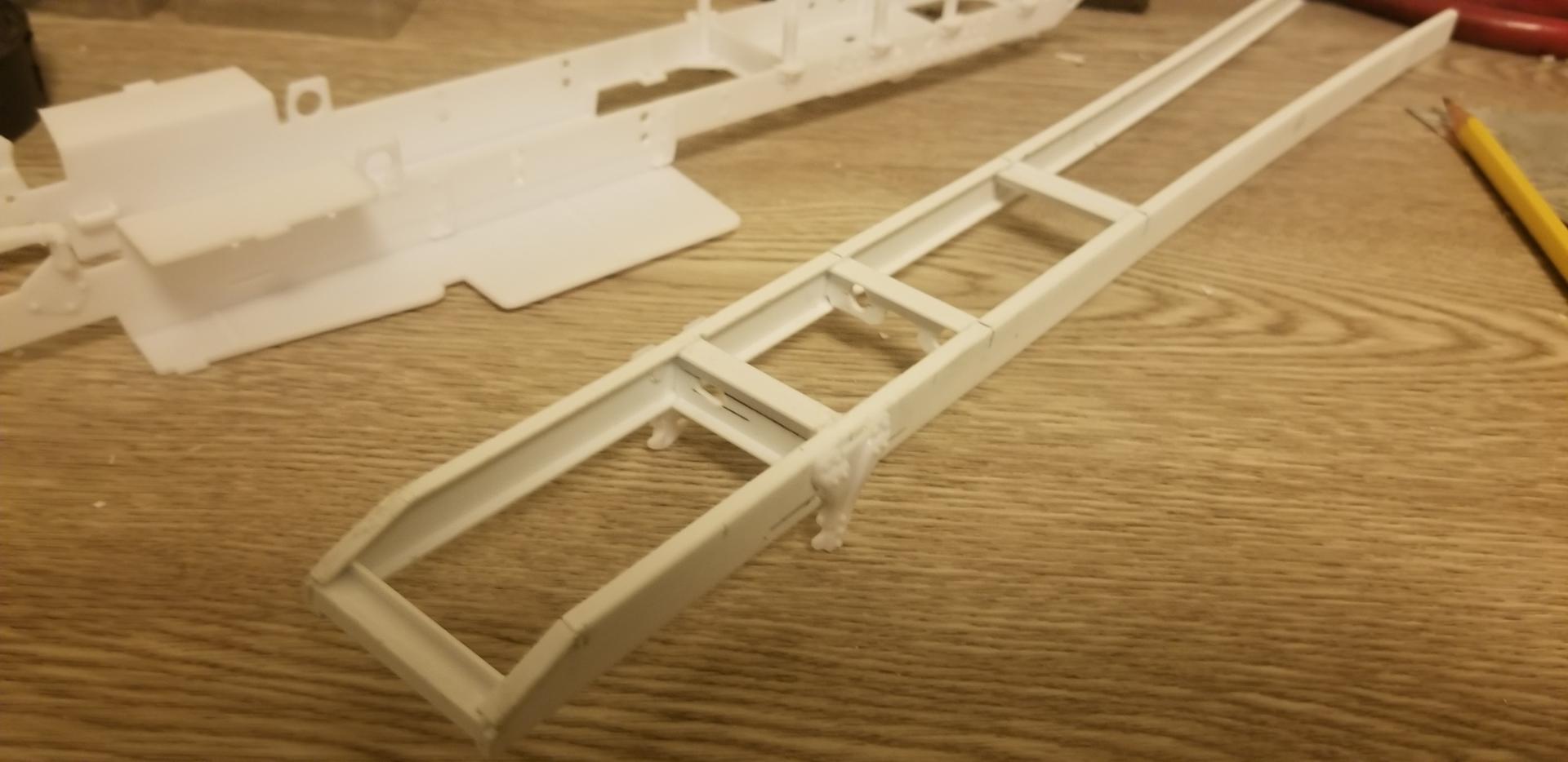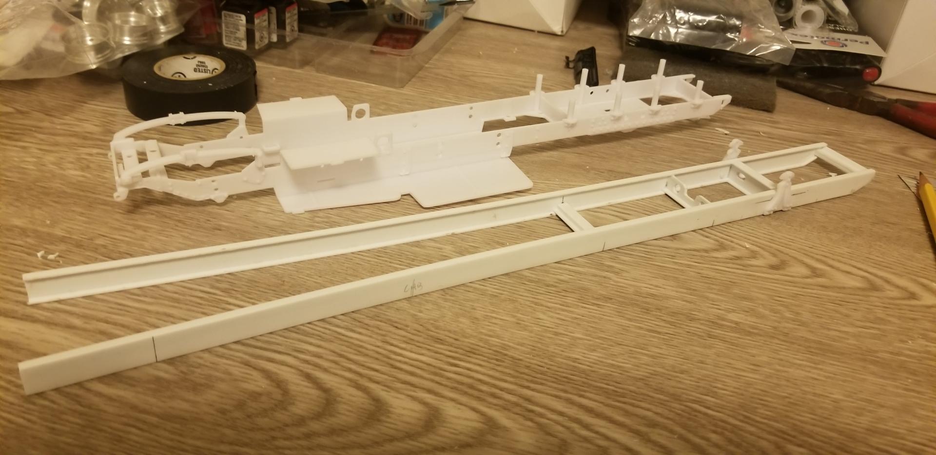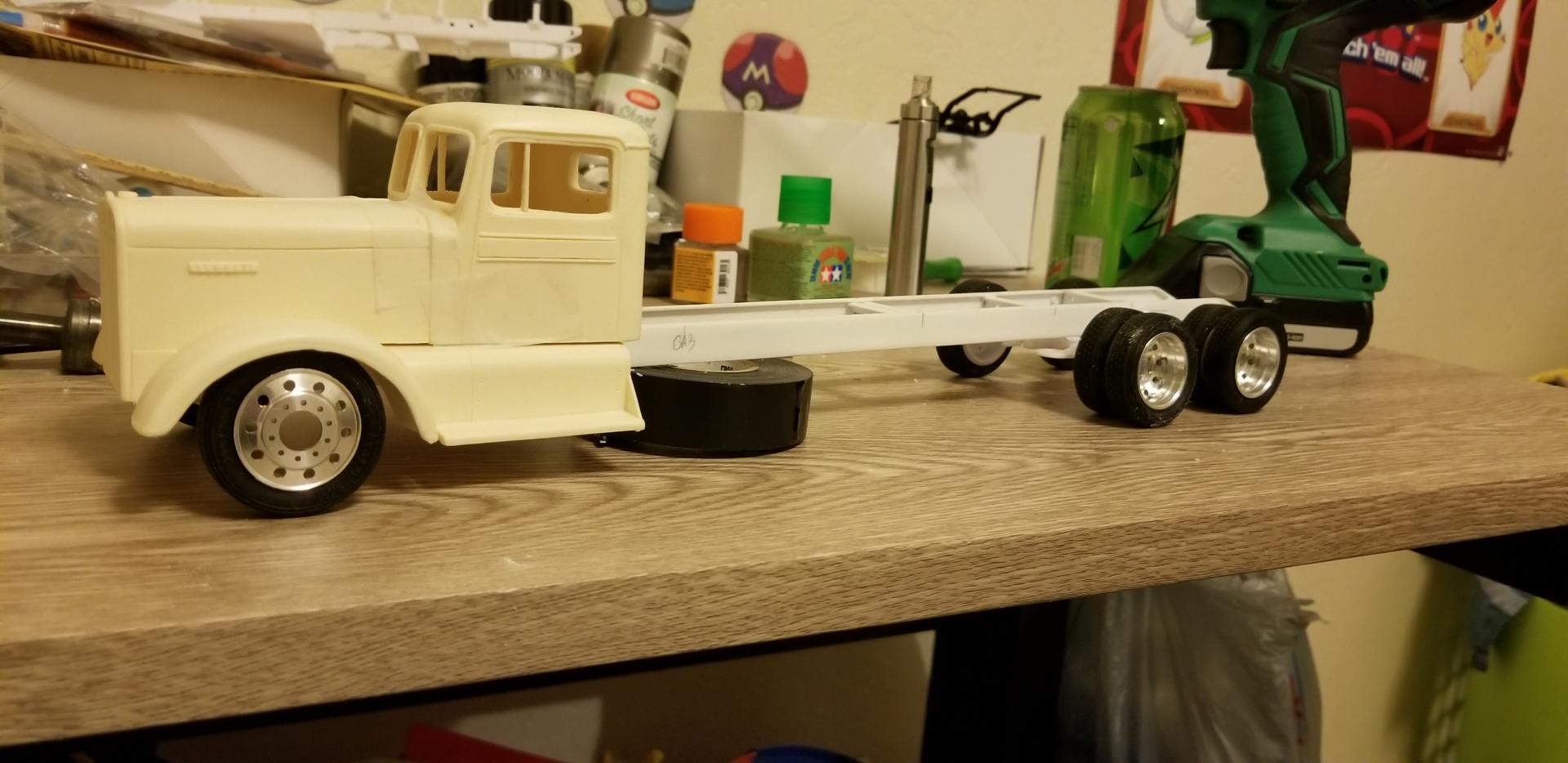 BRBO KenworthChris541 replied to Chris541's topic in WIP: Model Trucks: Big Rigs and Heavy Equipment Cab showed up today... so mock up was in order. I had left the front rails a bit long and it was about 290" wheelbase.... and I dont like it.... I have been on the fence about running it day cab or sleeper.... and I think the day cab wins out...which means it had way too much stretch.... so 255" is where it sits now and I'm pretty happy with it. now to start on the front suspension and start thinking about the body