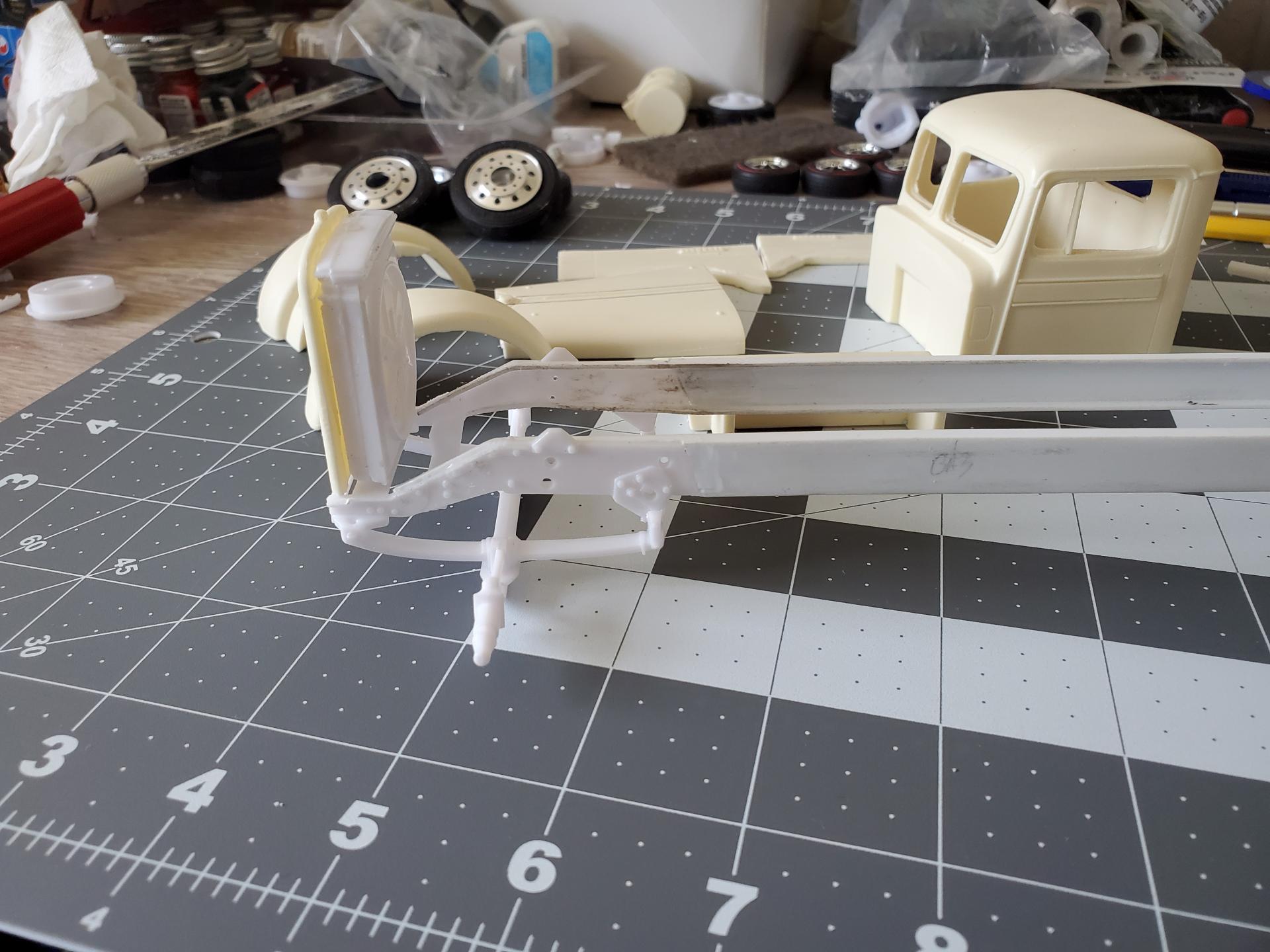 BRBO KenworthChris541 replied to Chris541's topic in WIP: Model Trucks: Big Rigs and Heavy Equipment I managed to get the cab cut apart and figure out what changes I need to make to it. While not absolutely correct to the original.... I blended the front rails of the donor kit onto my scratch frame. Since I will likely use a complete newer donor truck in real life.... it's not too far off. I took the donor kit radiator/fan shroud and chopped them down to fit the early grill shell... as this dictates the rest of the cab locating on the chassis I was finally able to make it up on the mountain where the real truck is sitting and take a bunch of reference pics/measurements. So I have a lot to do on the body side now without having to guess. And I'm still waiting on some more parts to show up so I can get the chassis fab finished up and start working towards actual assembly