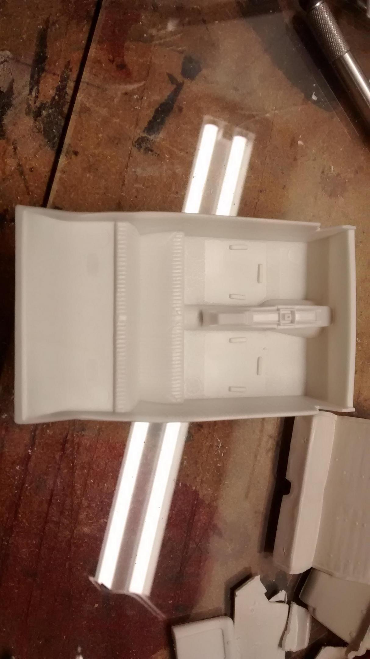 The Modelhaus hood needs some adjustments, and a small amount of material added to the bottom of the tongue. I may purchase the FabResin Works unit and see if it's any better. Pulled out an old MPB Detail Products hood and stole the underhood bracing from it to use on this project. . And finally, it was time to start chopping up the Johan interior tub in preparation for "correcting" some of it. .