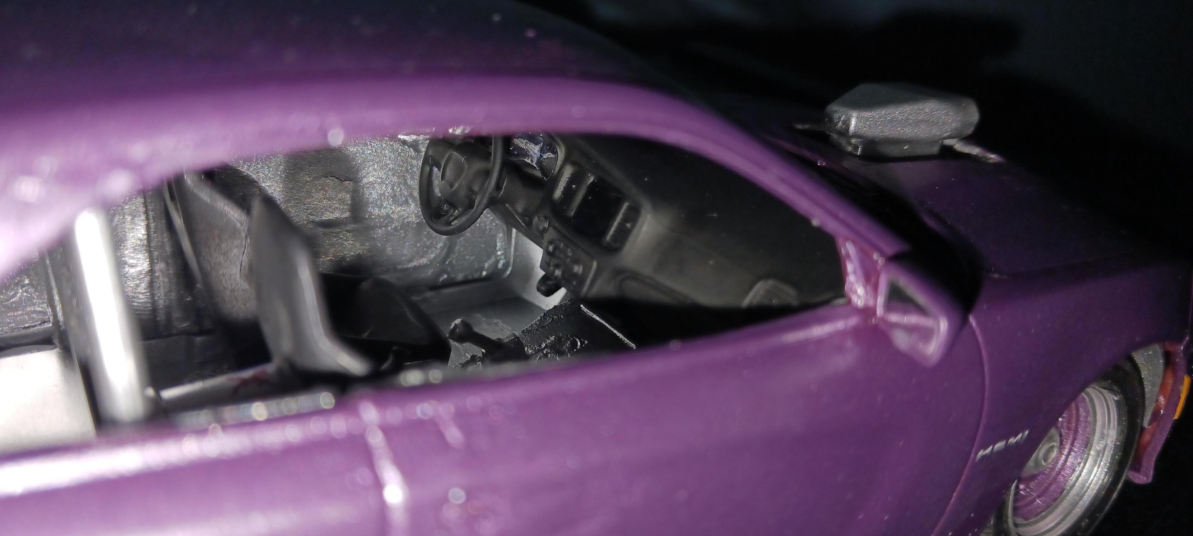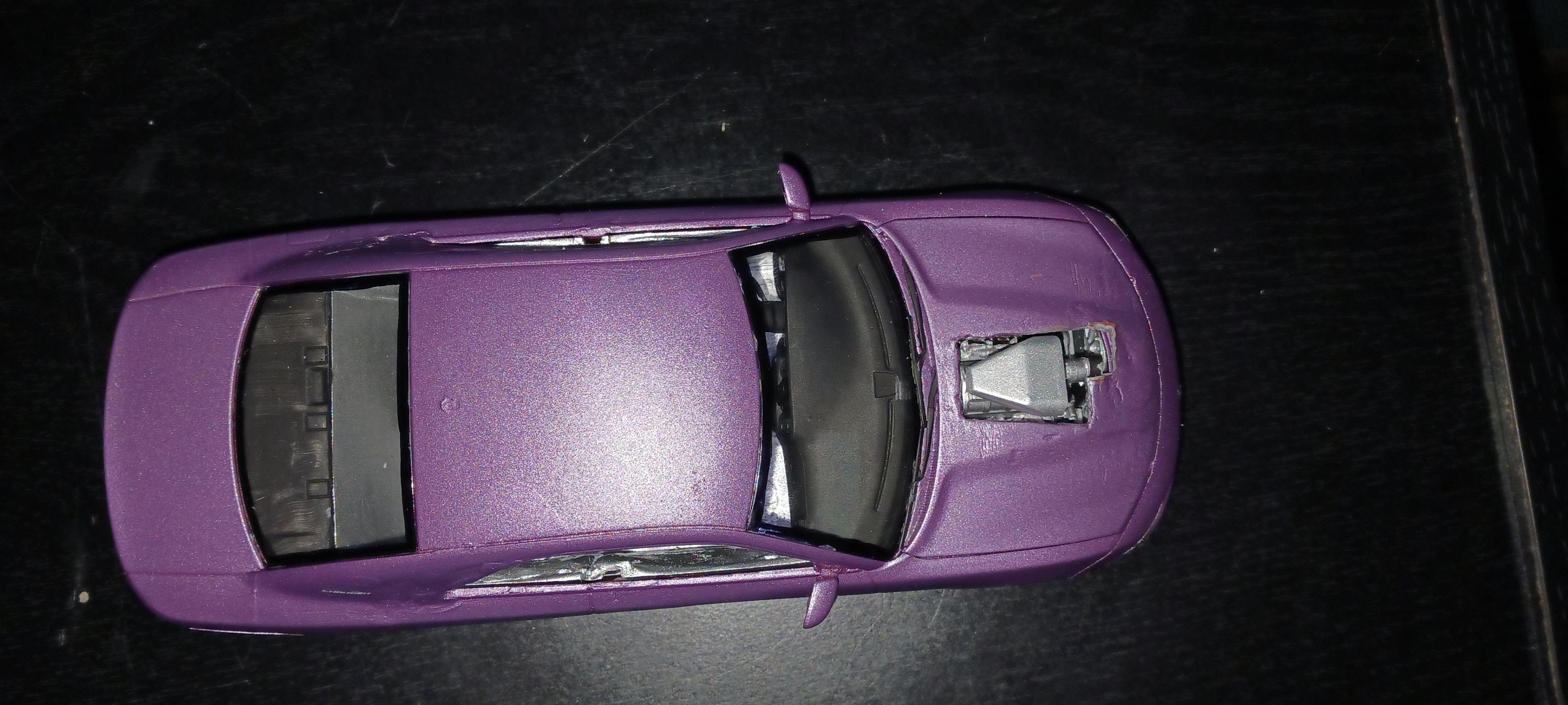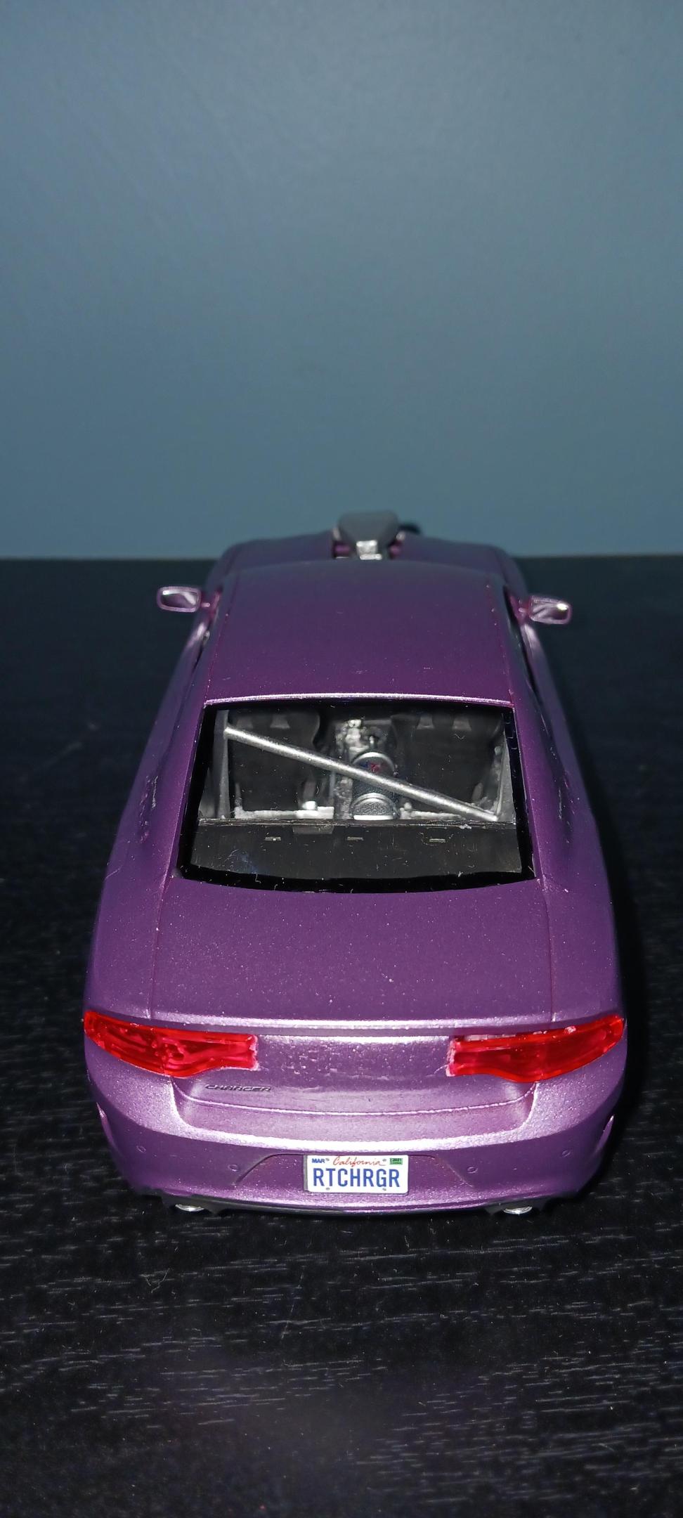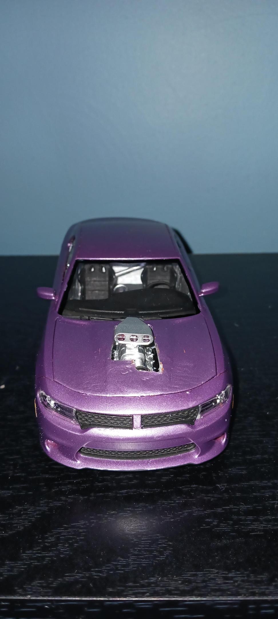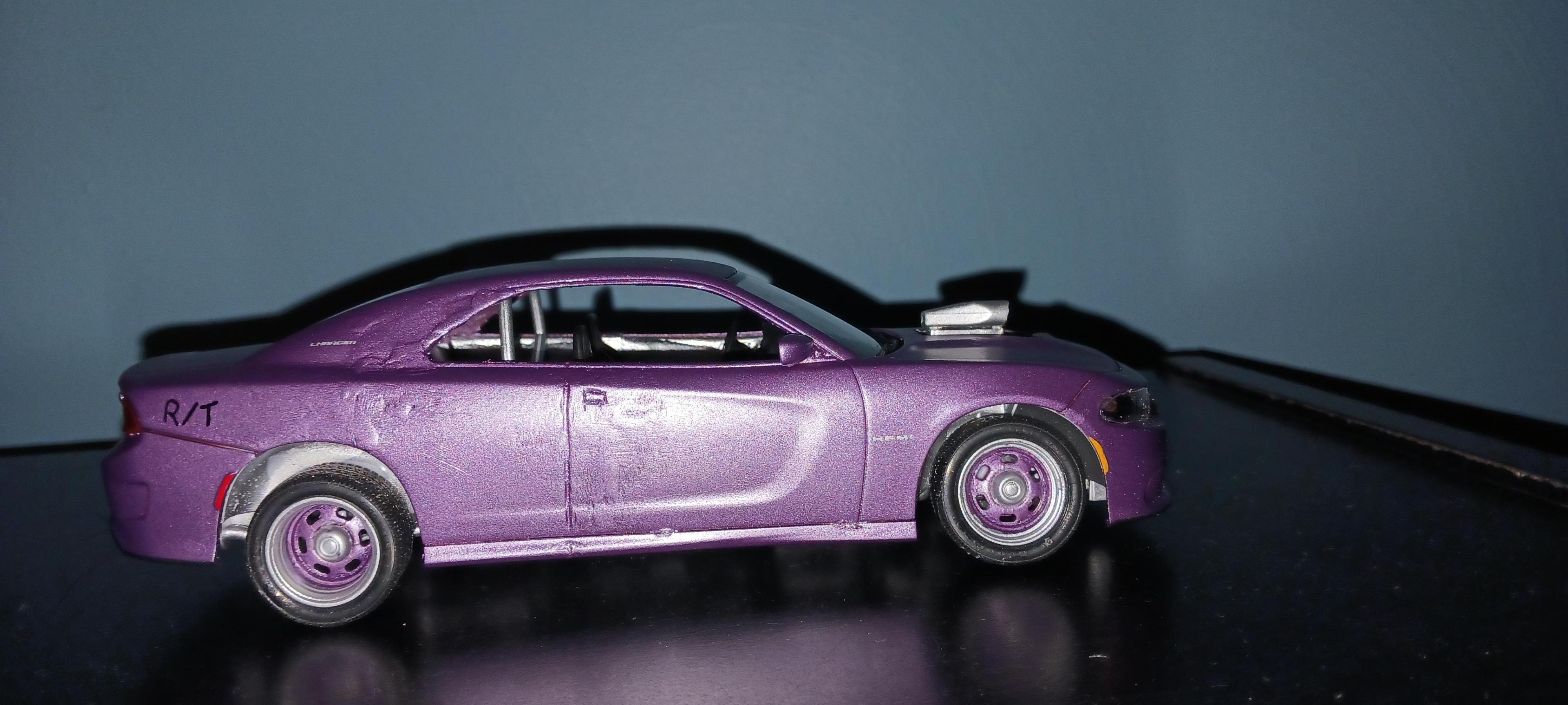 I made this using a amt 2021 dodge charger r/t kit some putty and engine and rims tires and roll bar and nitrous tank and shifter and e brake from my parts boxes I used putty to fill in the interior door panels and exterior door panels and rescribed new ones and new exterior door handles I also used putty to fill in the space between the modified taillights and I modified the grille as well I sculpted the new rear side roof line arches with putty which is why they are a little rough I did not want to sand to hard or to much in fear of breaking them off or sanding away to much I had to go to a advanced auto parts store to get a custom pearl color lacquer made it is called dusty orchid pearl