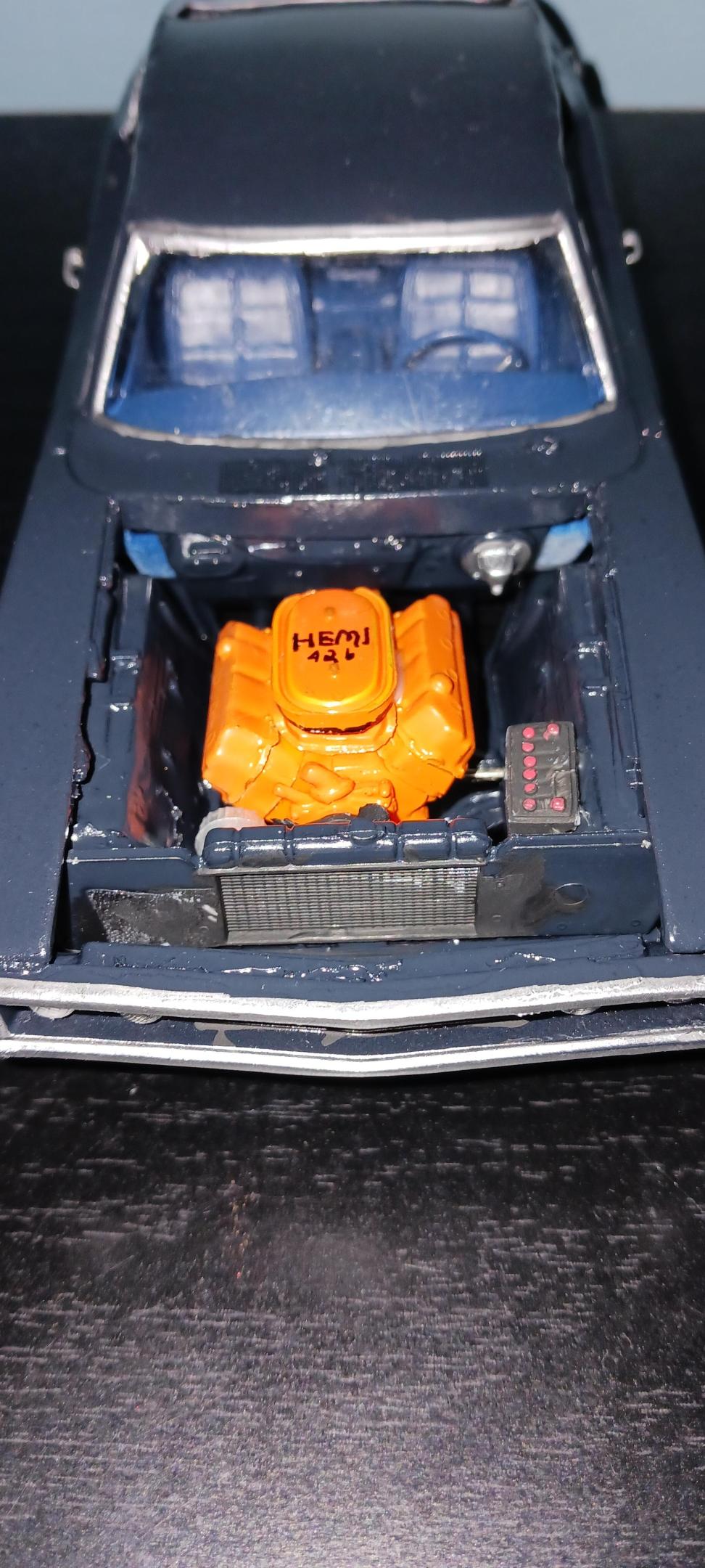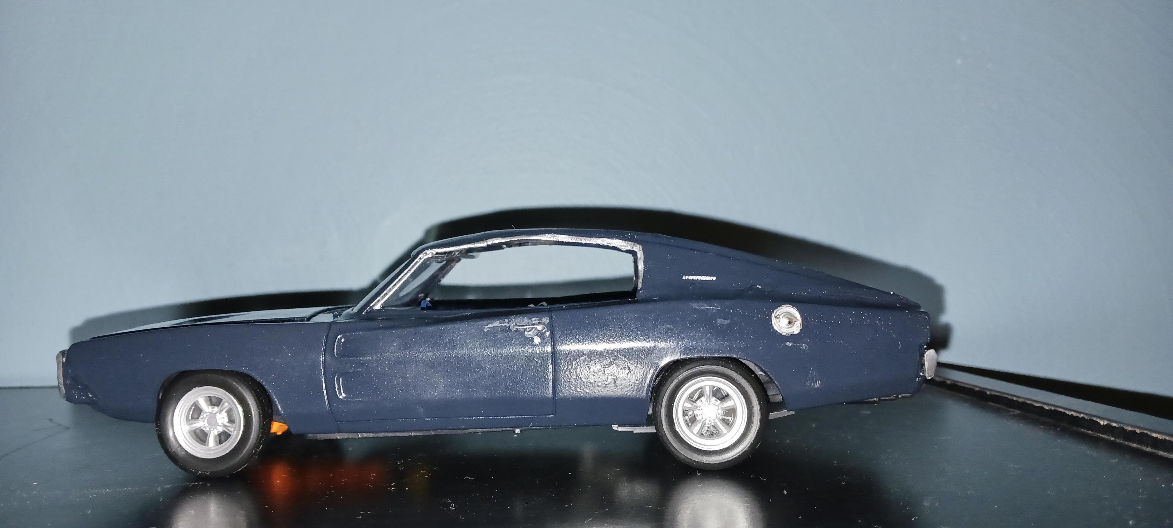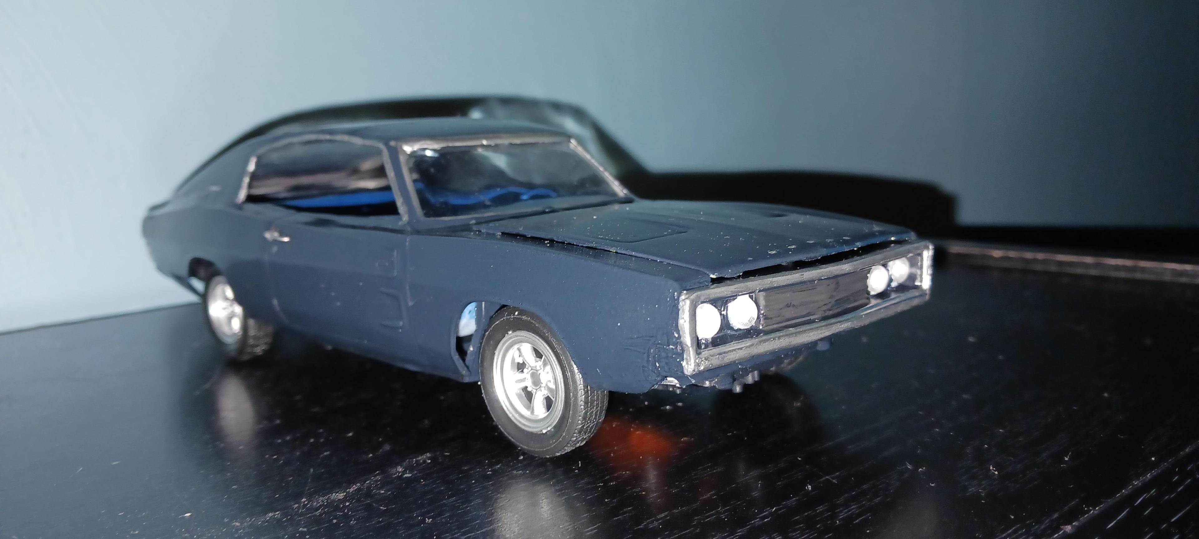this is a what if model I made what if when dodge made the 2nd generation charger they kept the fast back roofline and bar style taillights of the 1st generation charger and this is what i think it might look like I used a Revell 68 charger body and hood and a mpc 69 charger interior and firewall and radiator chassie engine battery with a challenger/Cuda style center console and the taillight panel and back bumper from a Revell 69 charger and a cut down fastback roof line and taillights from a broken Revell 67 charger and the grille is from a amt/ertl f&f 70 charger the pistol grip shifter and rims and tires and wheel backs and air cleaner came from my parts boxes