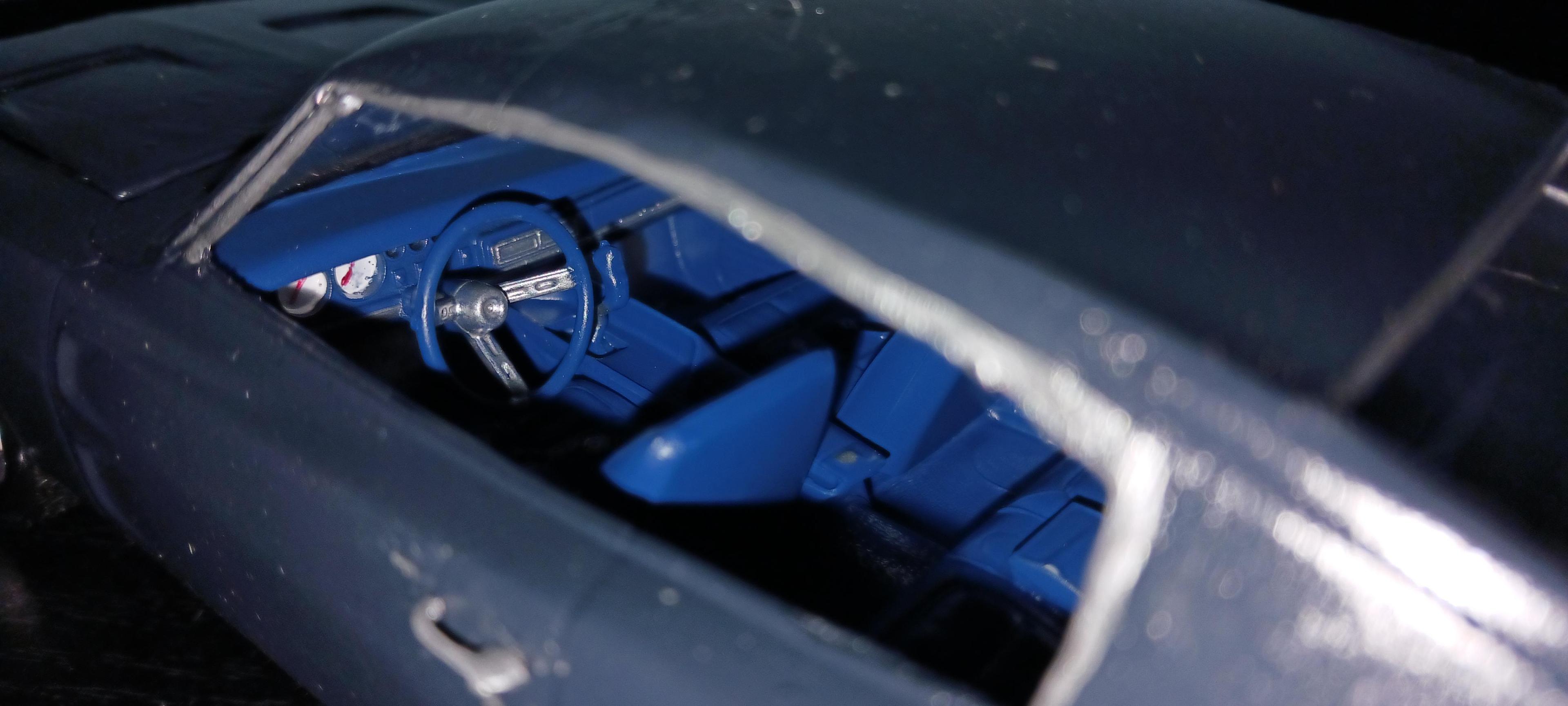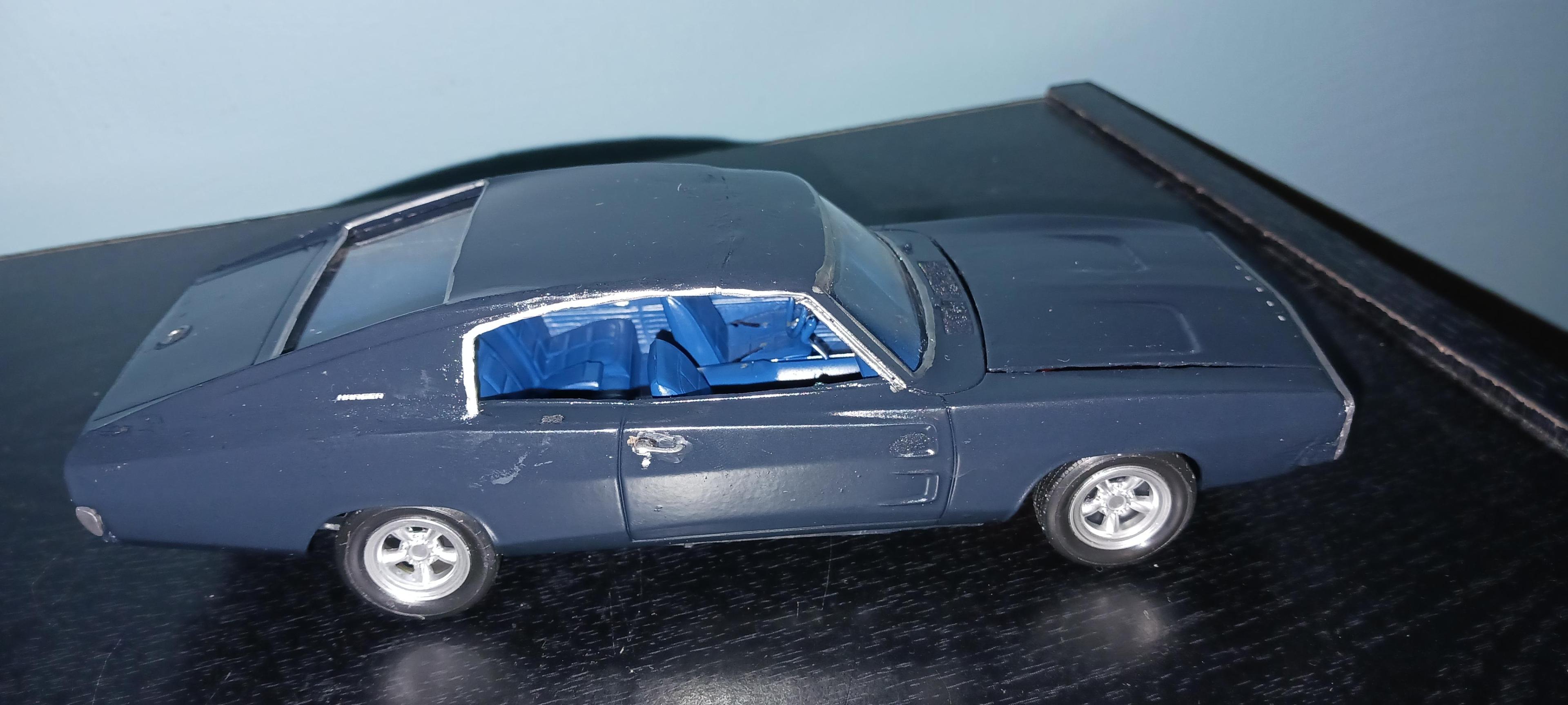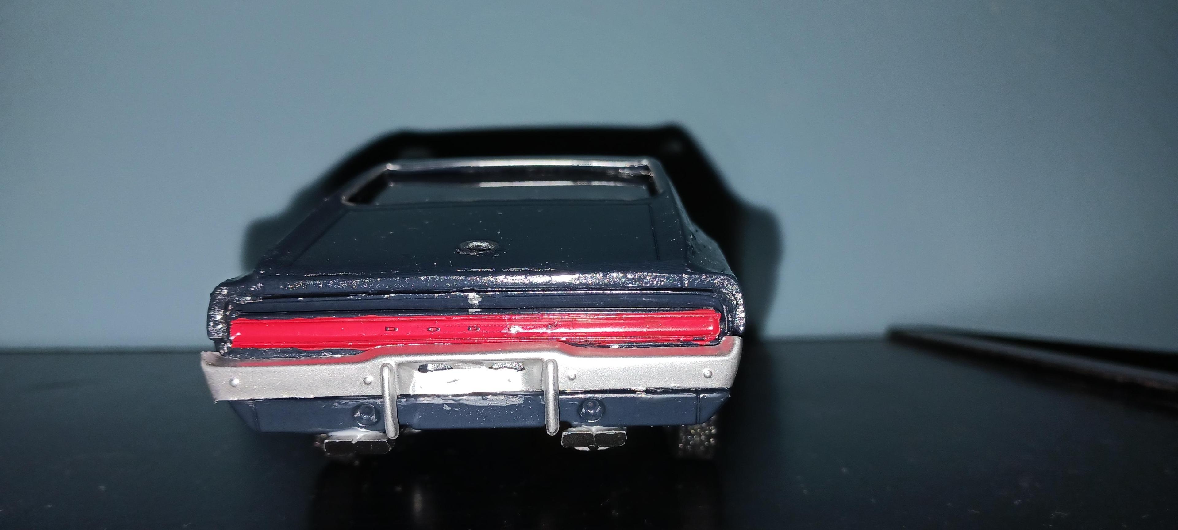this is a what if model I made what if when dodge made the 2nd generation charger they kept the fast back roofline and bar style taillights of the 1st generation charger and this is what i think it might look like I used a Revell 68 charger body and hood and a mpc 69 charger interior and firewall and radiator chassie engine battery with a challenger/Cuda style center console and the taillight panel and back bumper from a Revell 69 charger and a cut down fastback roof line and taillights from a broken Revell 67 charger and the grille is from a amt/ertl f&f 70 charger the pistol grip shifter and rims and tires and wheel backs and air cleaner came from my parts boxes