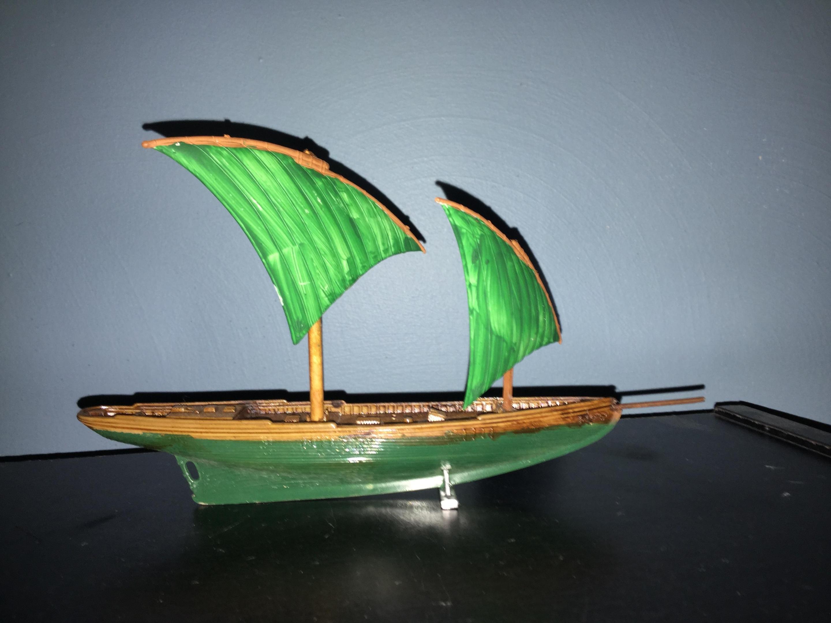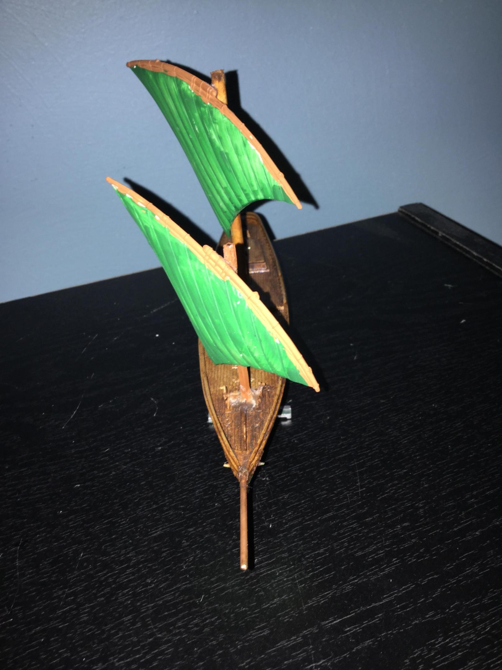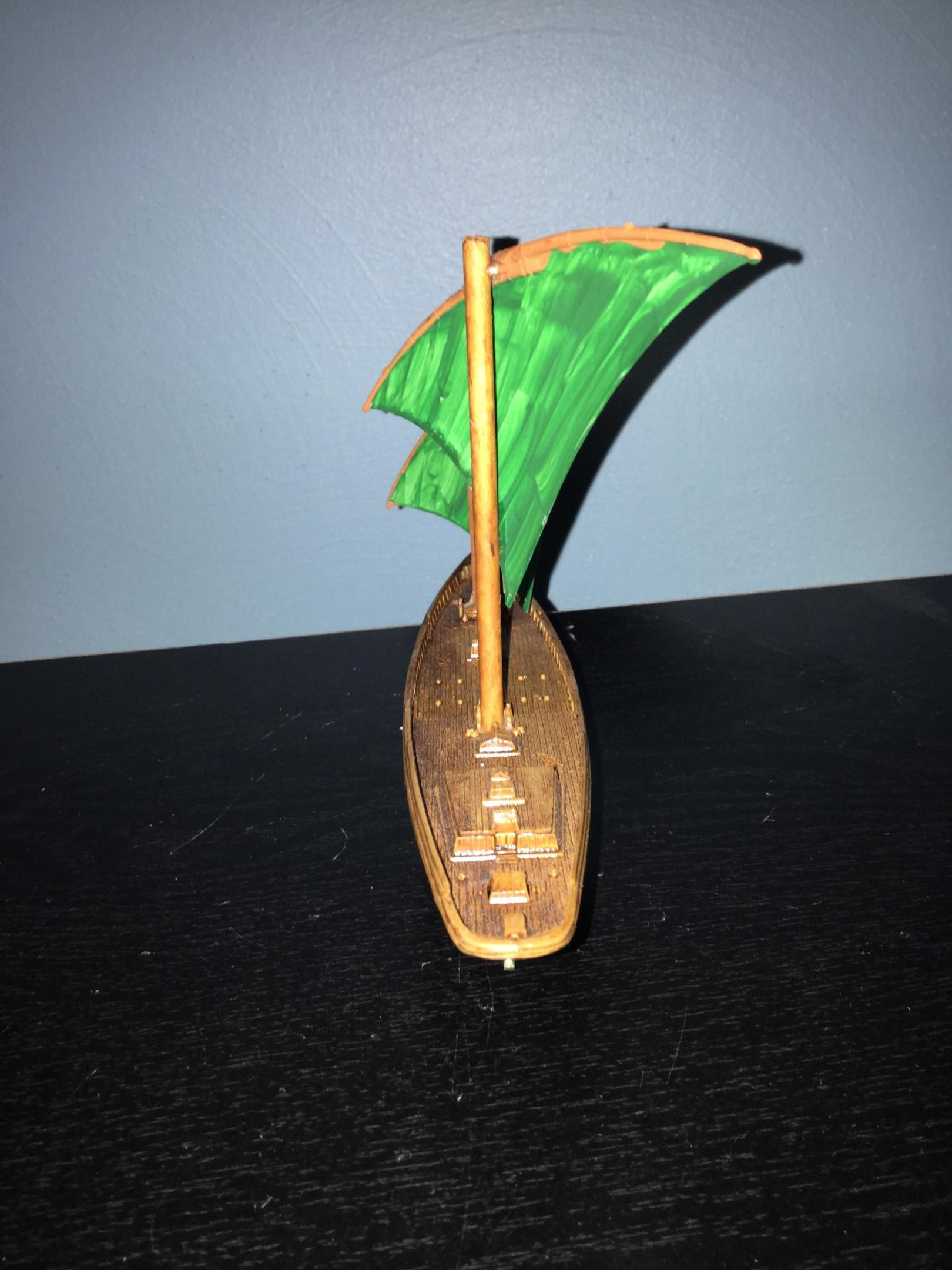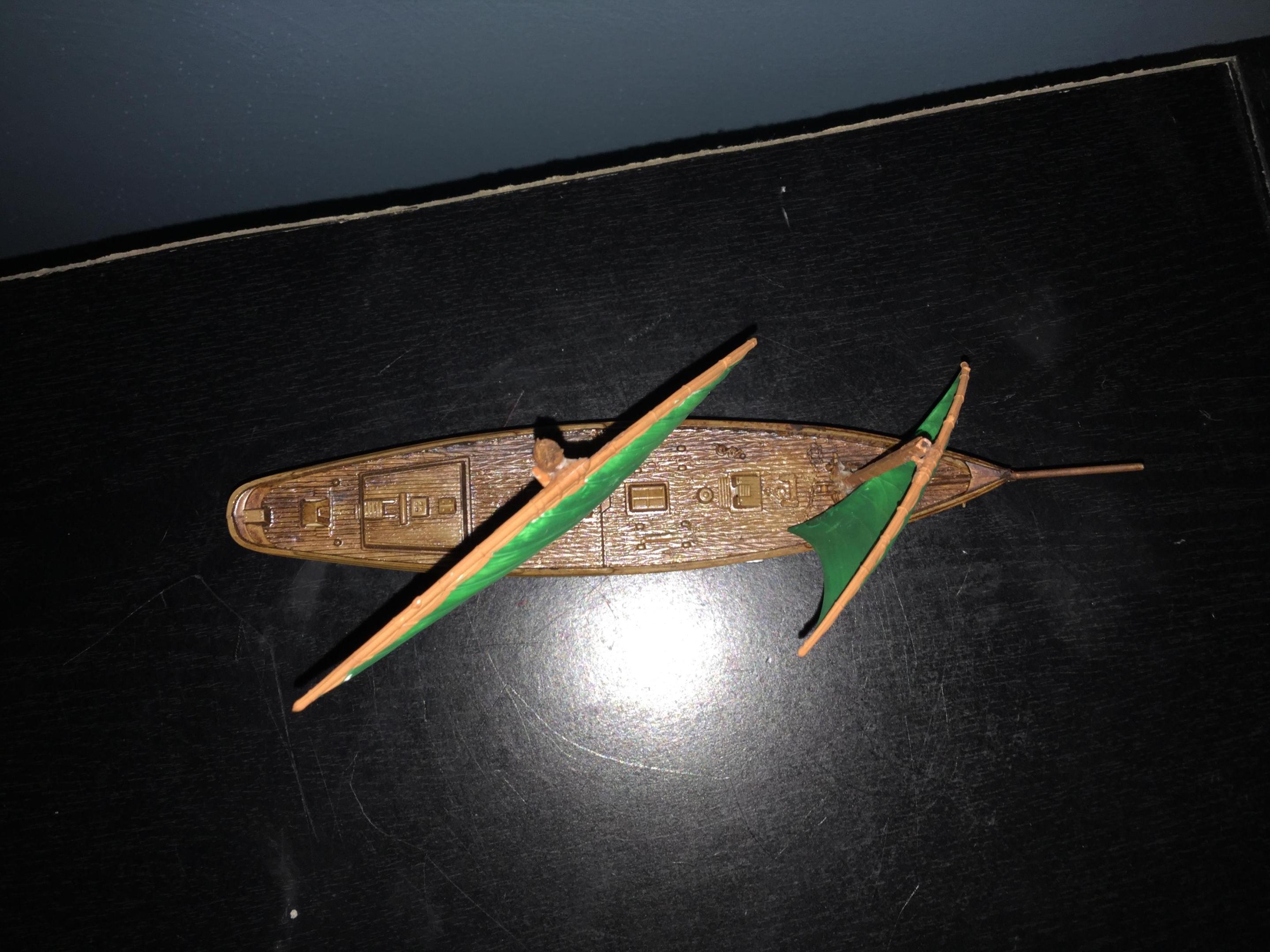 this was a old broken built up model I had got at a model kit swap meet a couple years ago it was missing the masts and bow sprit so I made new ones and found some plastic sails from another boat model kit that I ended up having to use for parts cause a couple pieces were pretty badly warped and a couple of the super thin pieces were broken already when I unsealed the kit