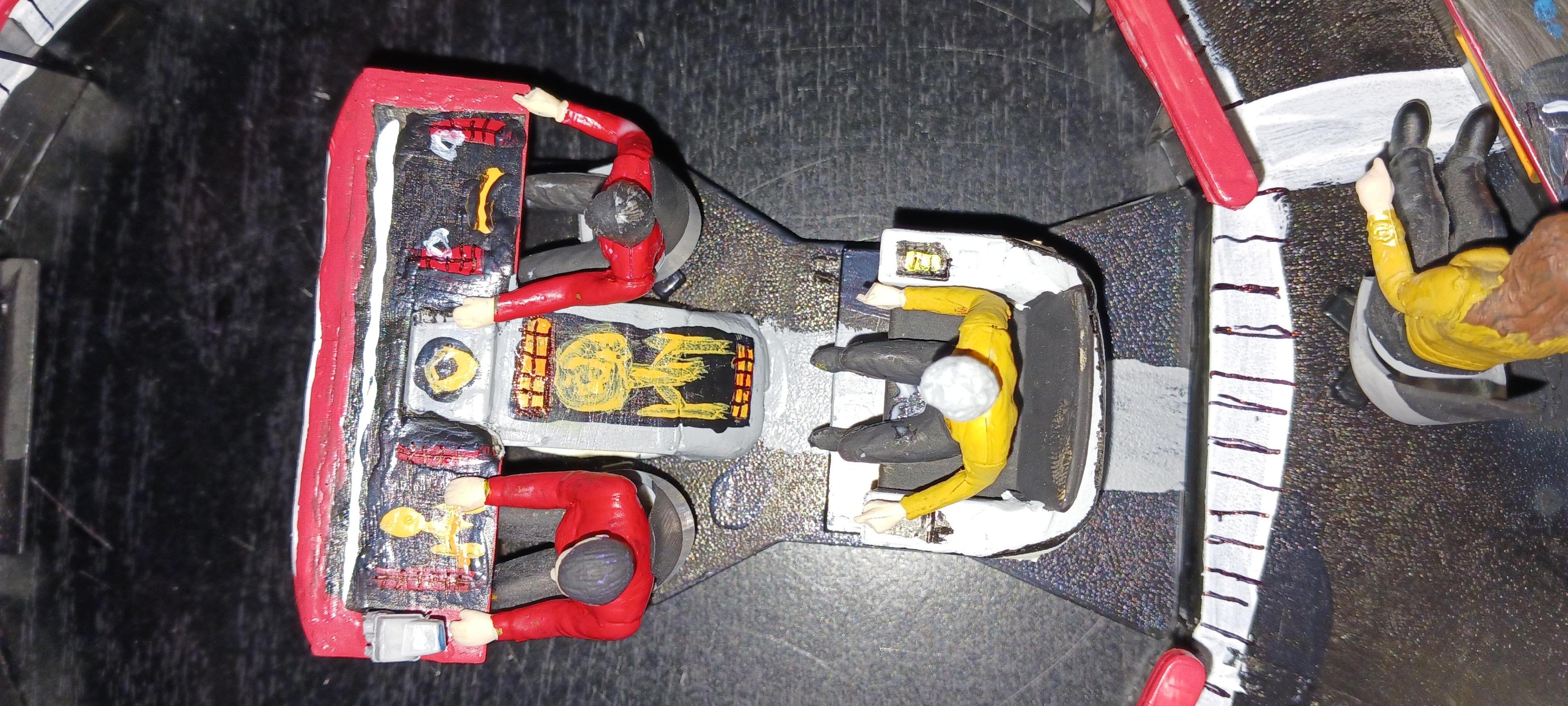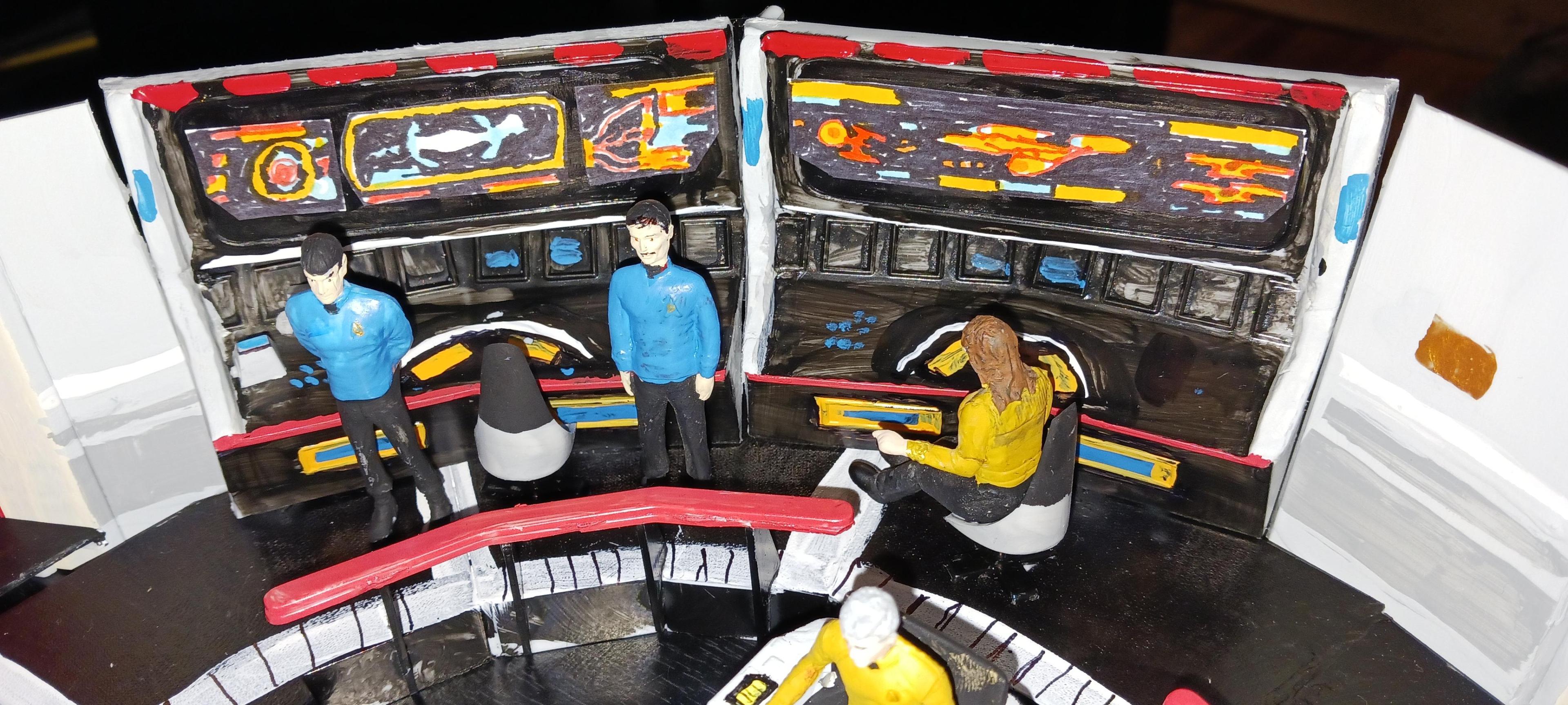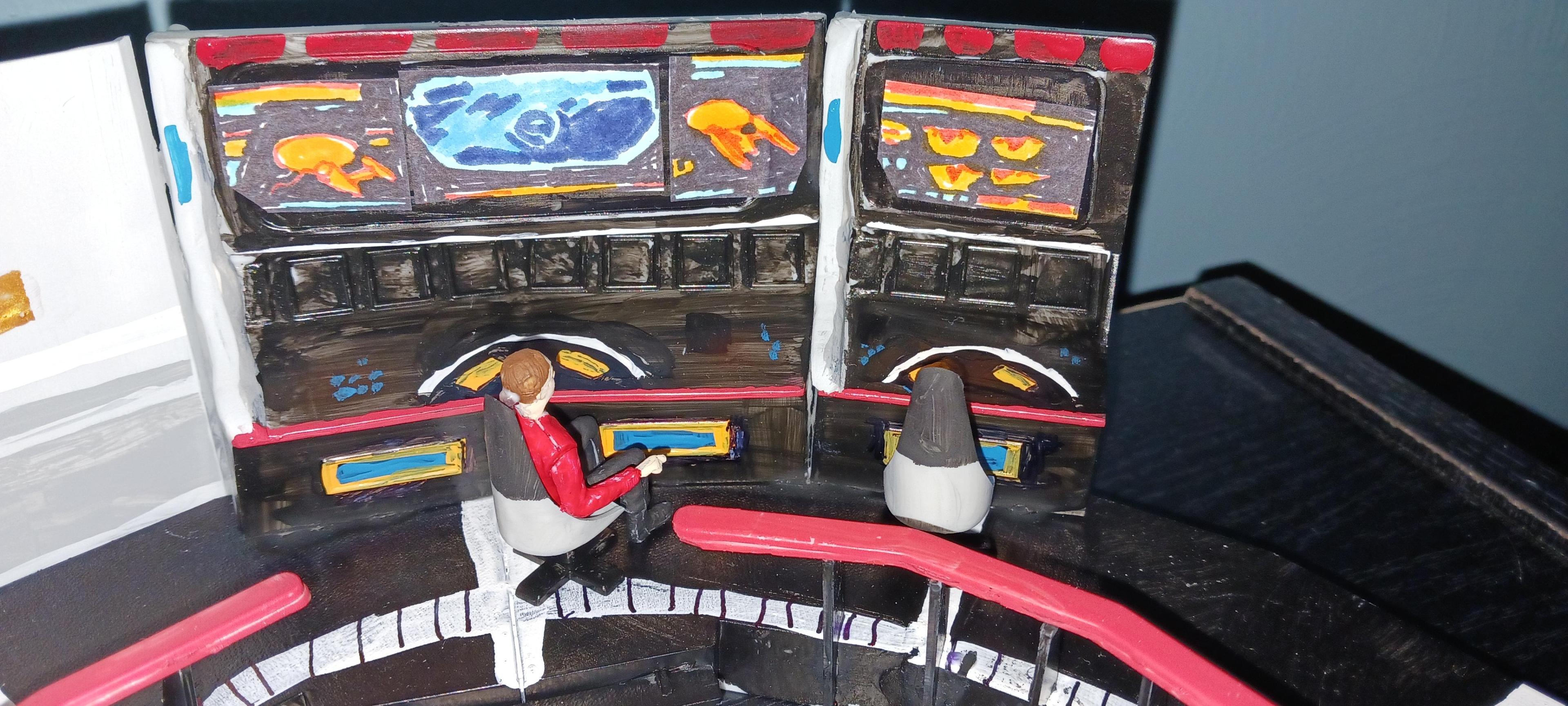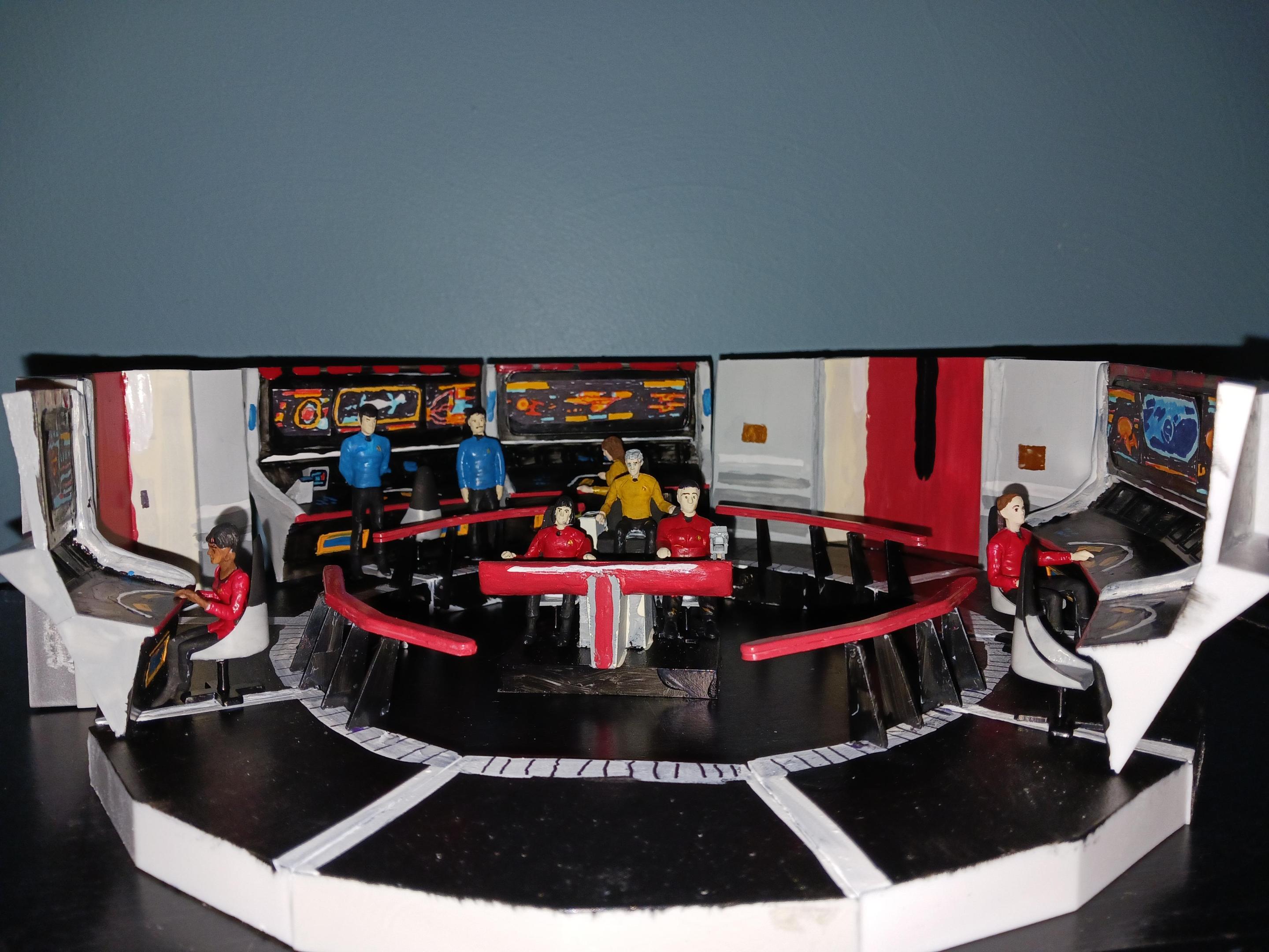 I made this from the most recent reissued amt star trek tos uss enterprise Bridge kit and parts from a older amt/ertl star trek uss enterprise Bridge kit I hand drew the upper screens for the outer ring stations I also made figures of capt pike lt Spock lt cmdr una chin Riley cadet uhura lt la’an noonian singh and lt Erica ortegas and lt Jenna Mitchell and lt George (Sam) Kirk