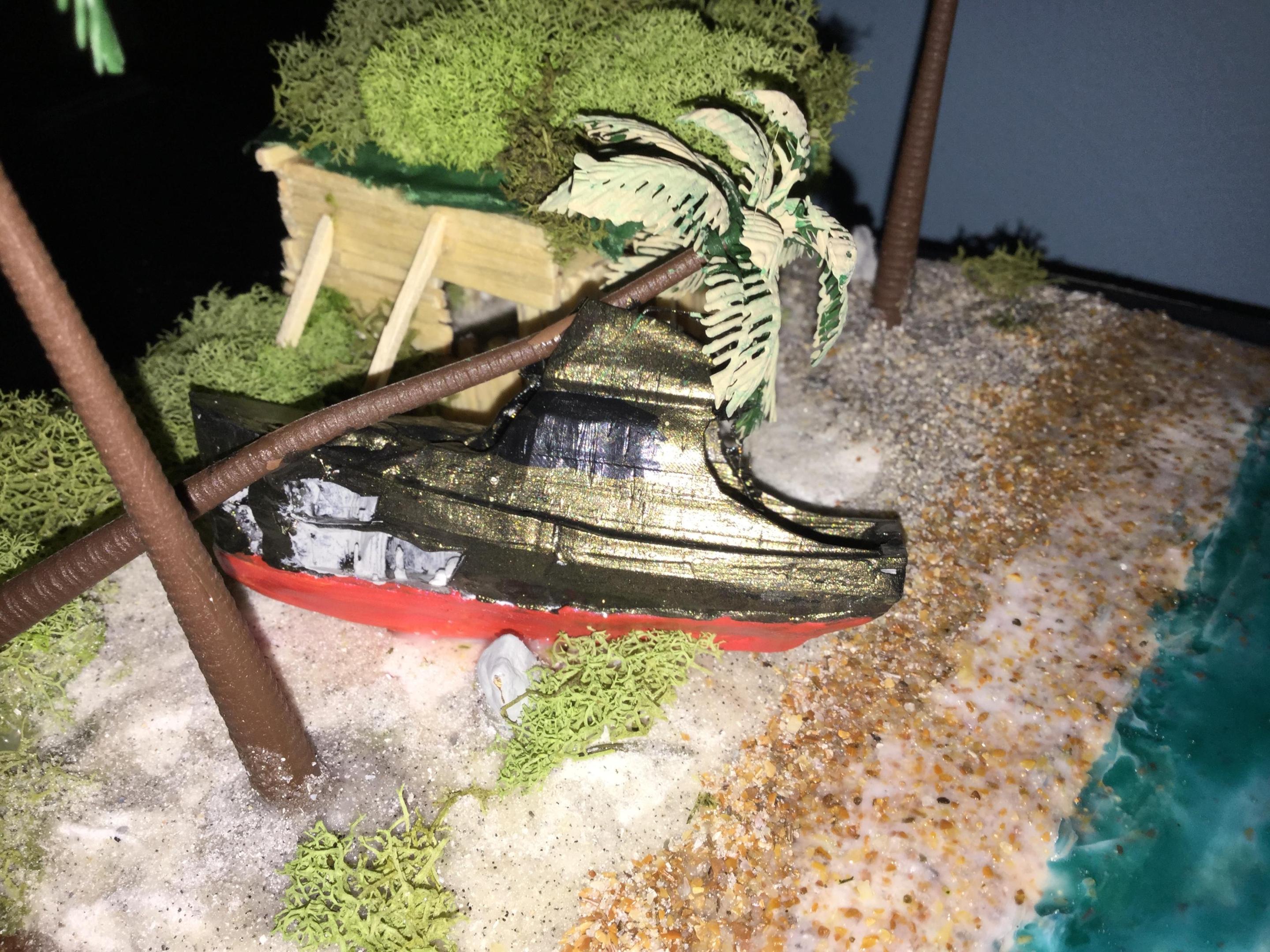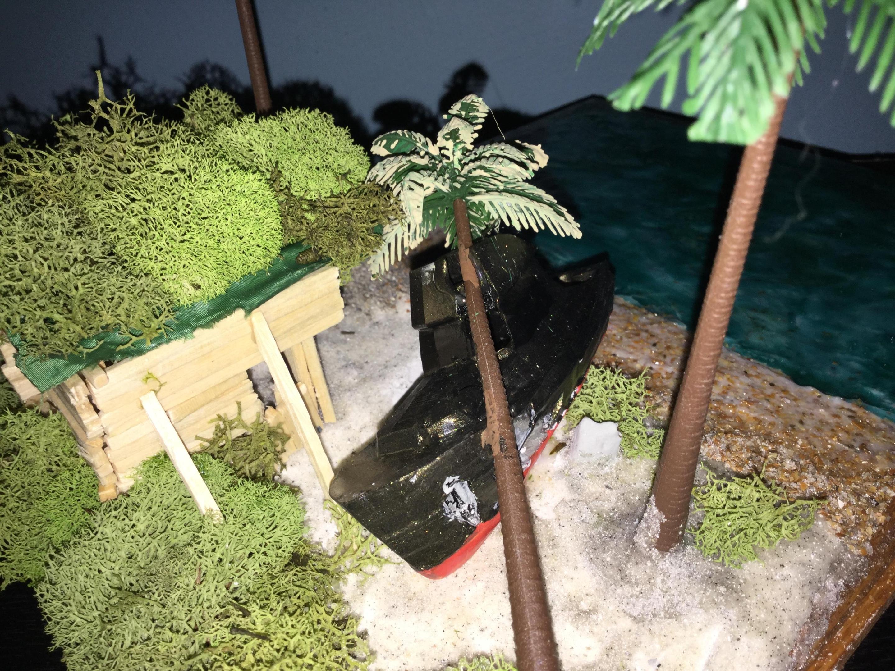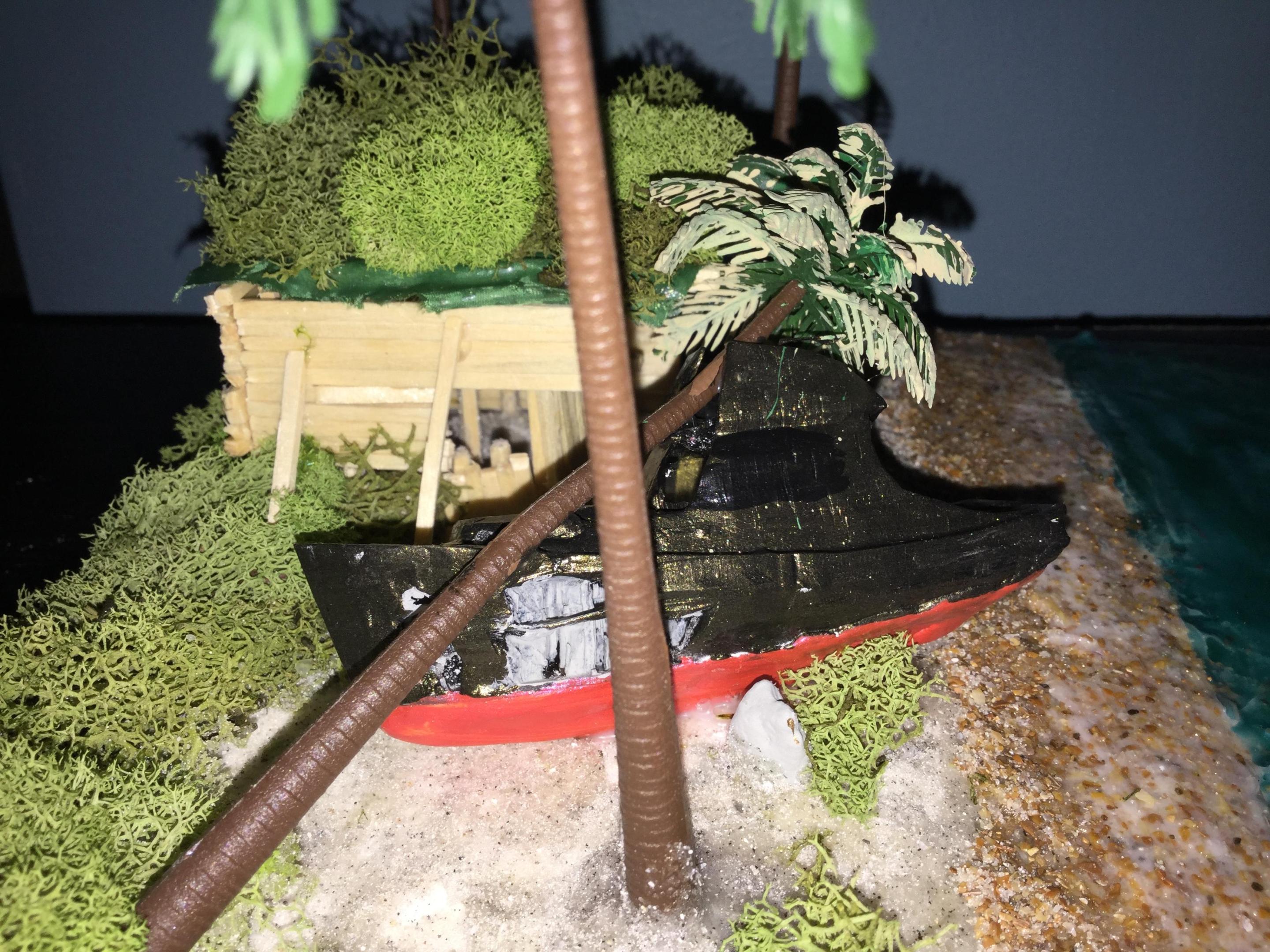 the shipwrecked boat model was a failed 3d resin printed model i scratch made the tent and fire pit i used actual sand from beach for the diorama