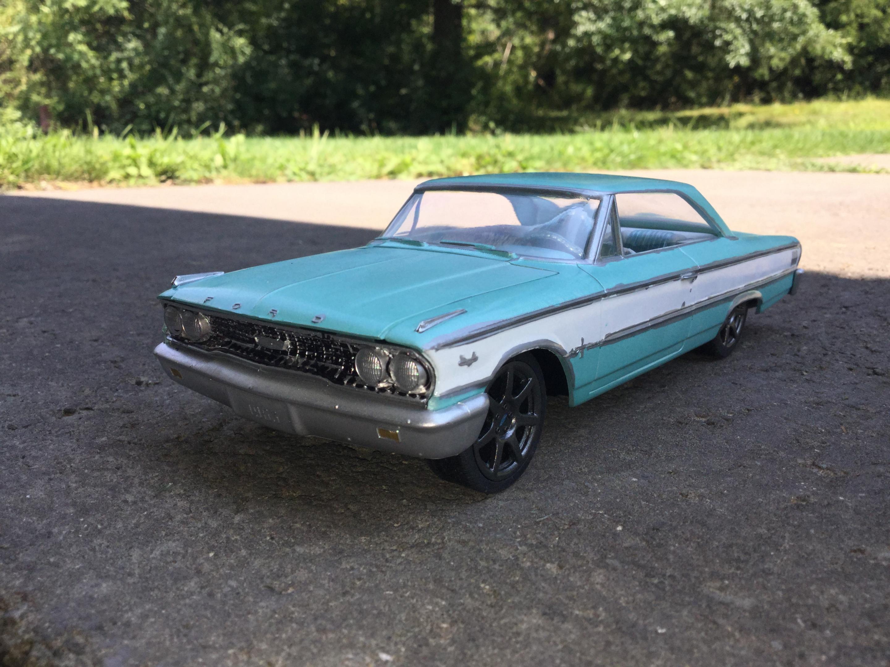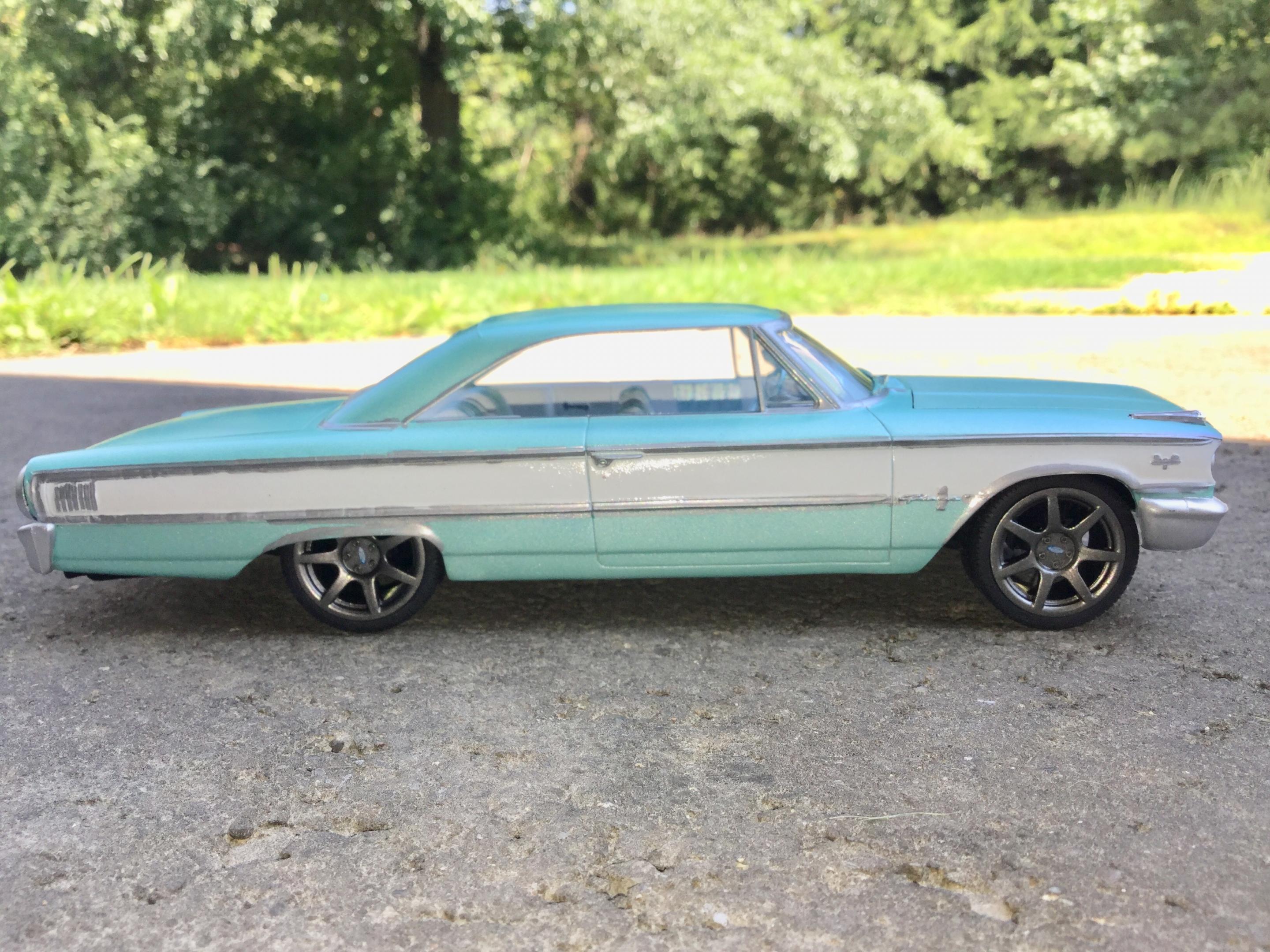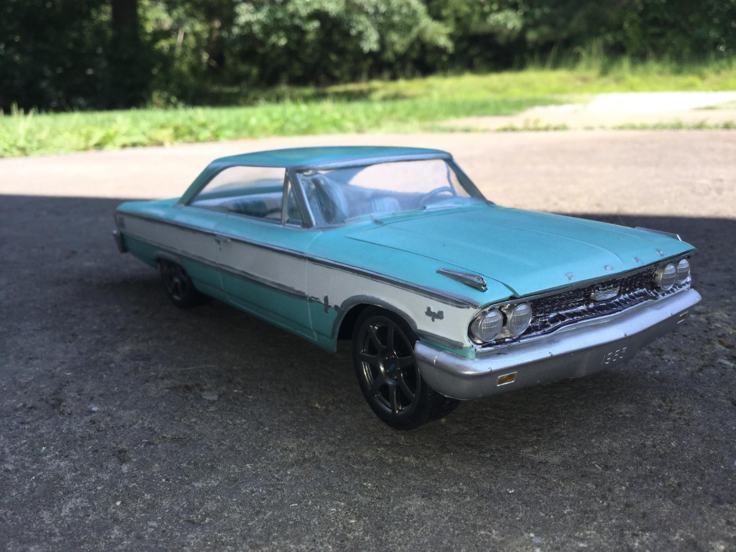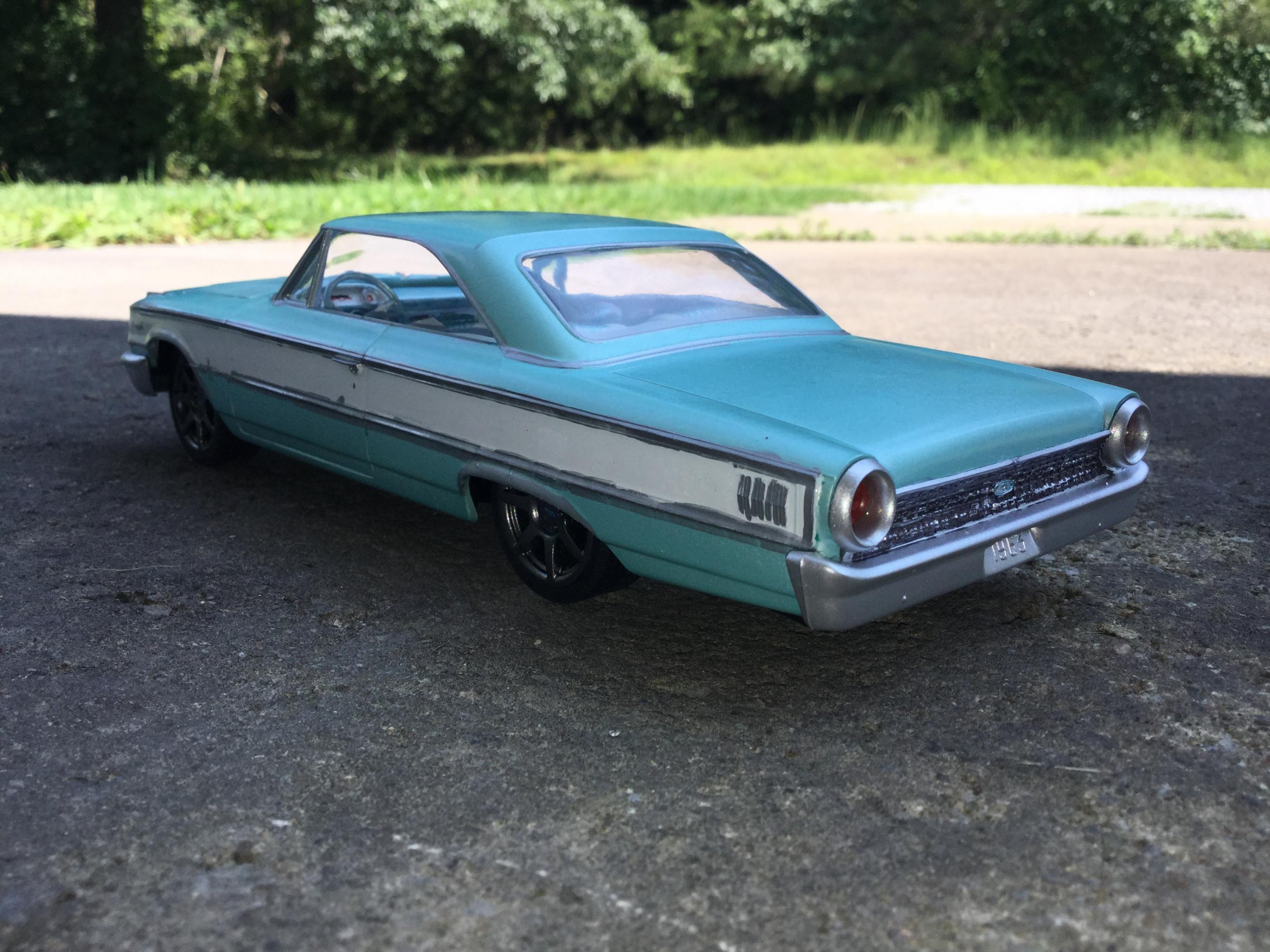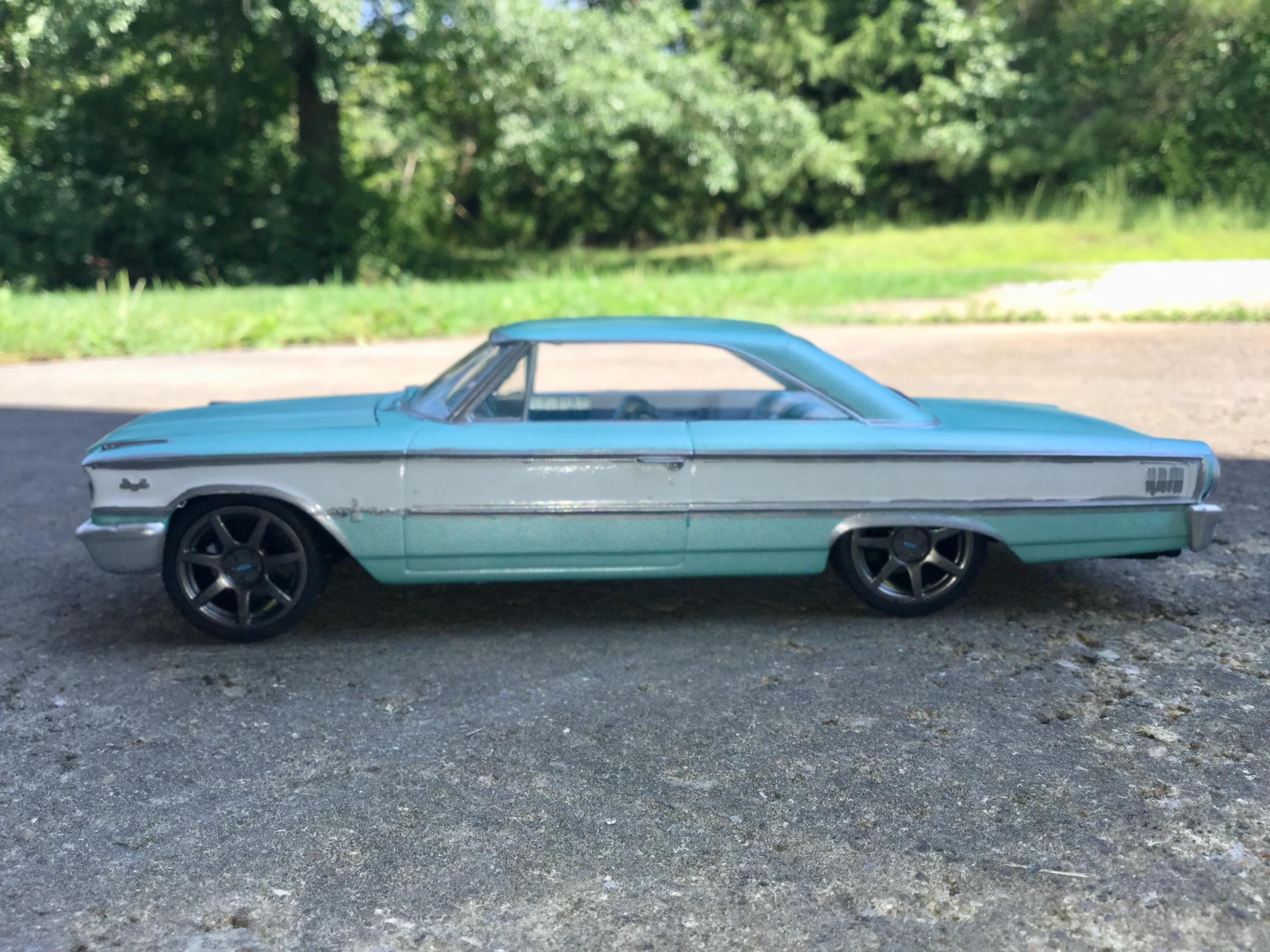 the kit was missing the wheels and tires and the engine and i did not have any early 60's ford rims or engines only muscle car rims/mopar rims and late 60's and mid 70's ford bid blocks i used these set of modern ford rims and tires and i curbsided it i painted the body rust-oleum universal sea mist with a rust-oleum 2x blossom white side stripes i painted the interior white and hand painted the accents folk art acrylic metallic ice blue with a paint brush