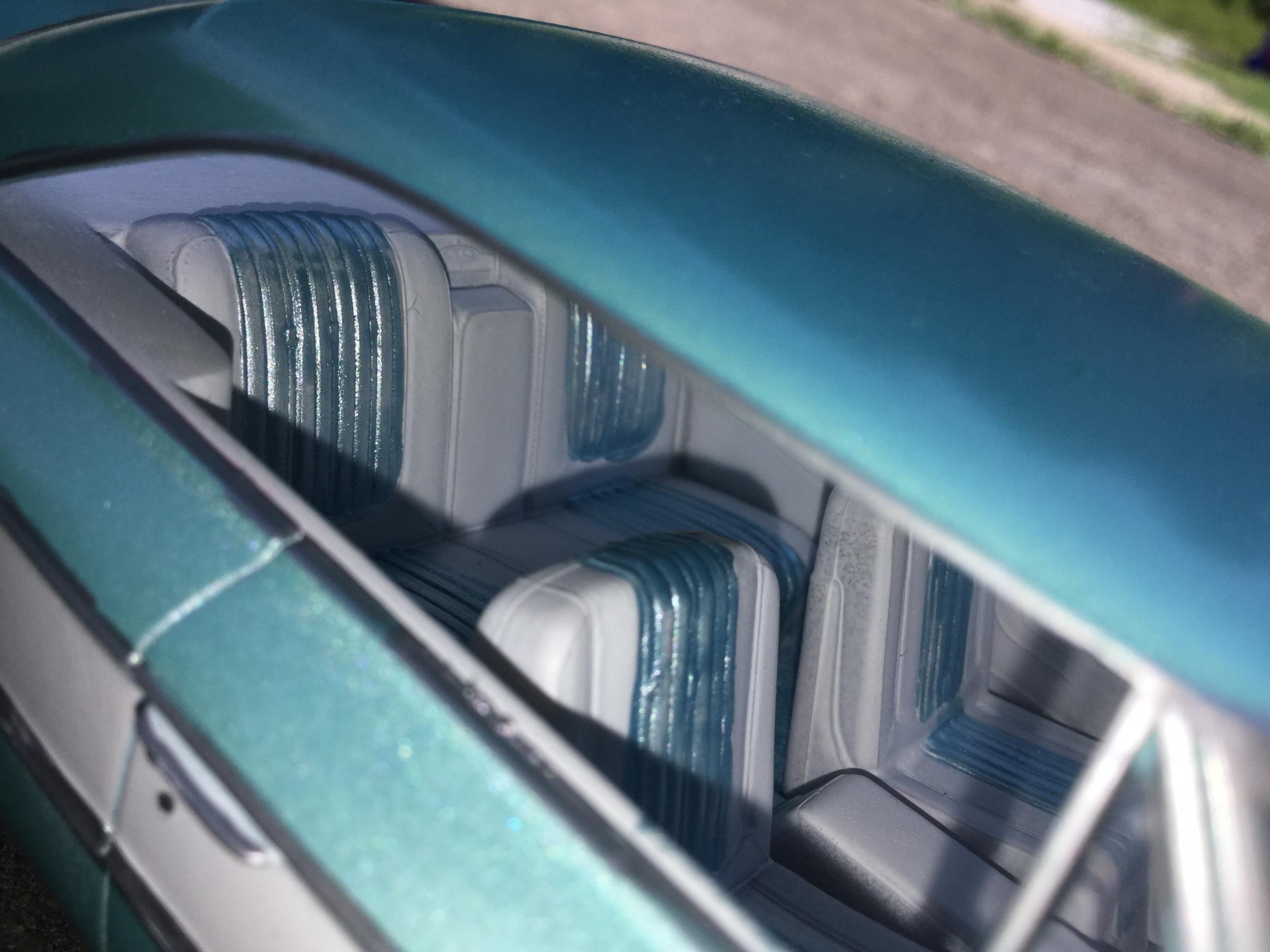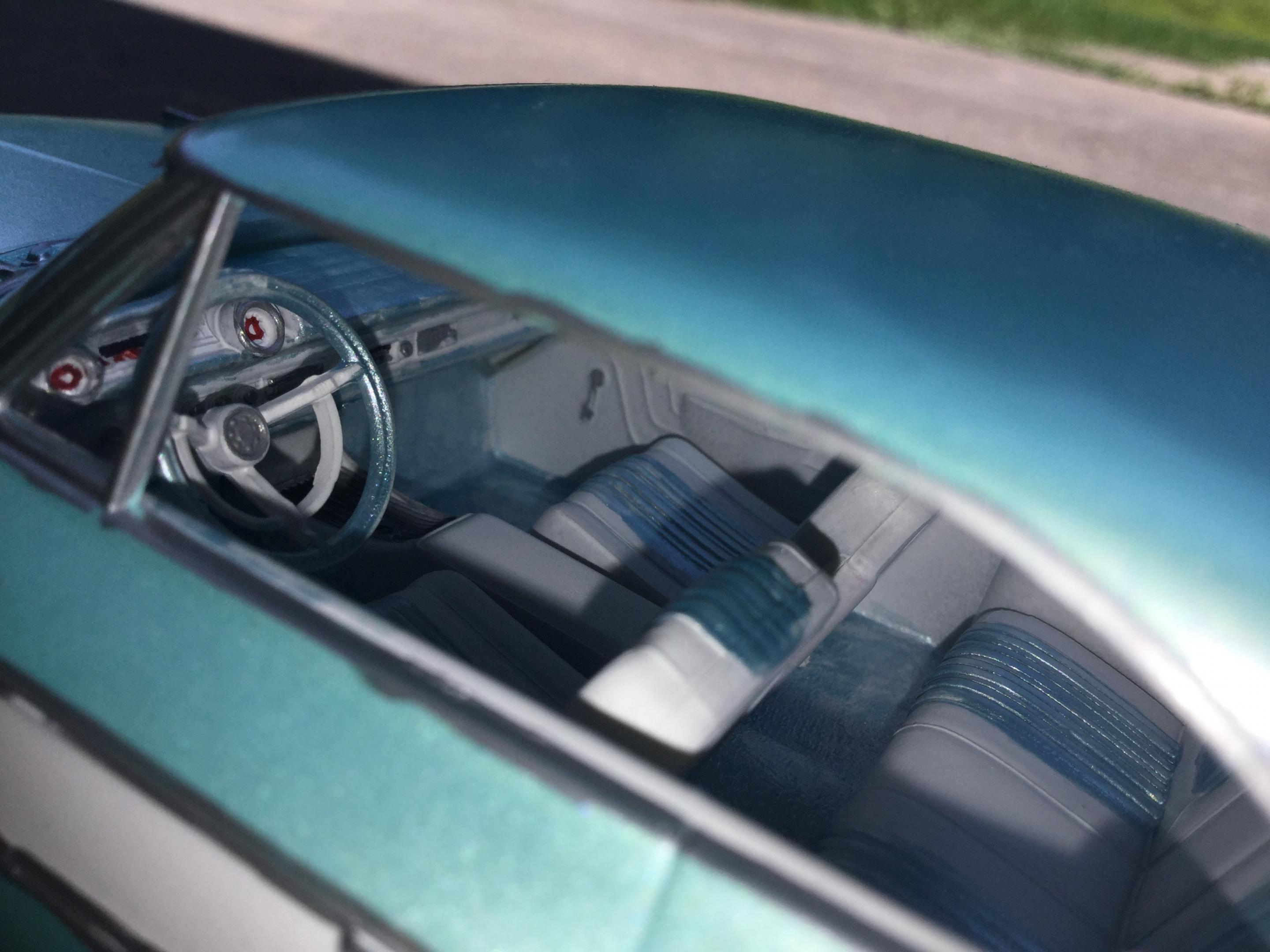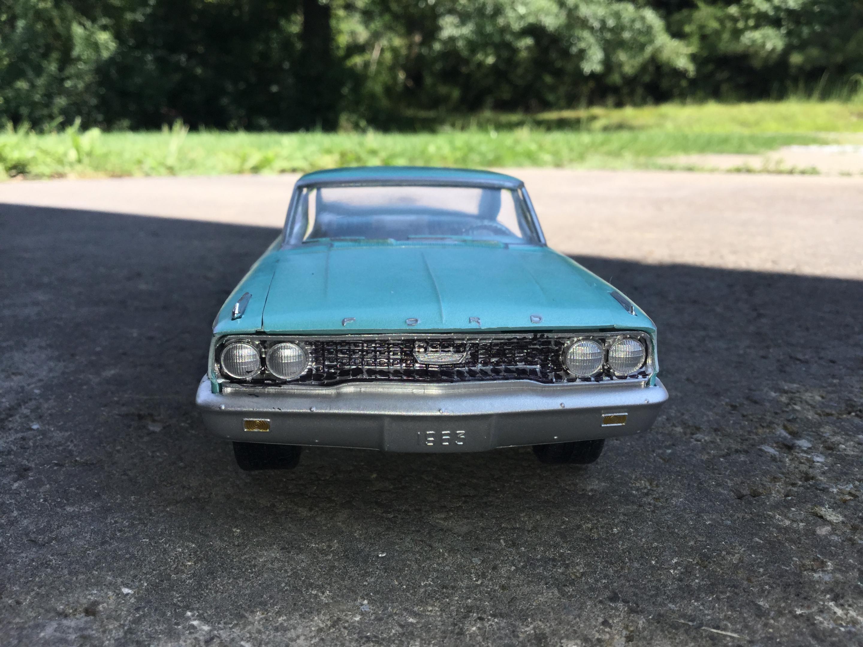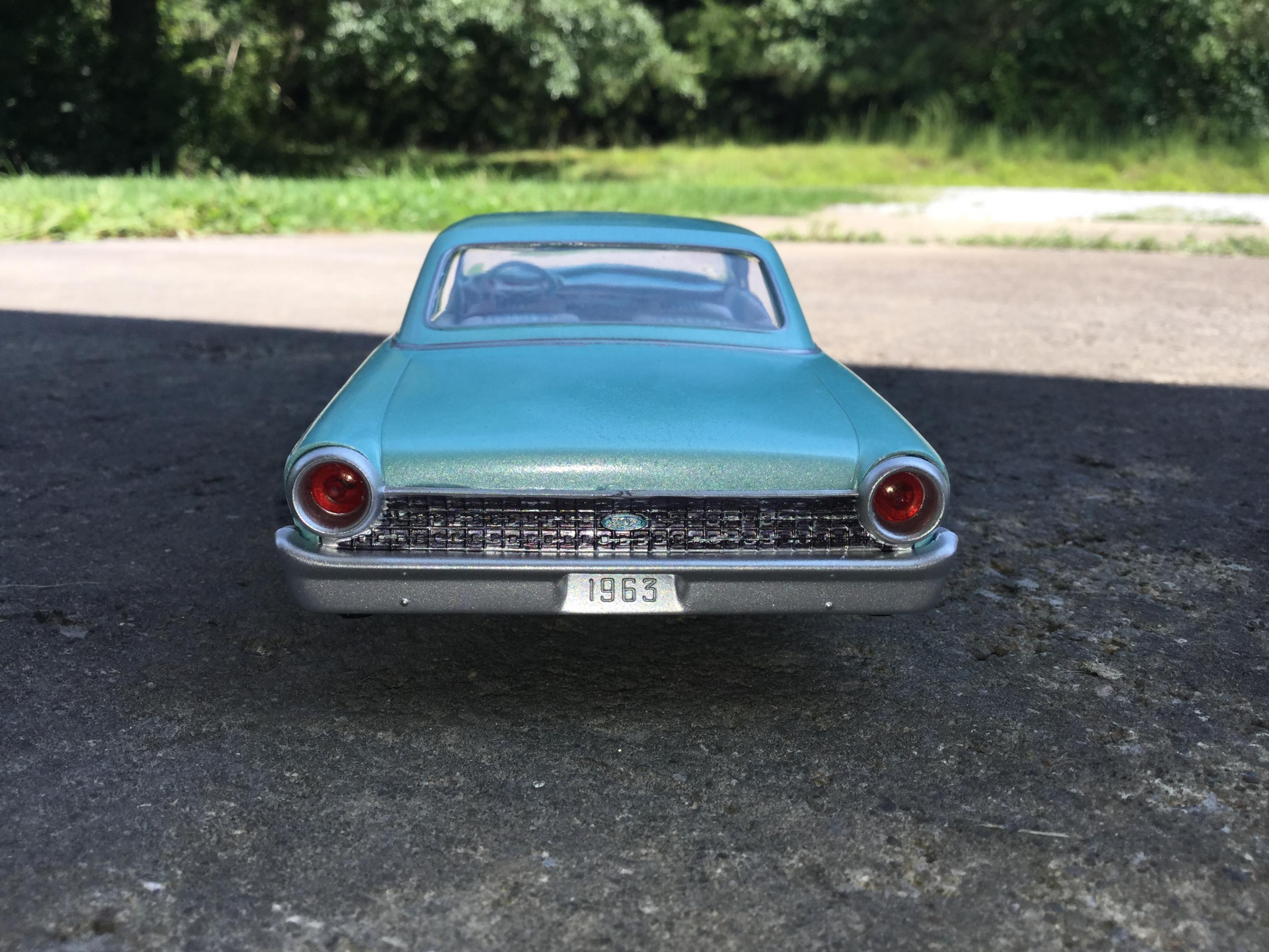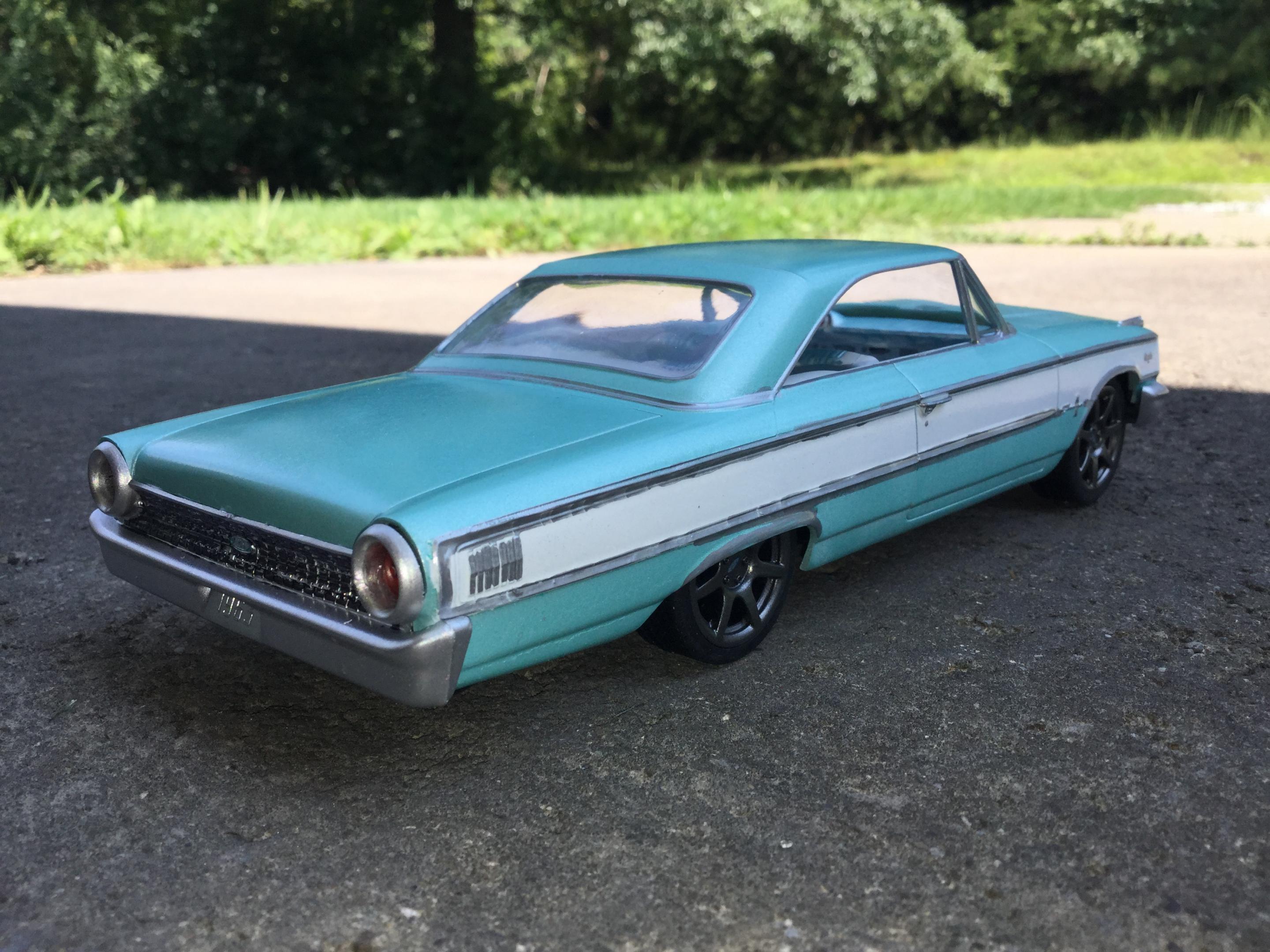 the kit was missing the wheels and tires and the engine and i did not have any early 60's ford rims or engines only muscle car rims/mopar rims and late 60's and mid 70's ford bid blocks i used these set of modern ford rims and tires and i curbsided it i painted the body rust-oleum universal sea mist with a rust-oleum 2x blossom white side stripes i painted the interior white and hand painted the accents folk art acrylic metallic ice blue with a paint brush