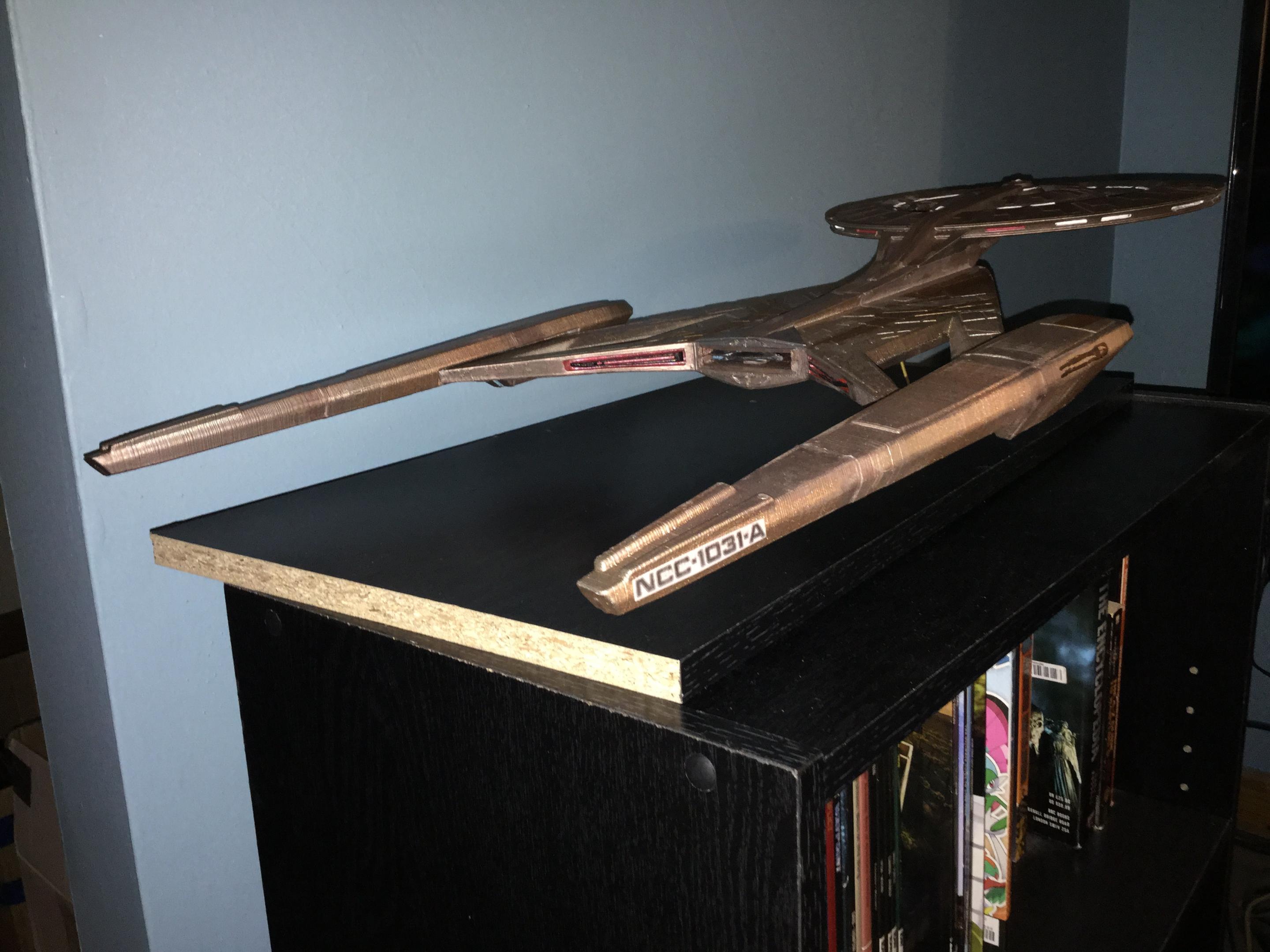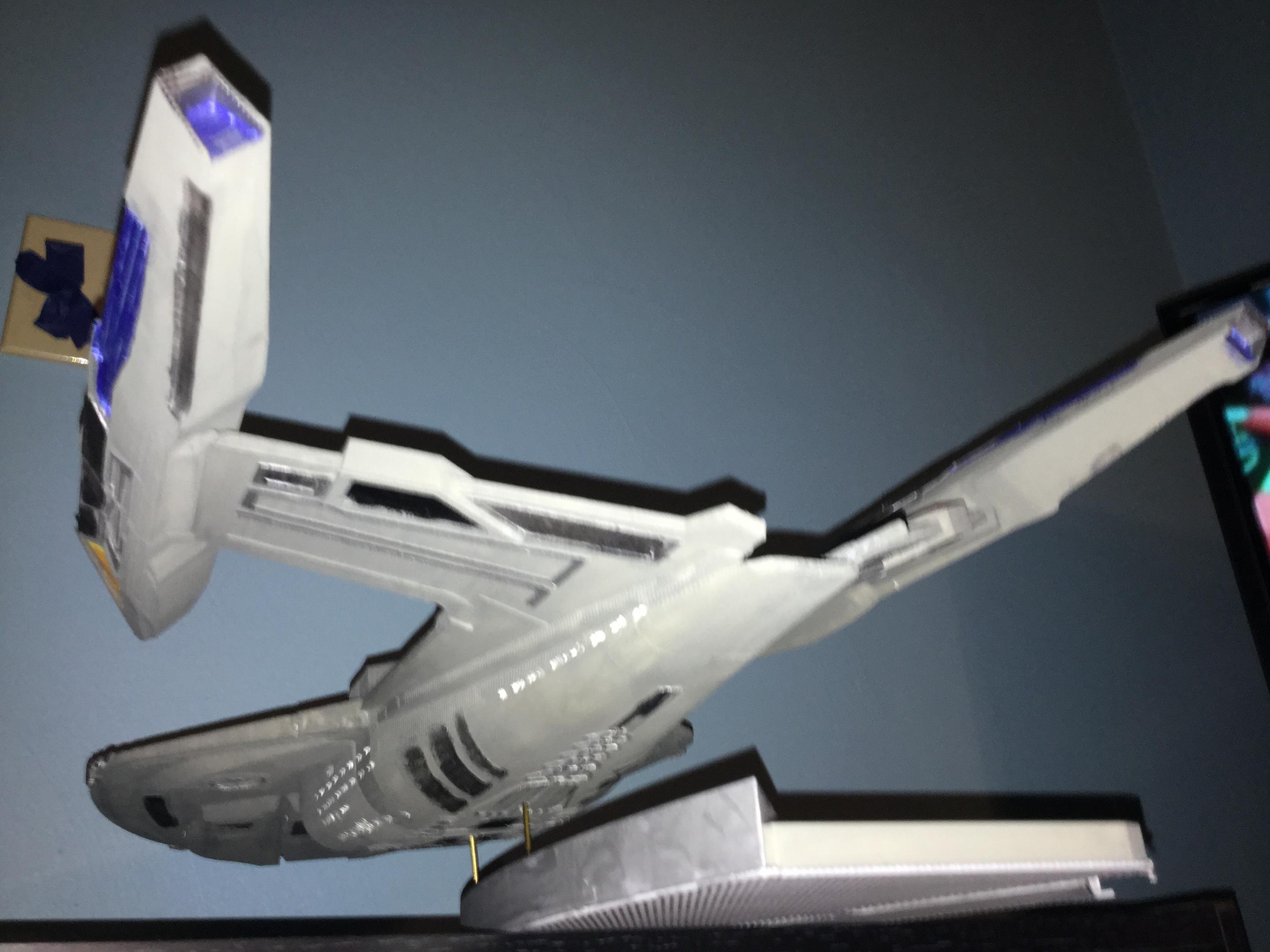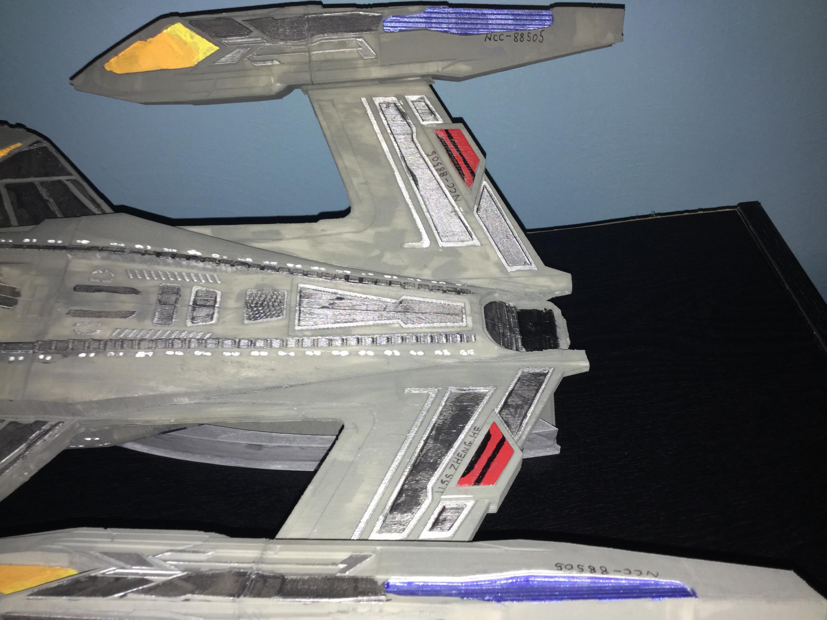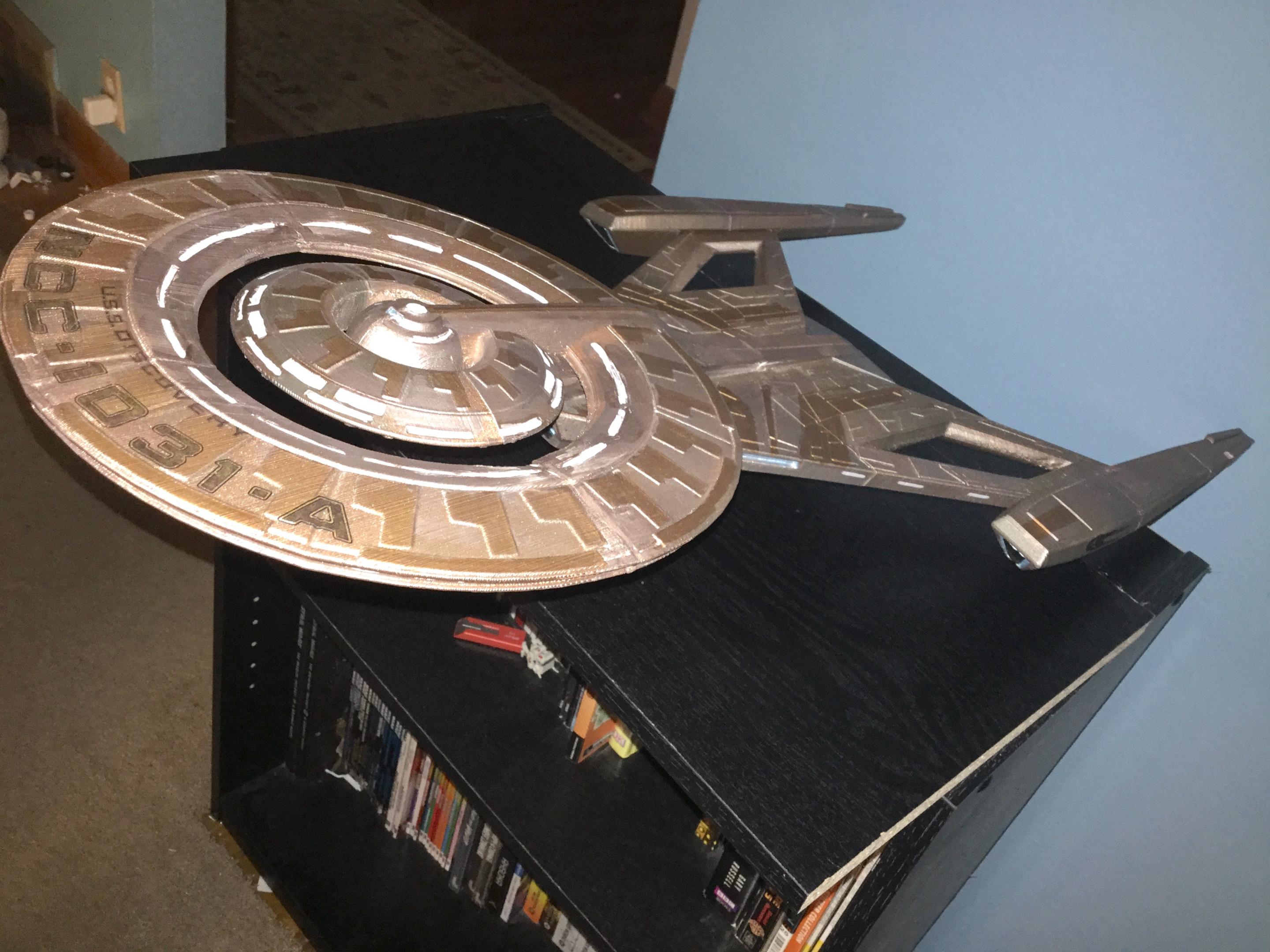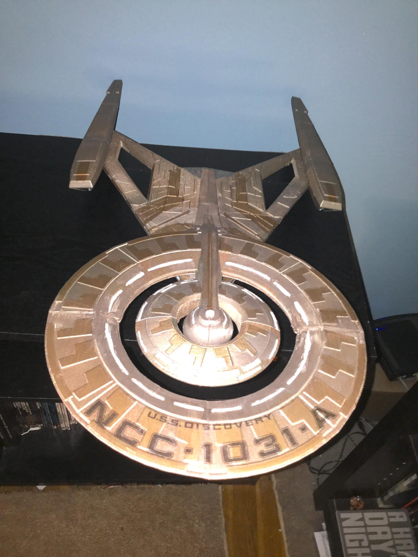 this is a 30 inch long 3d printed kit of the 32nd century refit of the uss discovery ncc-1031 in the year 3188 the ship recived a major refit to it's exterior hull with programable matter and interior systems to bring this 23rd century starship in line with the current tech of holographic and programable matter computer control interfaces instead of the 23rd century computer interface tech of tactile touch screens and buttons